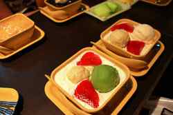 Fusion items include crepe or pancake-like bits but with essentially Asian ingredients, such as durian filling.