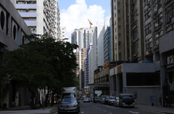 On the other side of the big road is a line of industrial highrises.