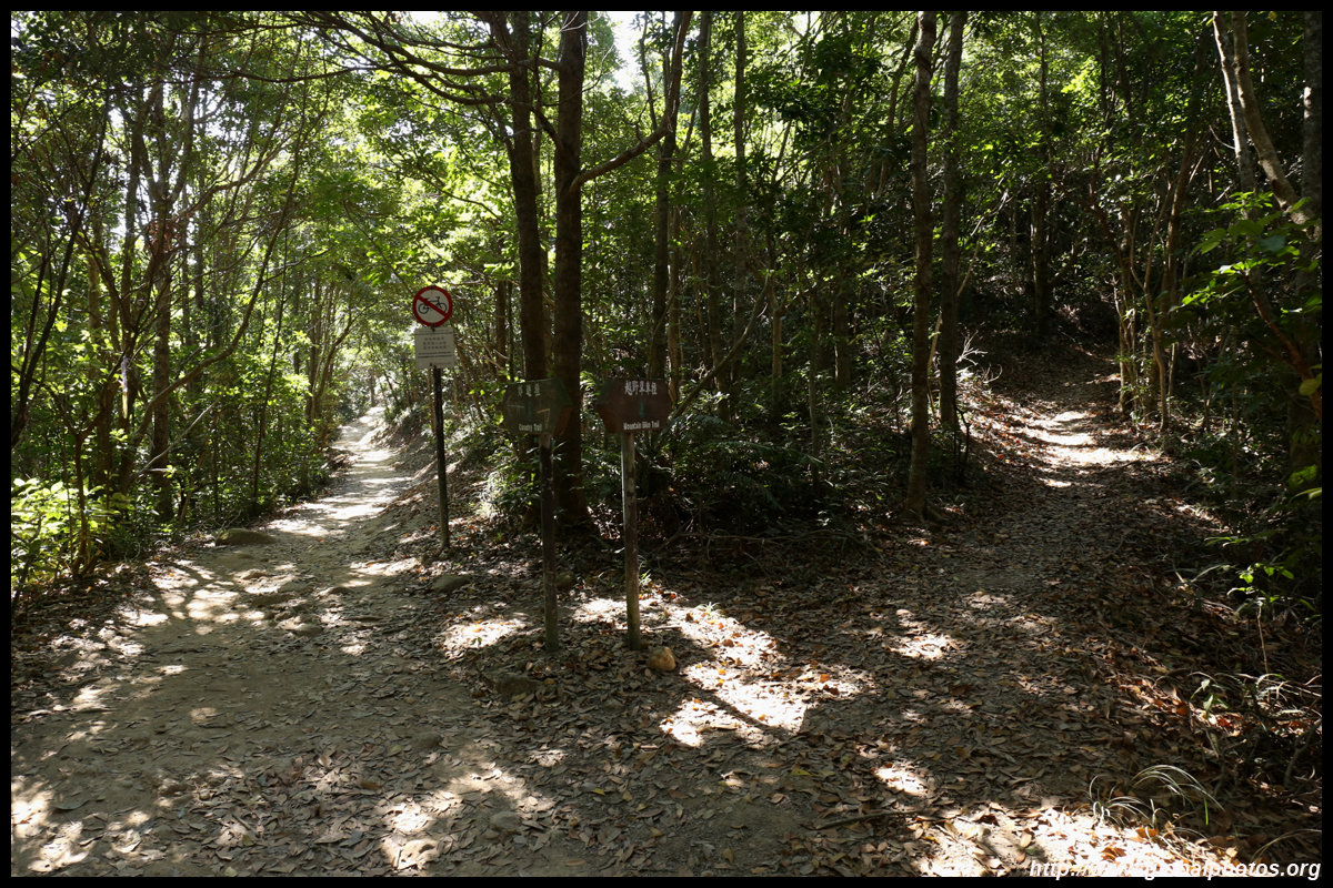 Not long after, you will come across another fairly hidden path on your right next to a small pool, which heads downhill to LOHAS Park in Tseung Kwan O. If heading to Clear Water Bay Road, keep going ahead for a few more minutes. You will come across a T-intersection further down with a hiking map and an opening with a view, an unofficial rest area to the right. For the buses, turn left and head downhill.