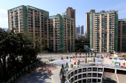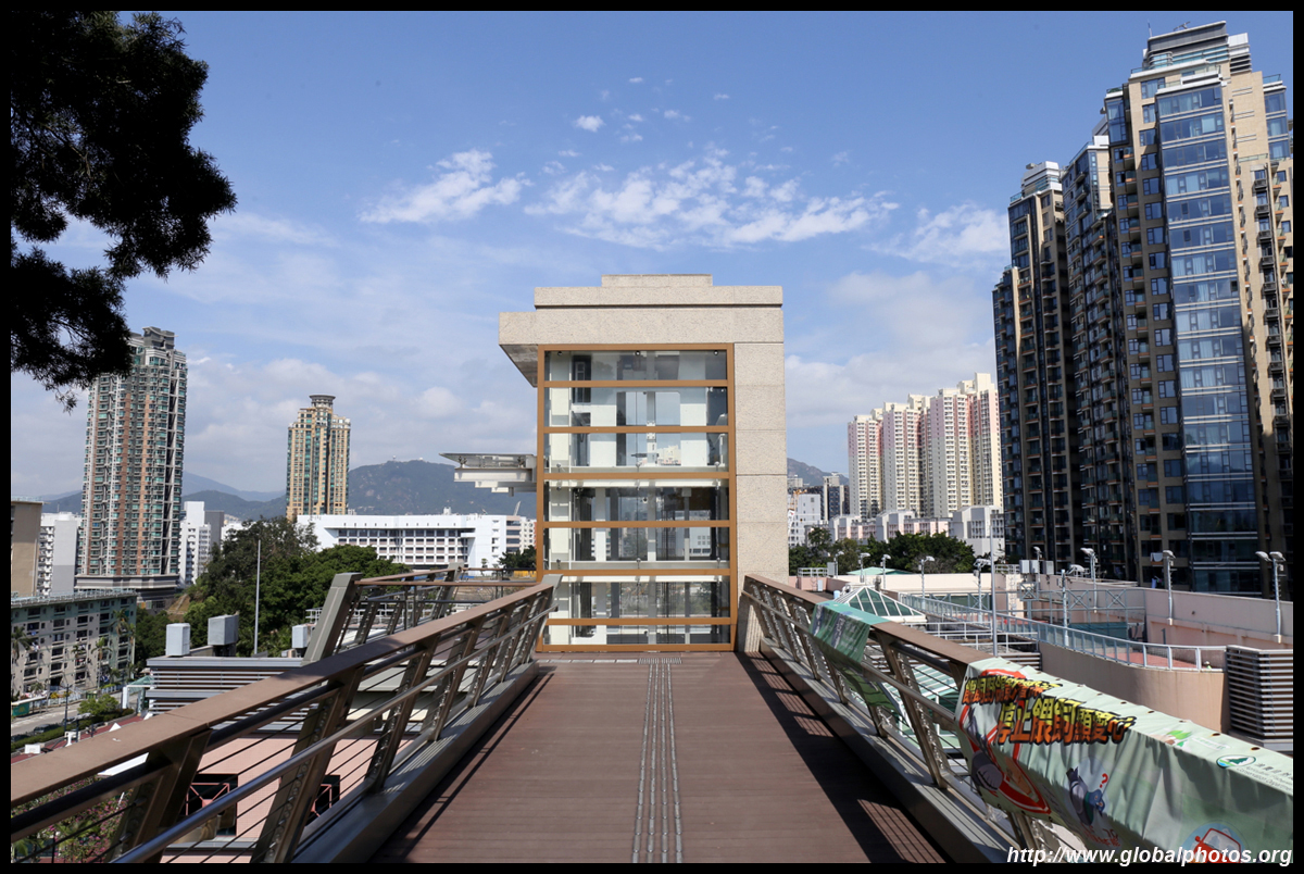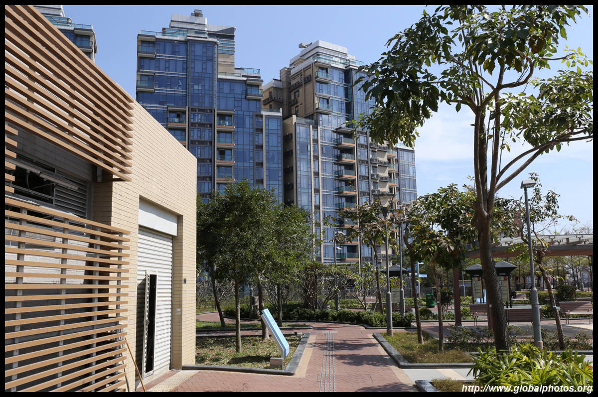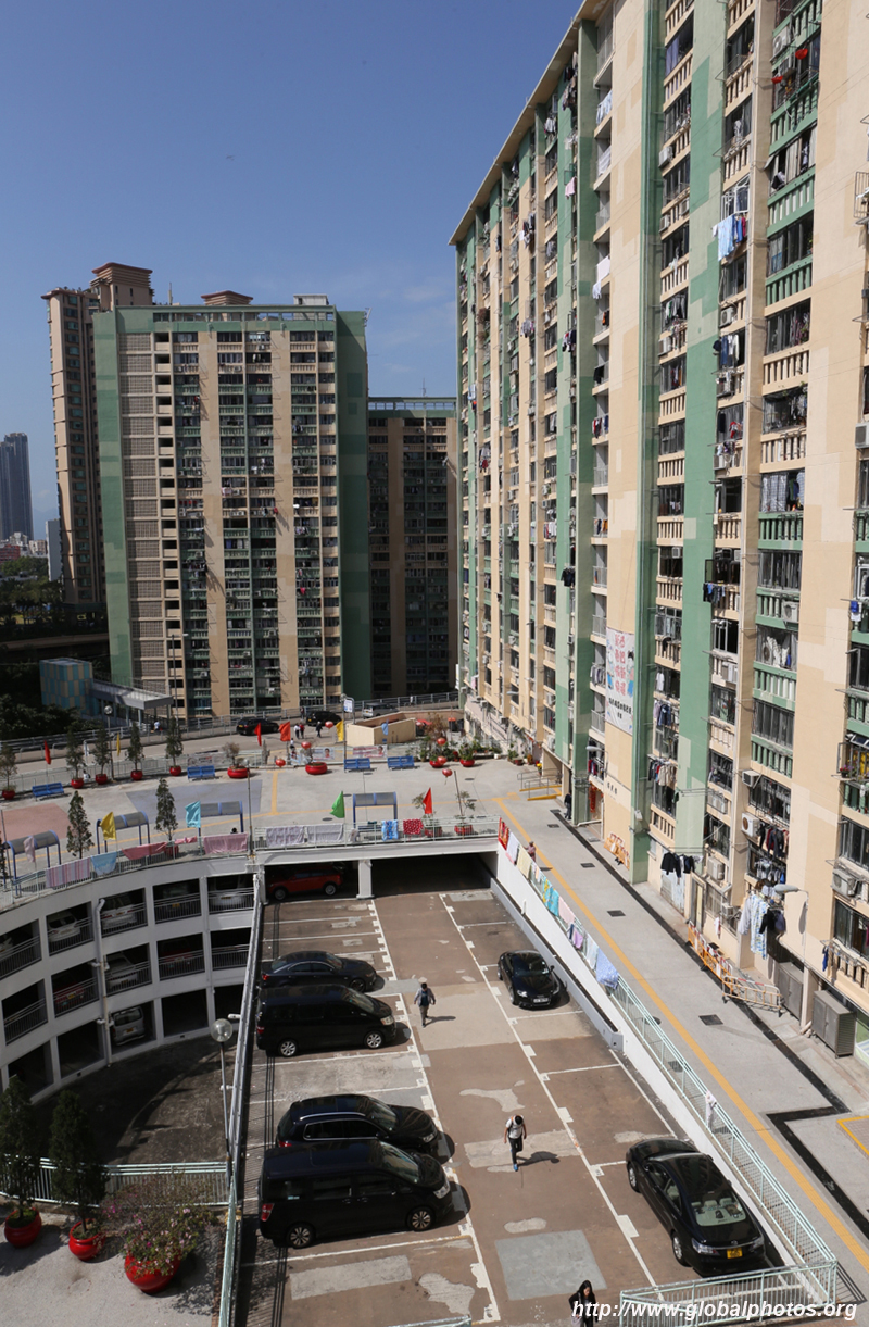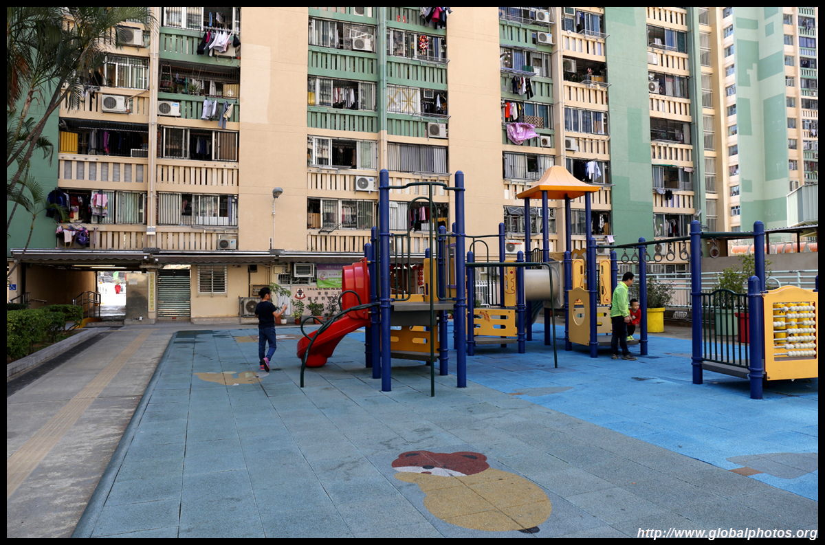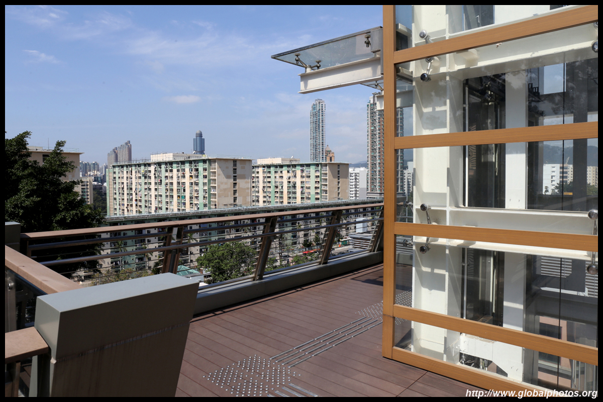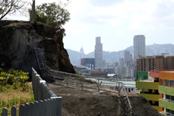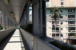 Elevators whisk visitors easily to a park further uphill. On one side are the public housing towers, and on the other is a luxury estate.
