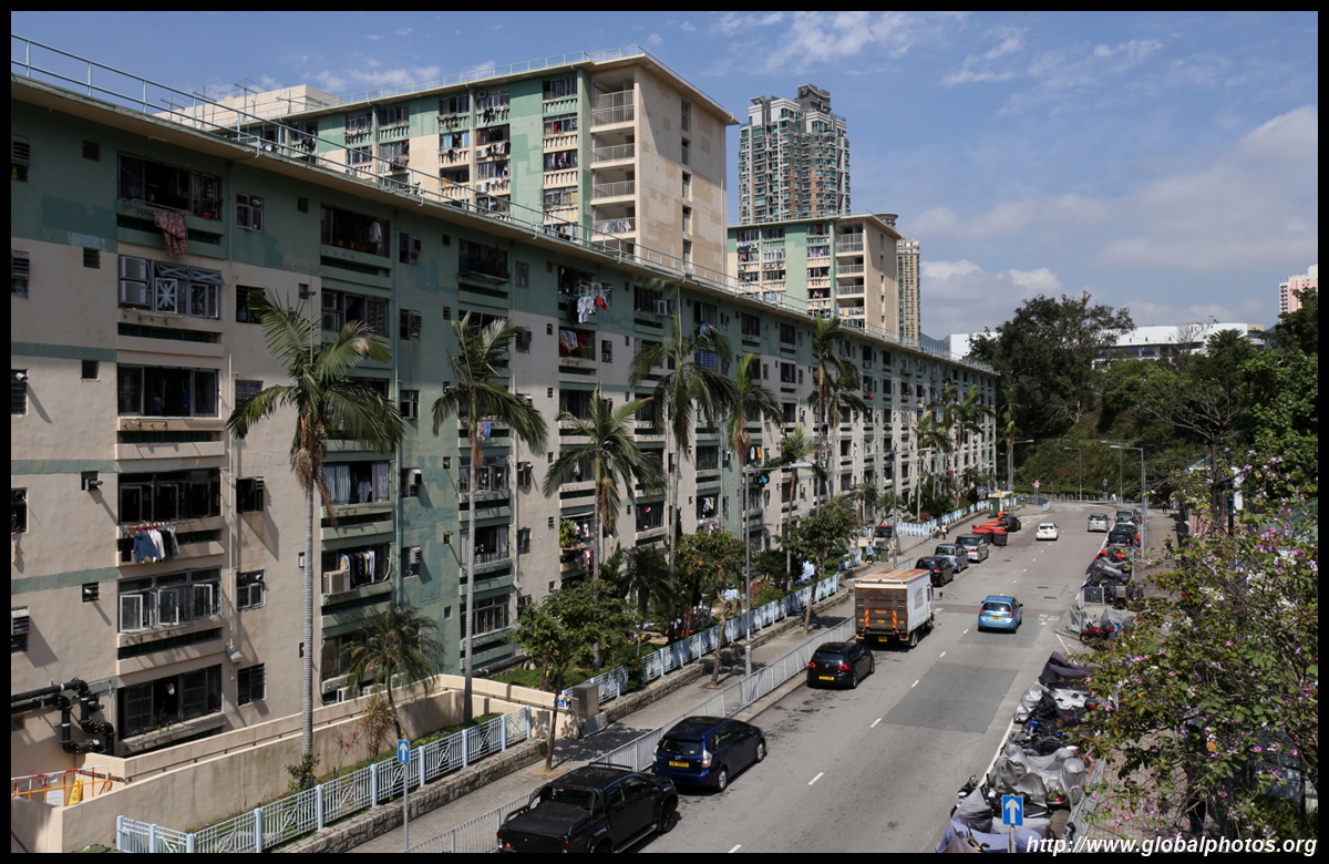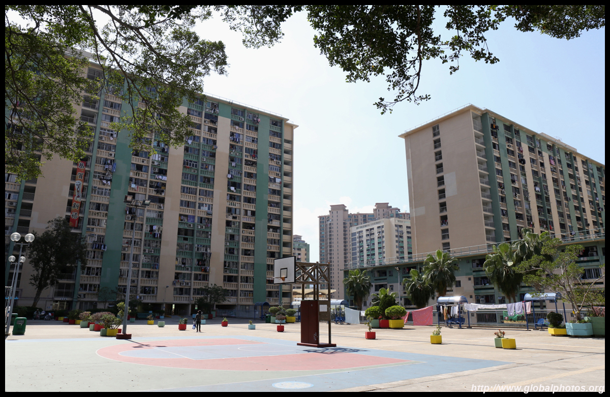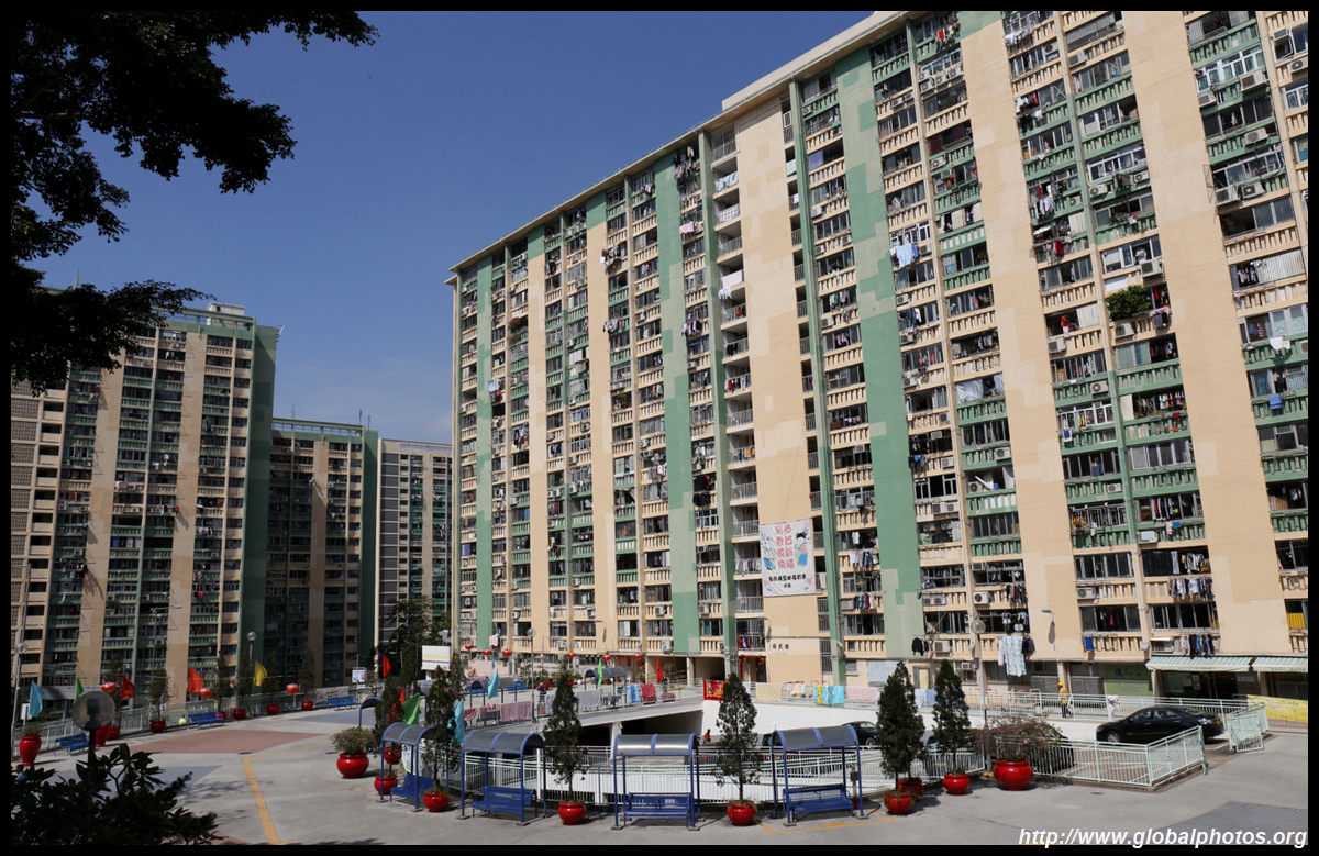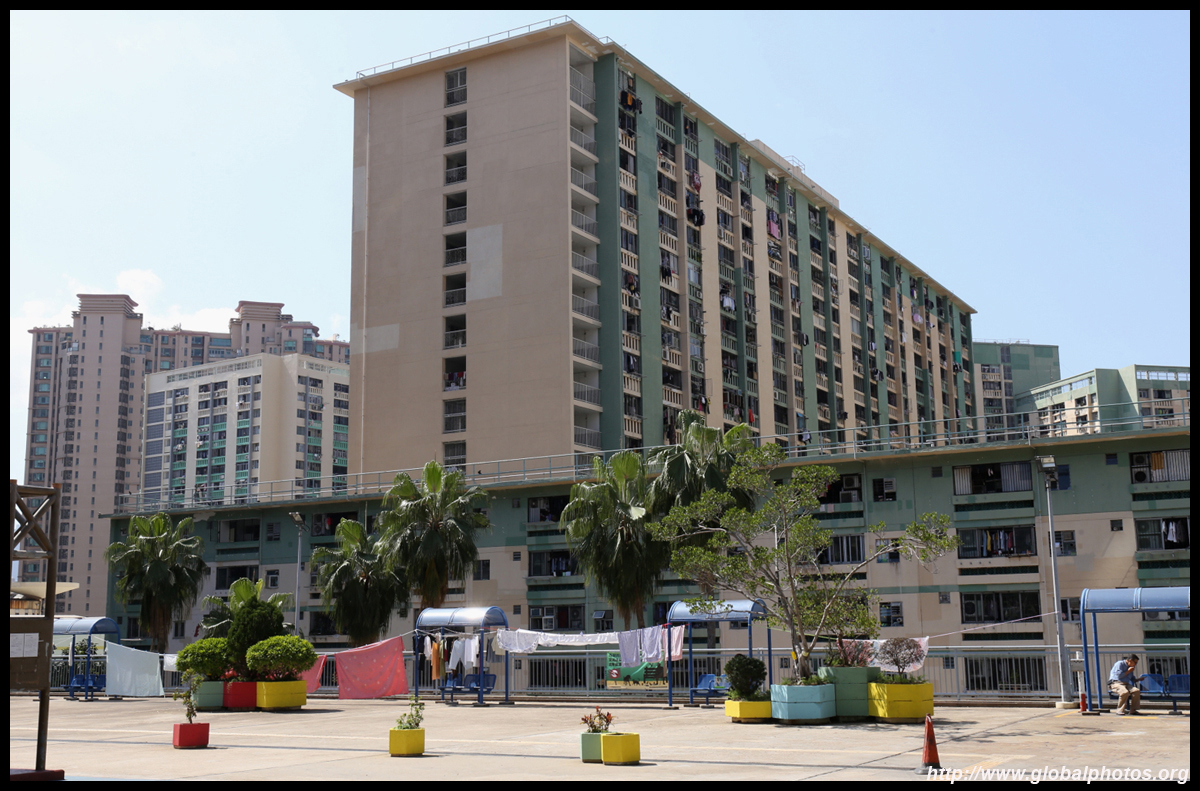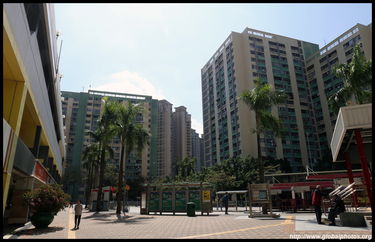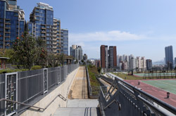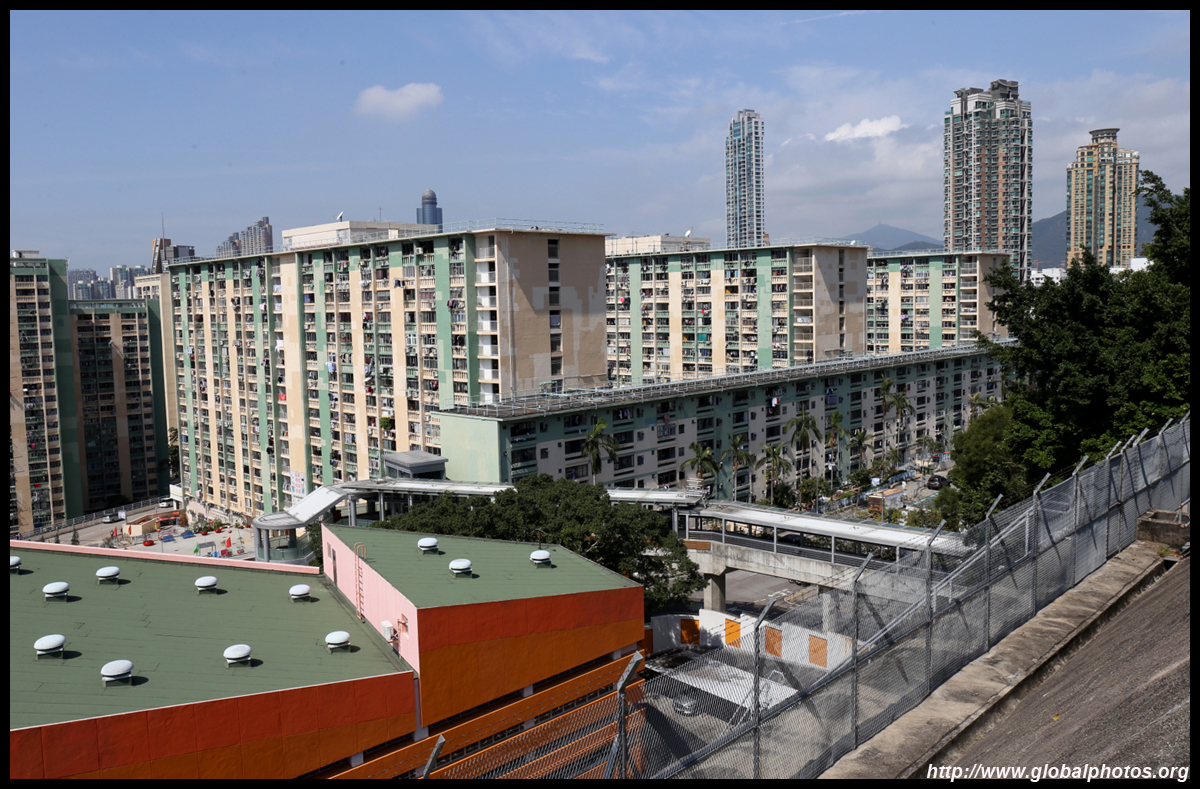 Elevators whisk visitors easily to a park further uphill. On one side are the public housing towers, and on the other is a luxury estate.