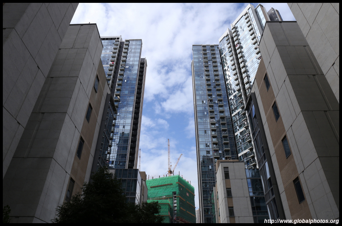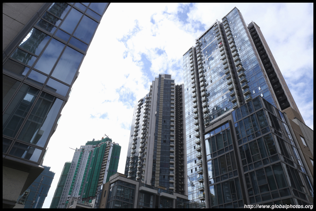 From the southeast corner, the view towards the north consists of Monaco under scaffolding in the far left, Vibe Centro, K.City, and Victoria Skye on the far right.