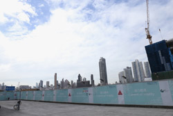 A river divides this section from another area now under construction. You can see more towers rising in the background.