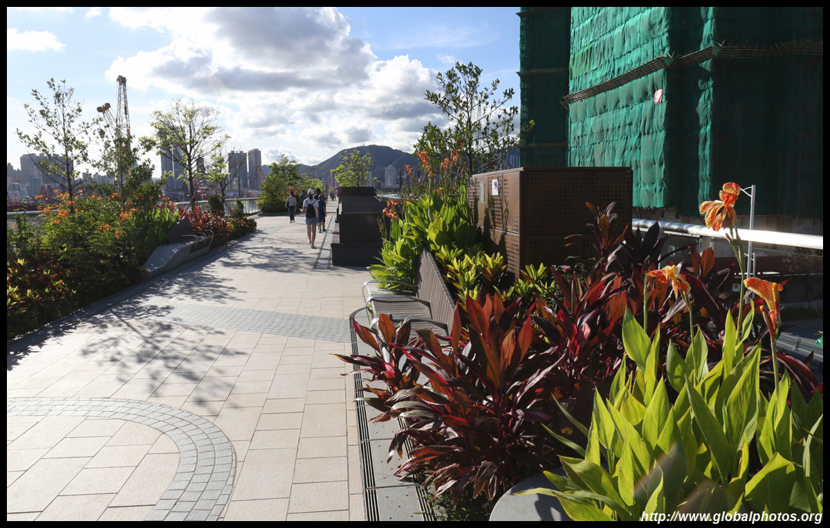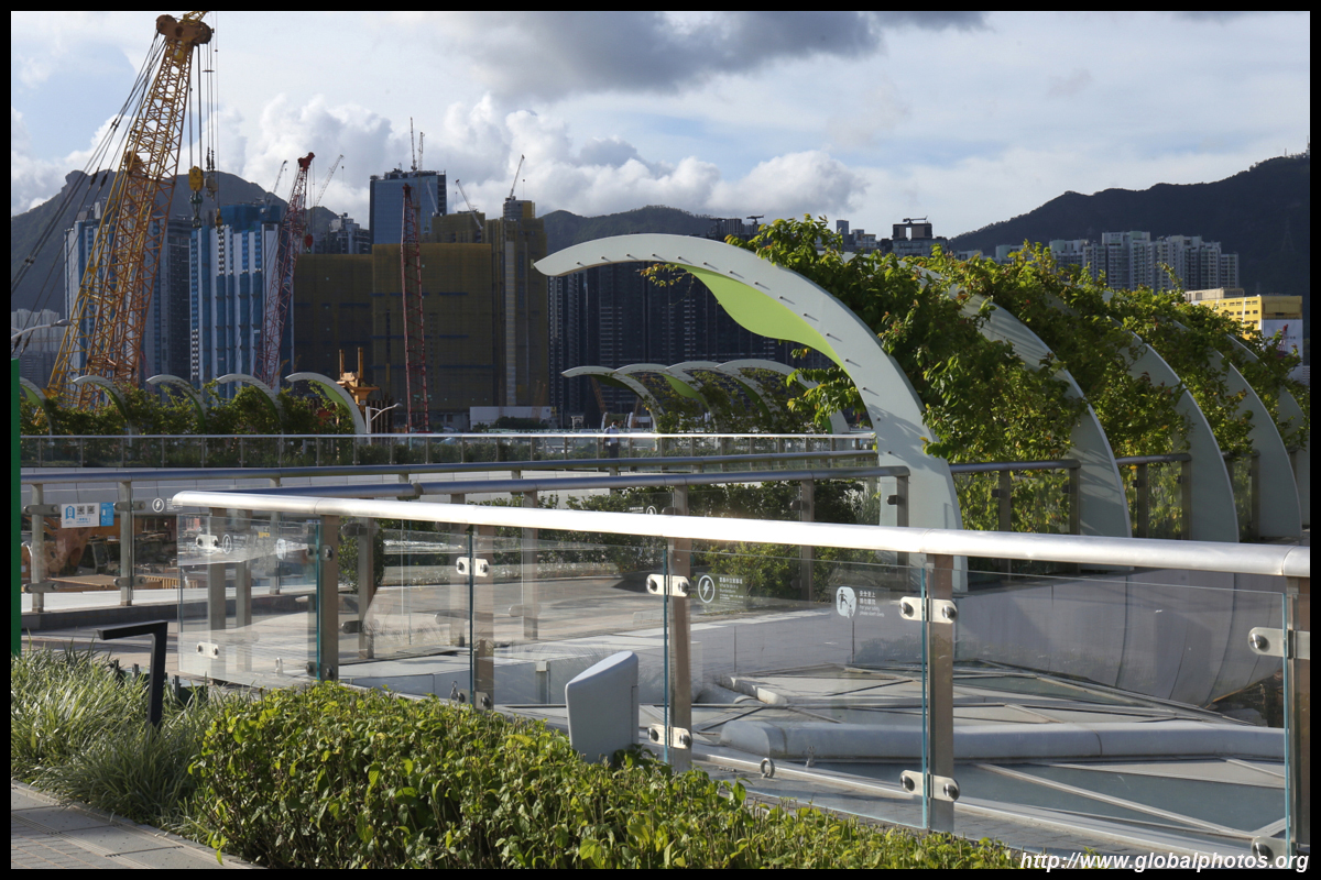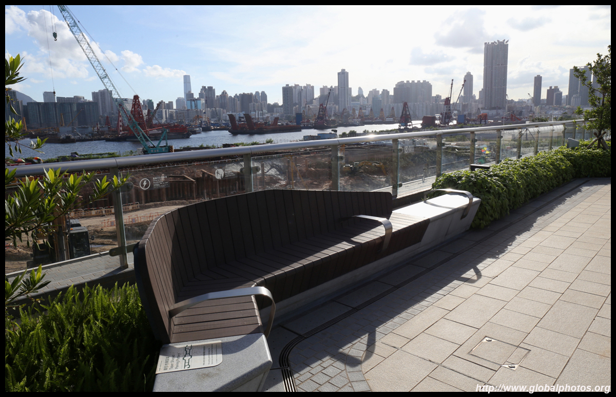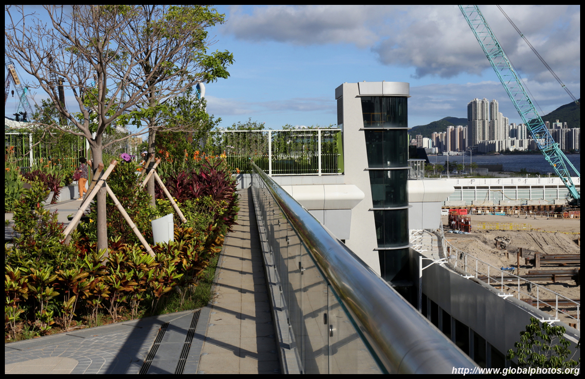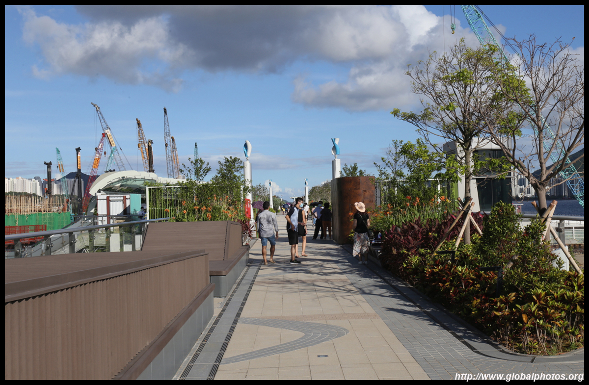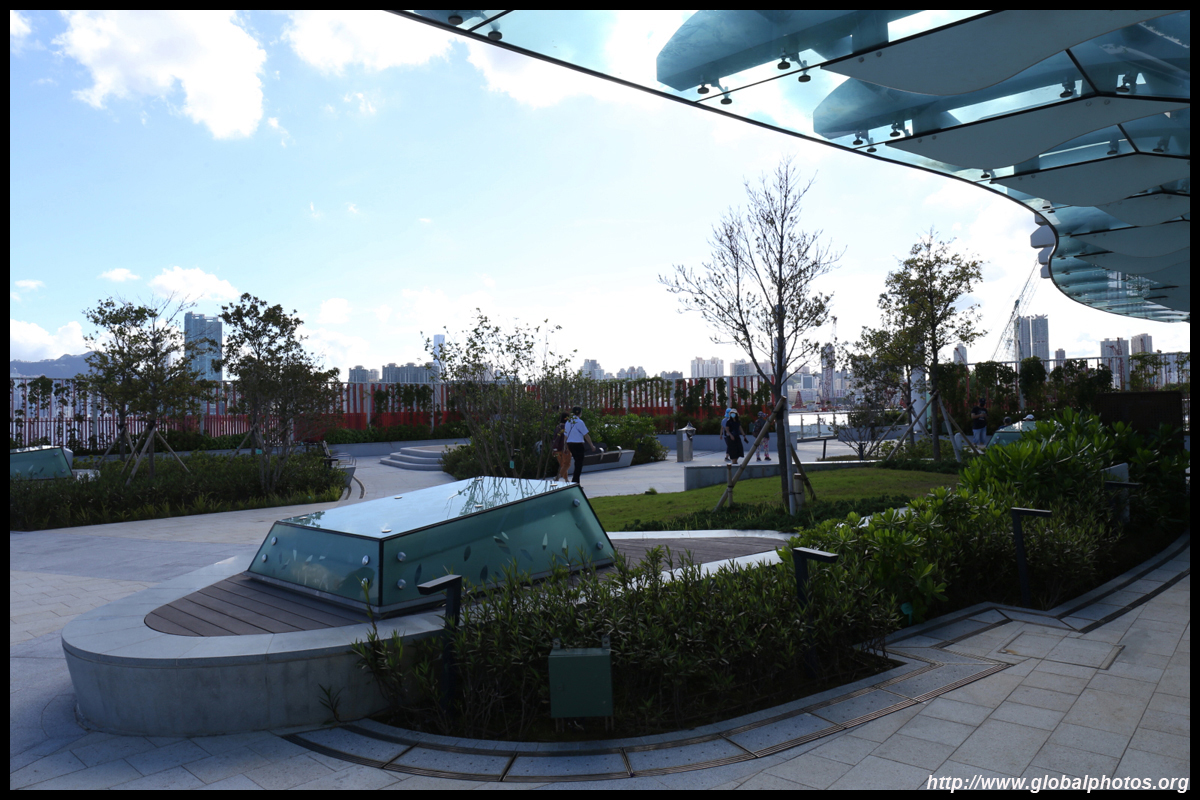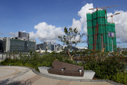 Located on an elevated deck above the main access road along the former Kai Tak runway 13/31, the 1.4km aviation-themed park opened in May 2021 with water features, vegetation, and rest benches with views. It is surrounded by many construction sites so perhaps one day, the harbour and skyline views will disappear behind walls of buildings.
