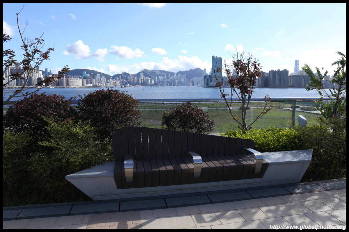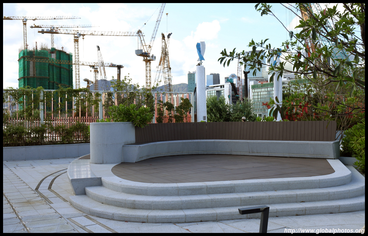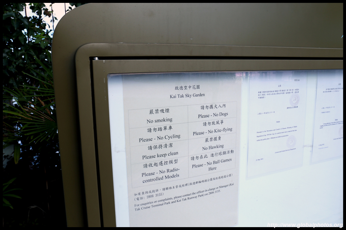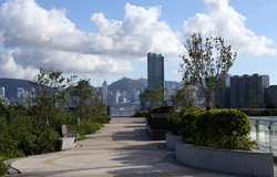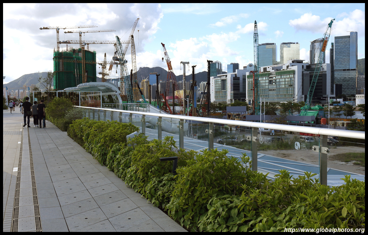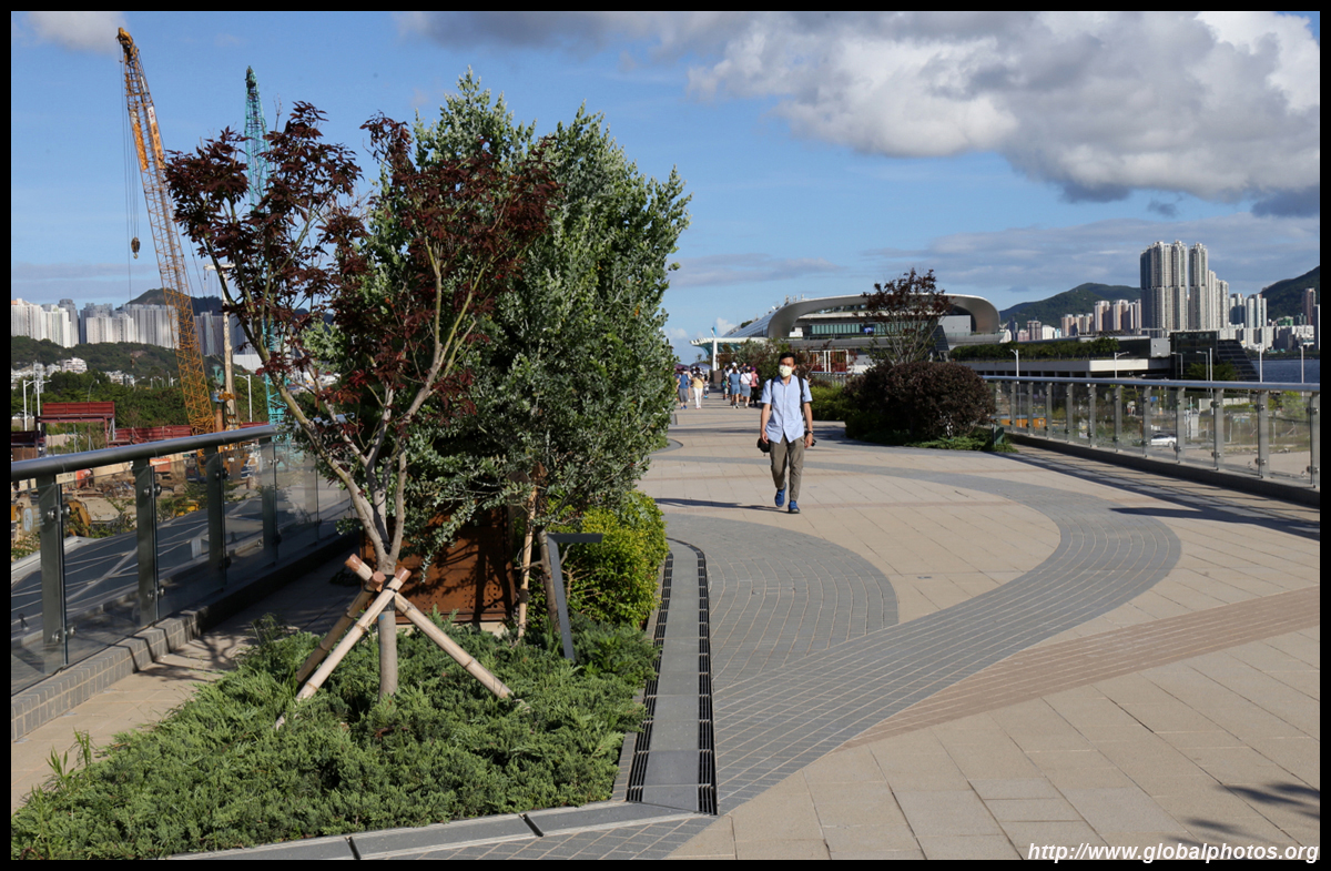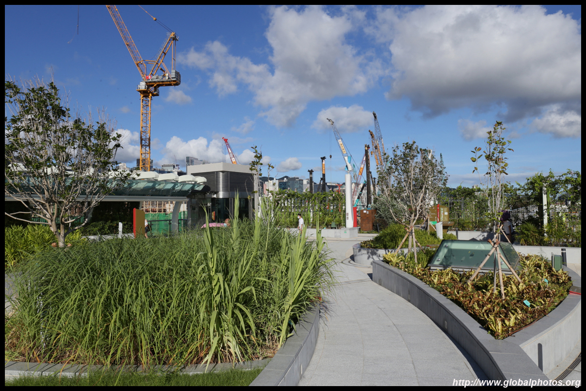 Located on an elevated deck above the main access road along the former Kai Tak runway 13/31, the 1.4km aviation-themed park opened in May 2021 with water features, vegetation, and rest benches with views. It is surrounded by many construction sites so perhaps one day, the harbour and skyline views will disappear behind walls of buildings.