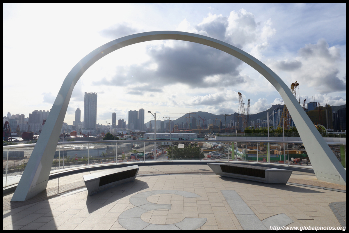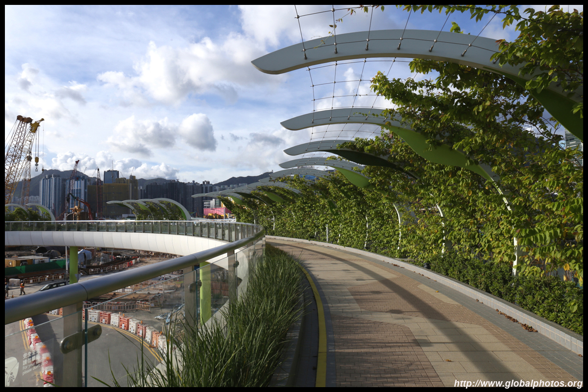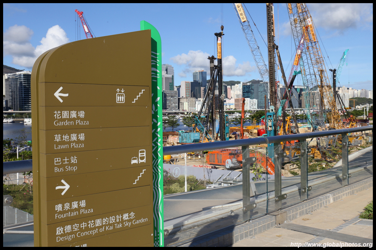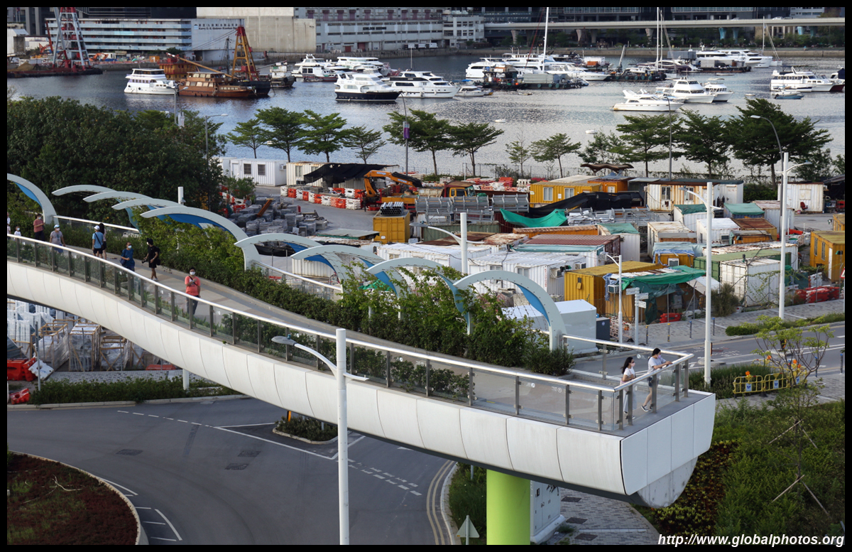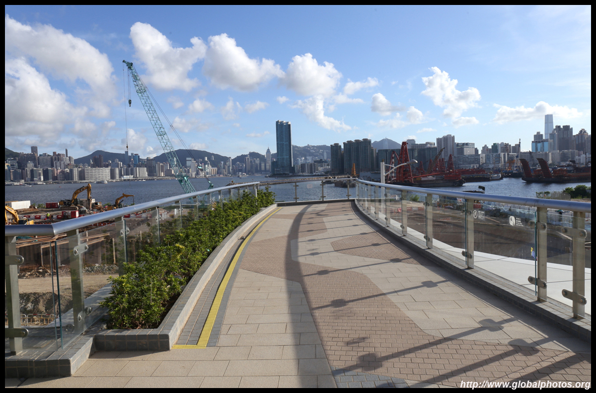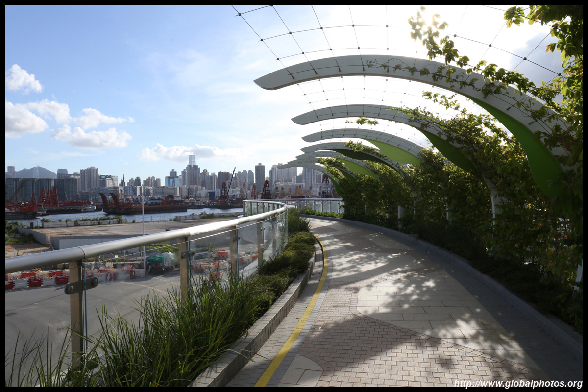 Located on an elevated deck above the main access road along the former Kai Tak runway 13/31, the 1.4km aviation-themed park opened in May 2021 with water features, vegetation, and rest benches with views. It is surrounded by many construction sites so perhaps one day, the harbour and skyline views will disappear behind walls of buildings.