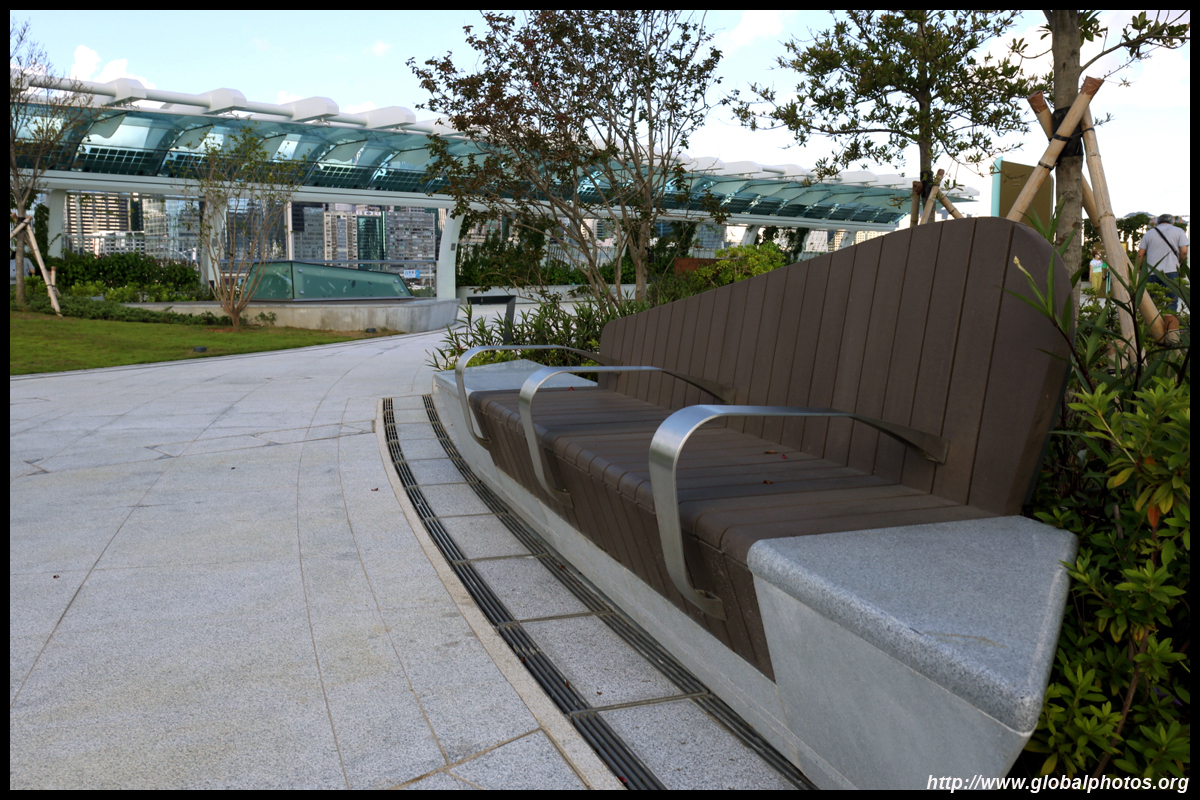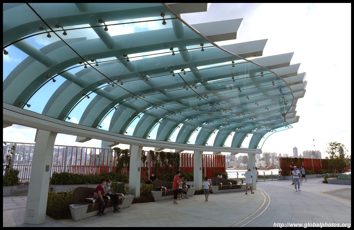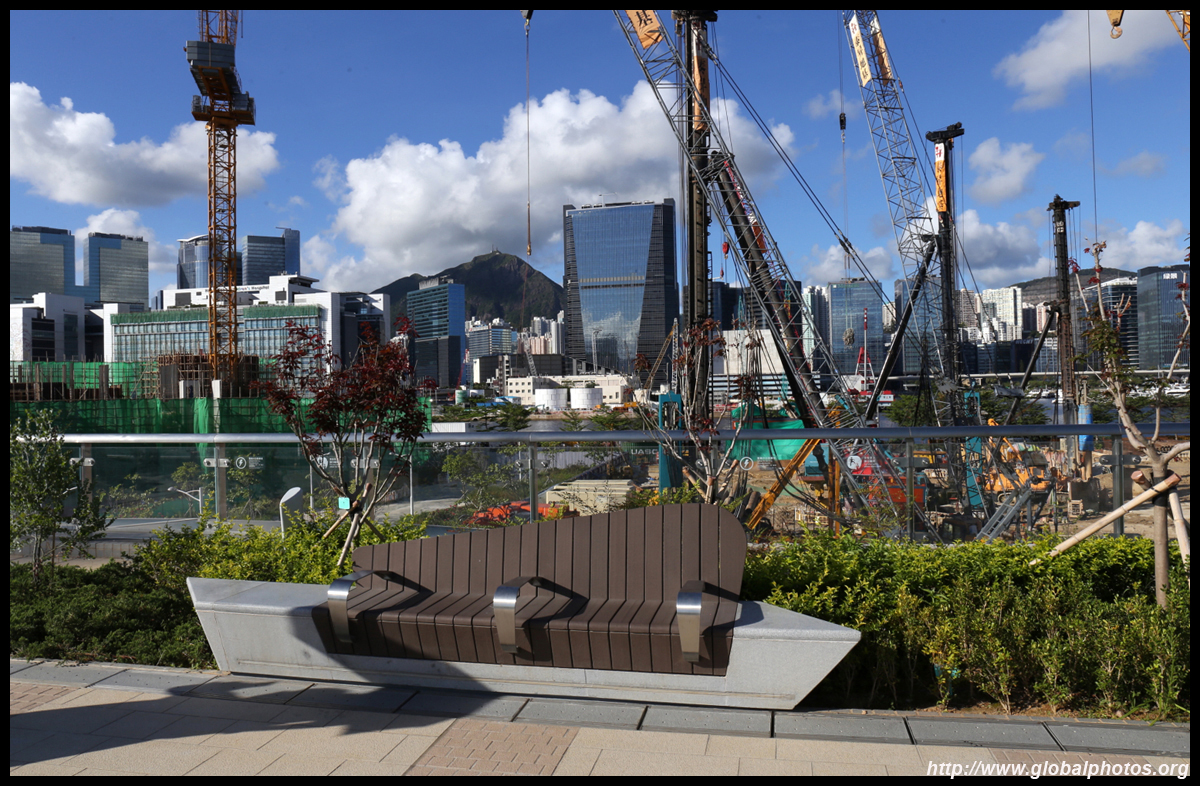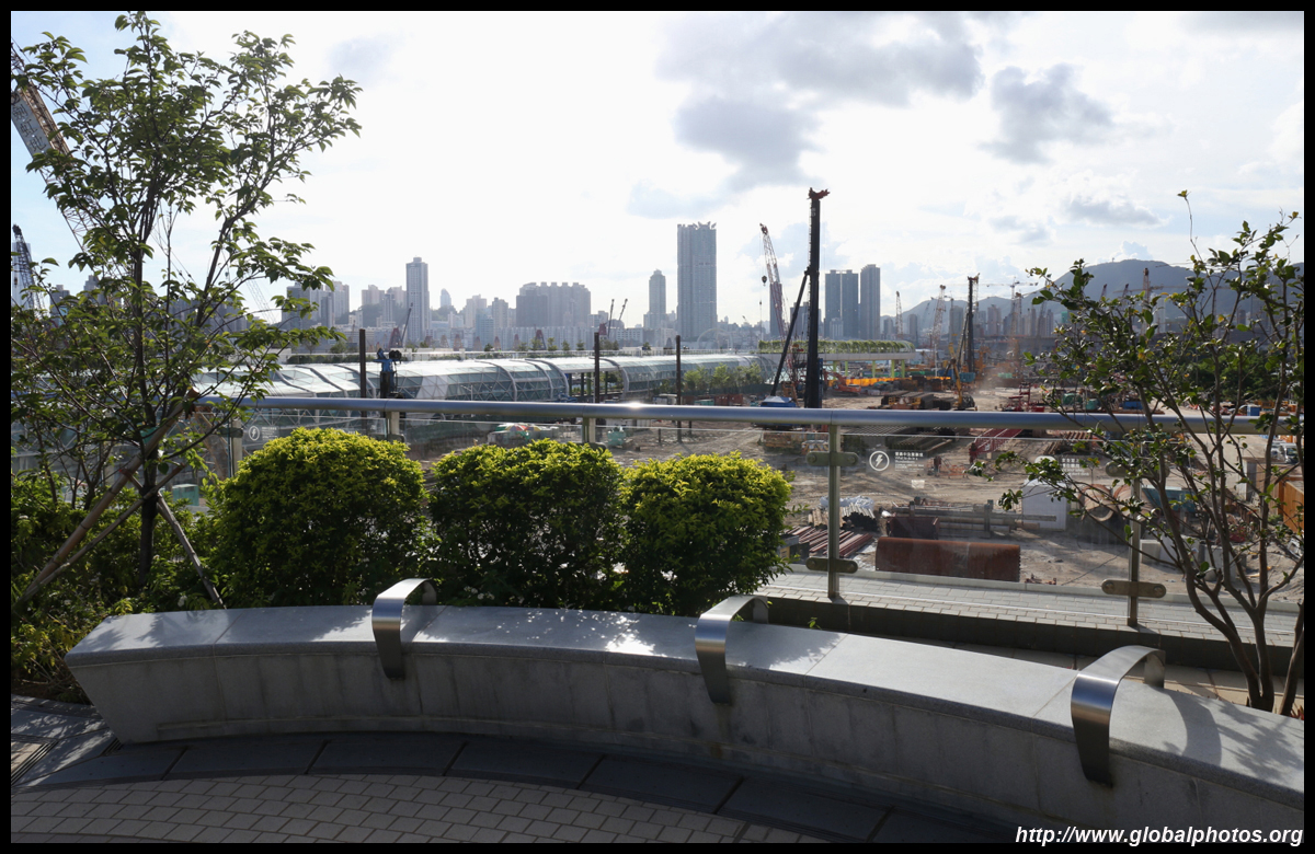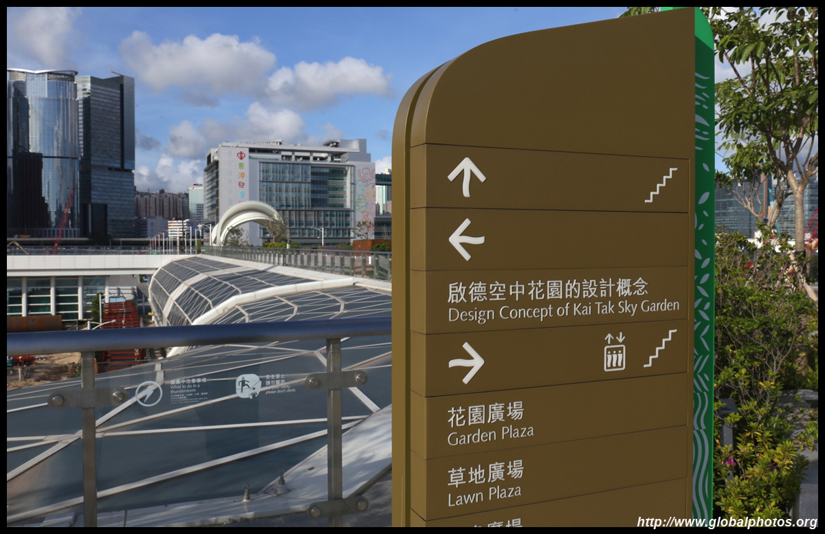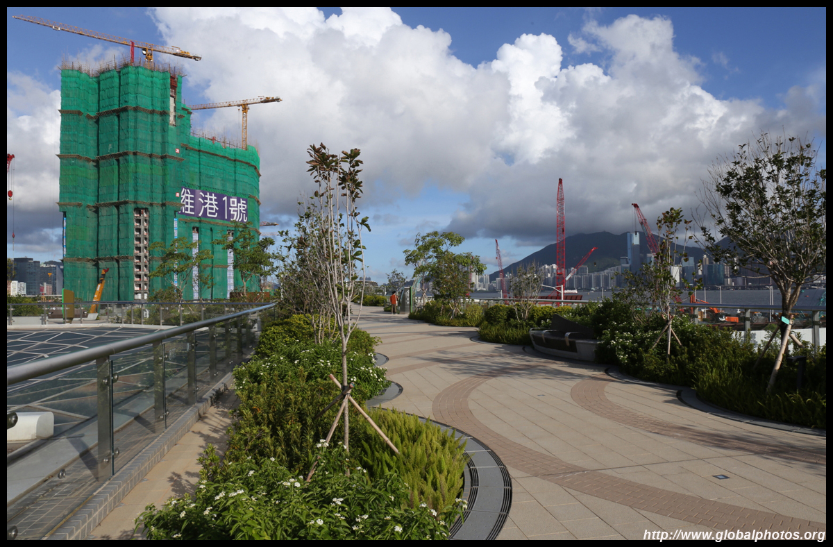 Located on an elevated deck above the main access road along the former Kai Tak runway 13/31, the 1.4km aviation-themed park opened in May 2021 with water features, vegetation, and rest benches with views. It is surrounded by many construction sites so perhaps one day, the harbour and skyline views will disappear behind walls of buildings.