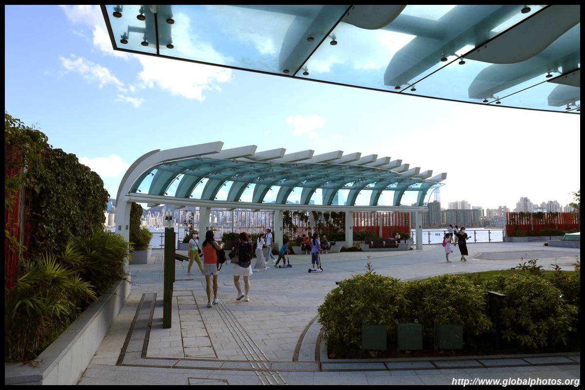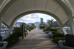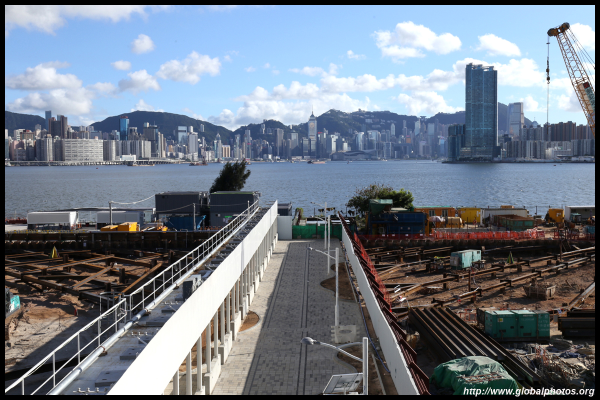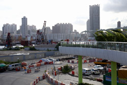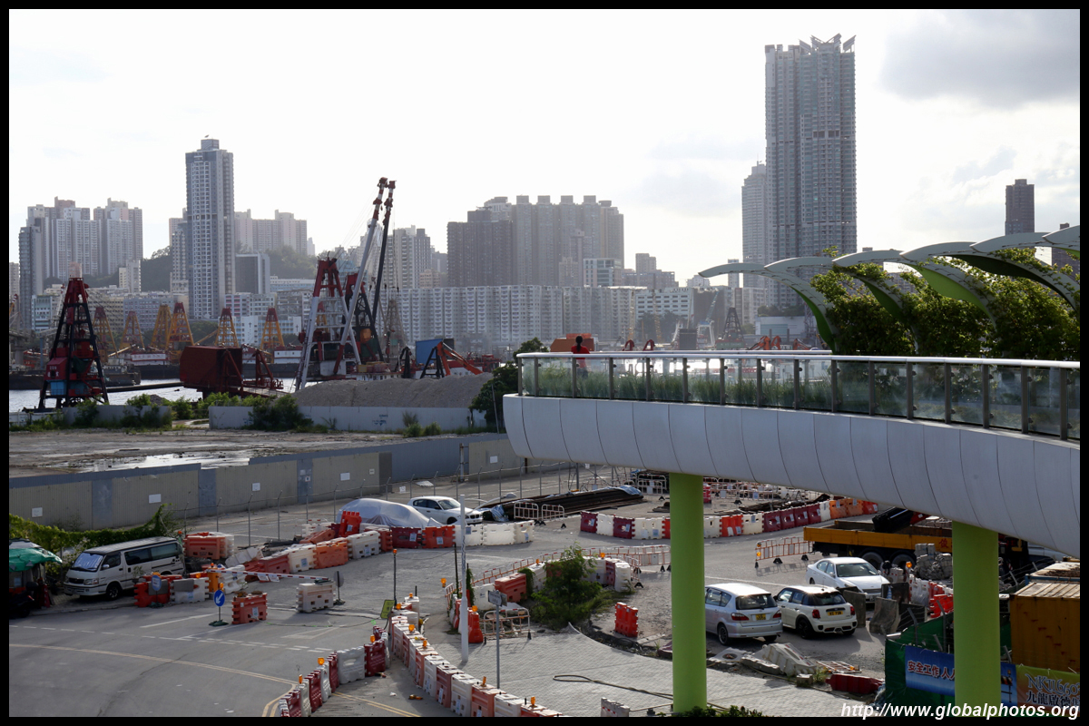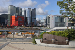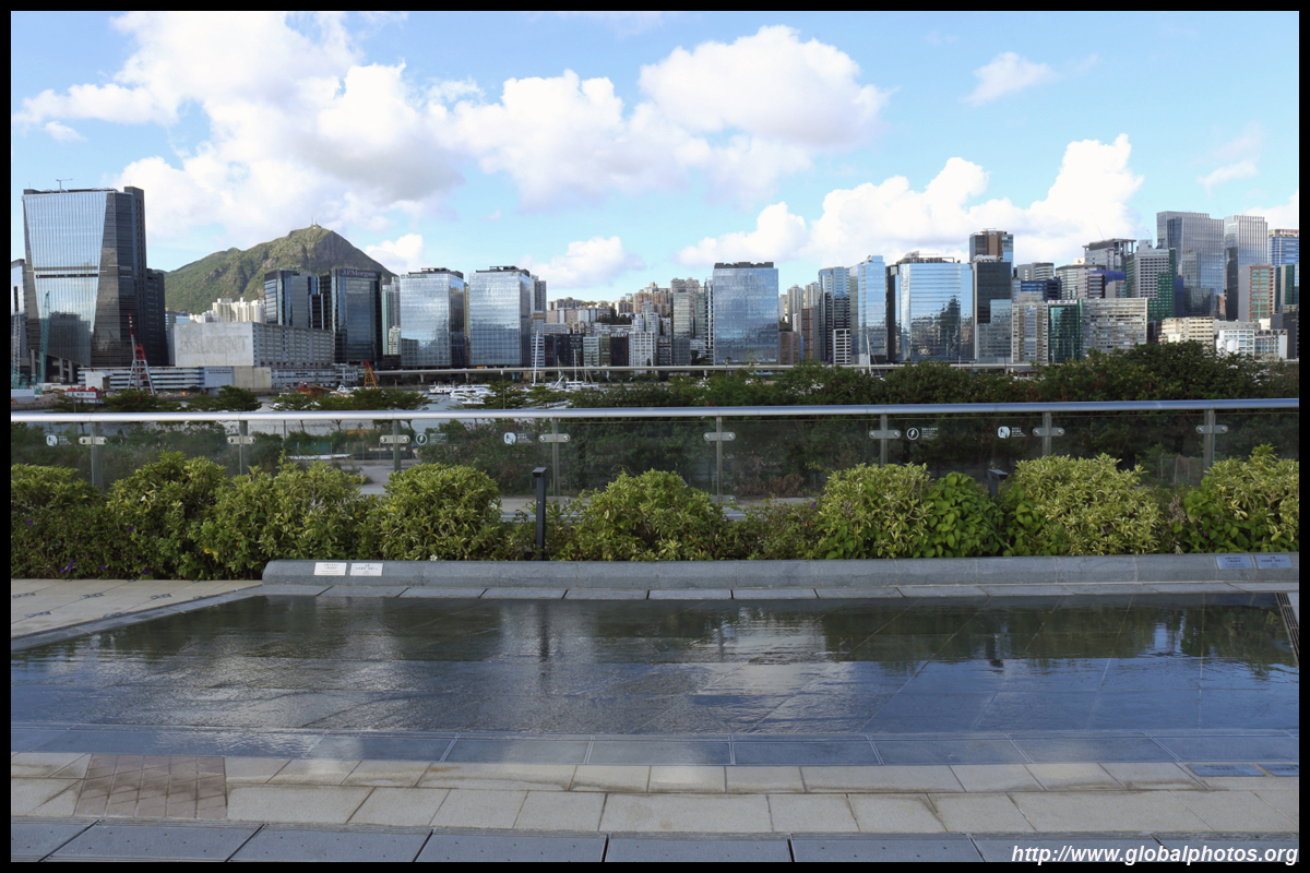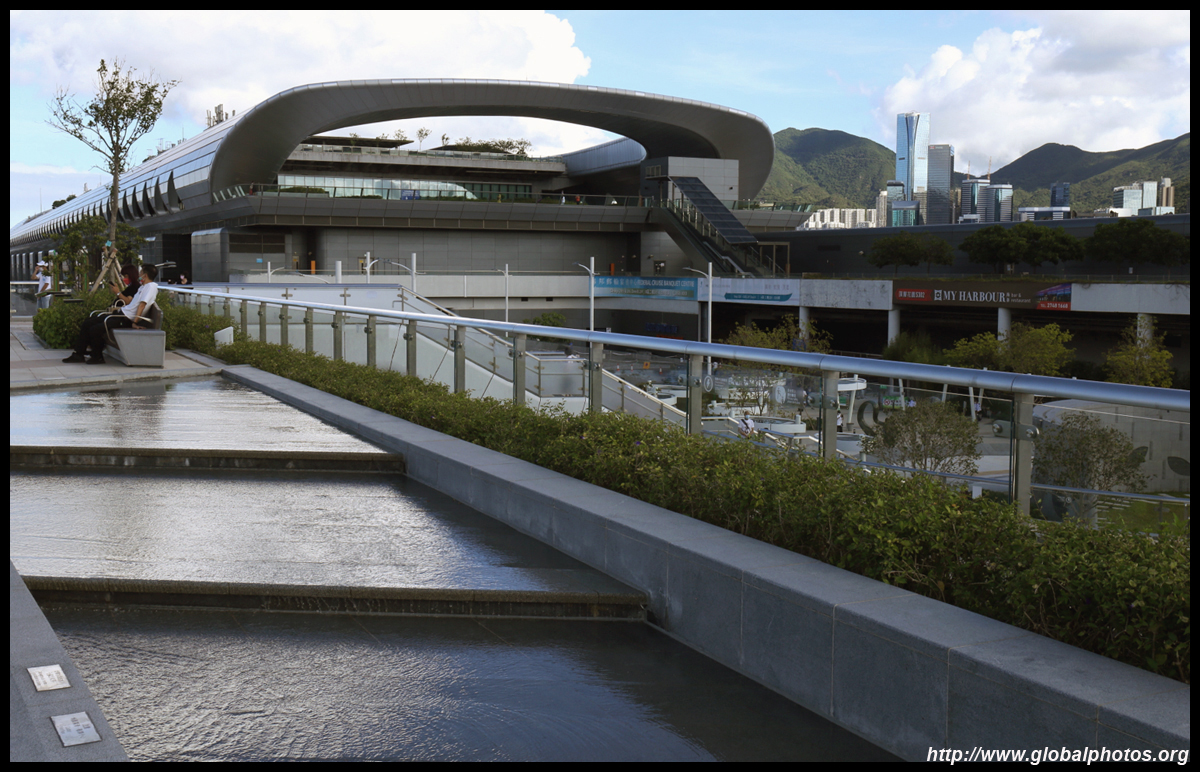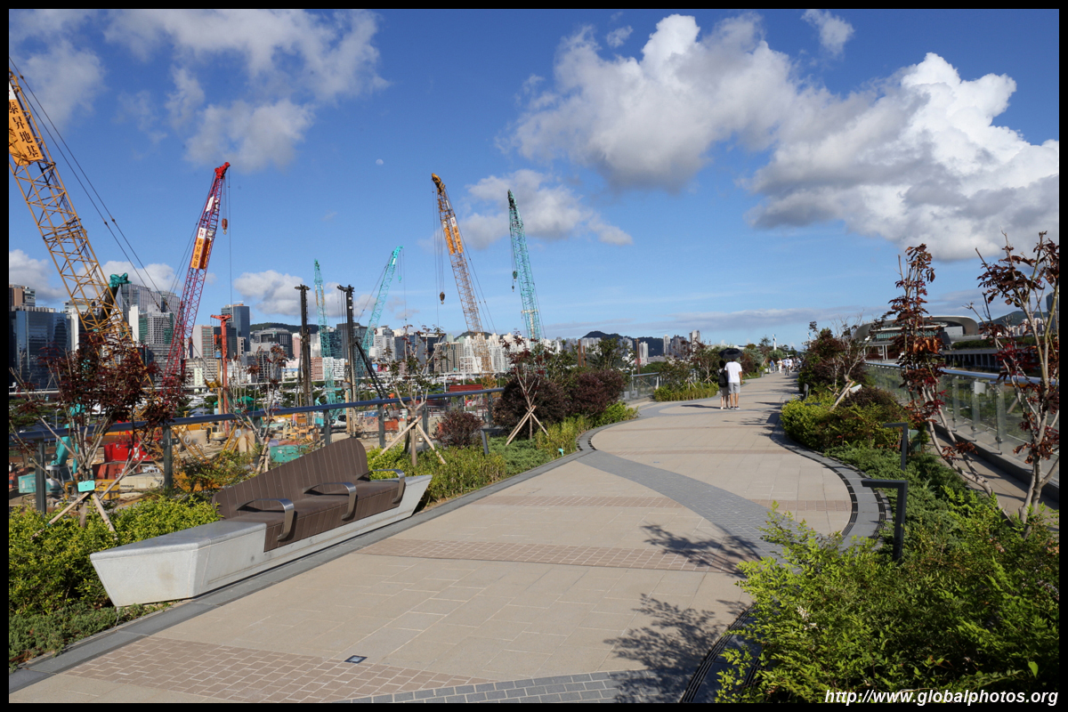 Located on an elevated deck above the main access road along the former Kai Tak runway 13/31, the 1.4km aviation-themed park opened in May 2021 with water features, vegetation, and rest benches with views. It is surrounded by many construction sites so perhaps one day, the harbour and skyline views will disappear behind walls of buildings.