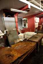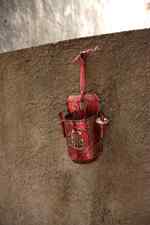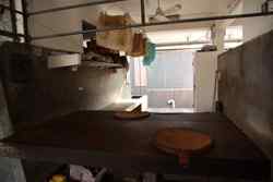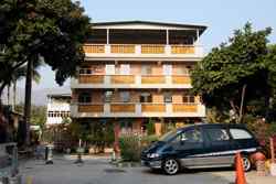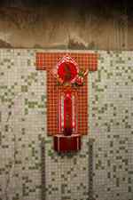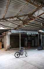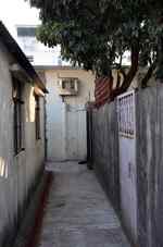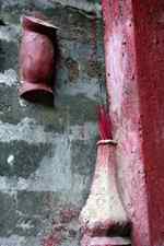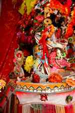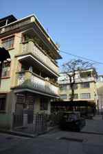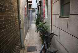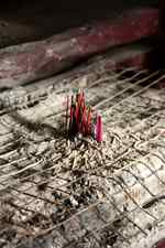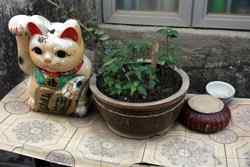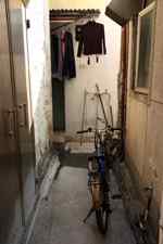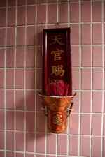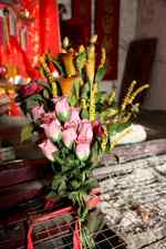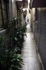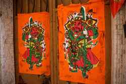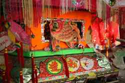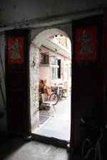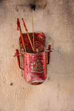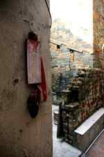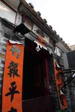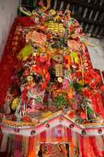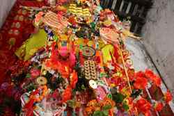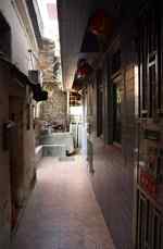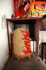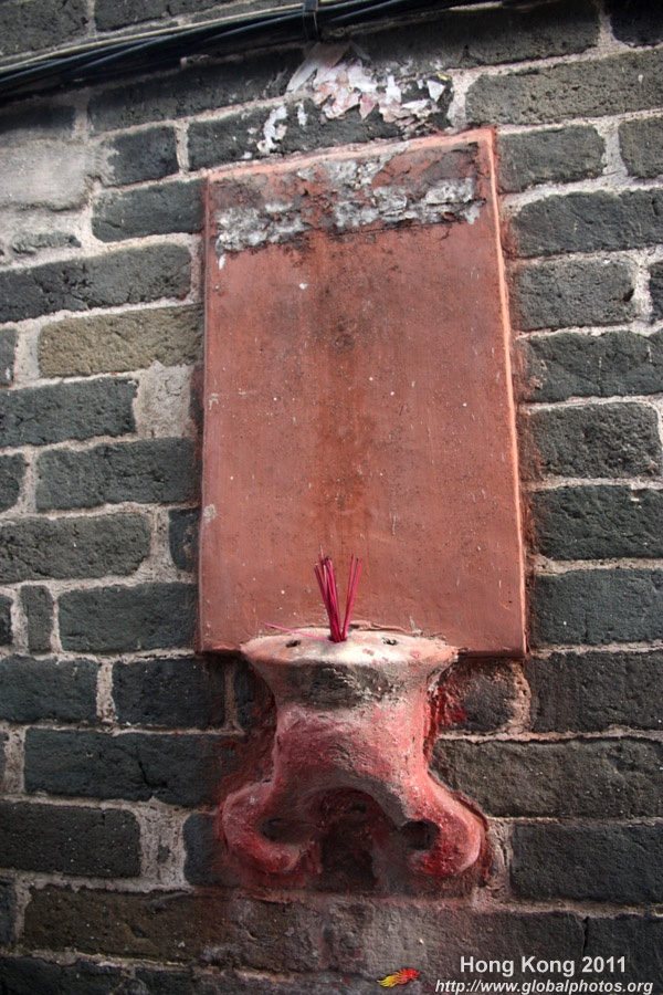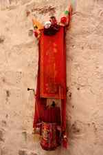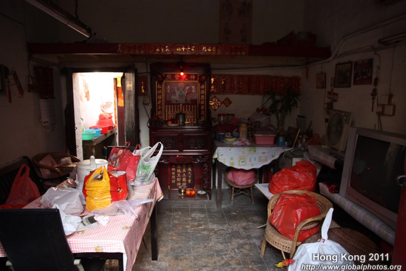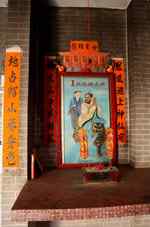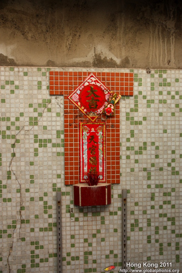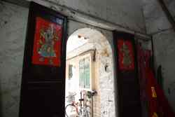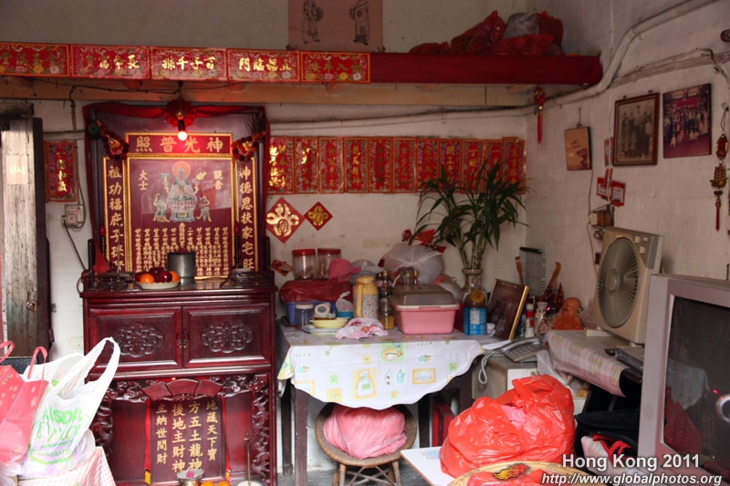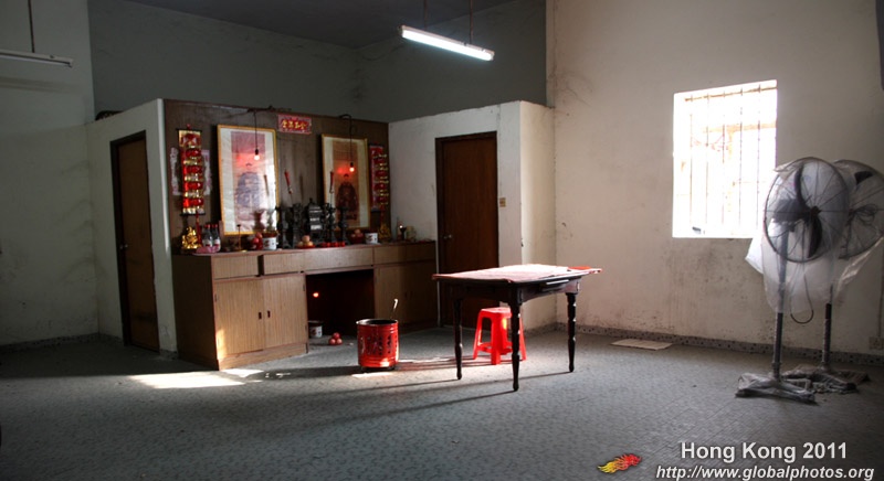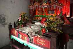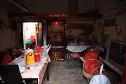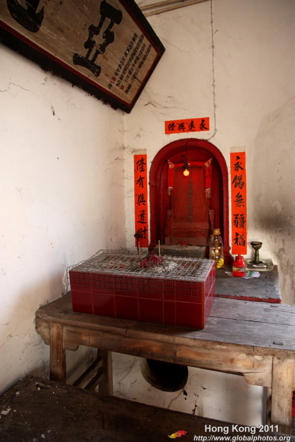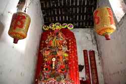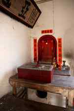 A traditional worshipping altar sits in an older building at the end of the corridor.