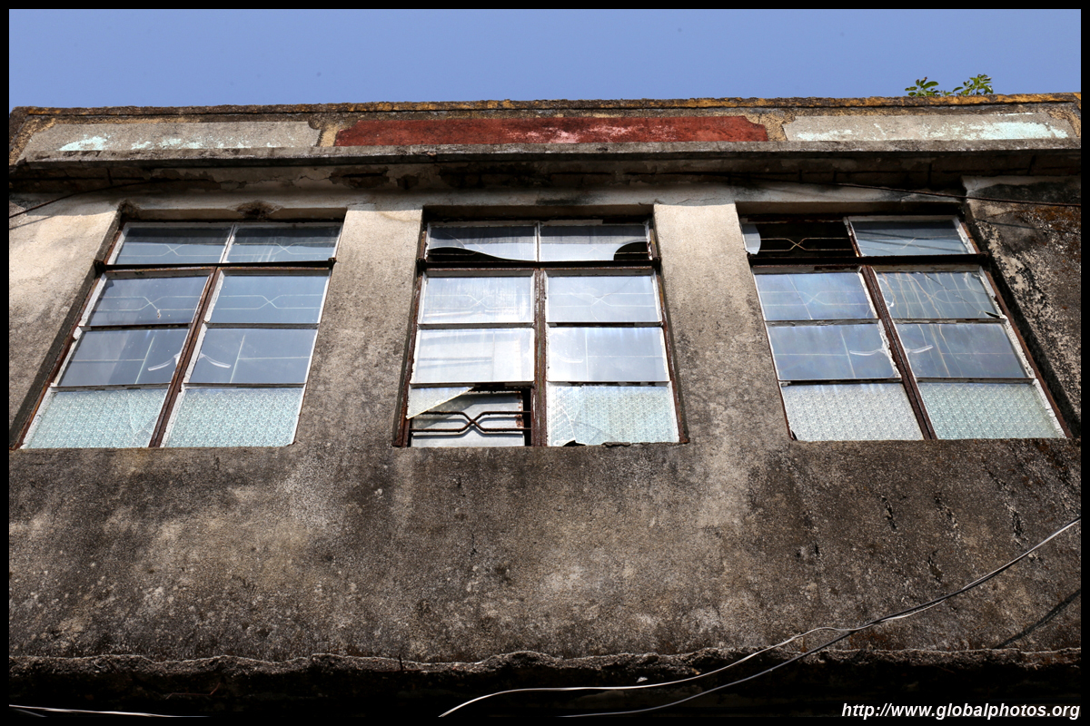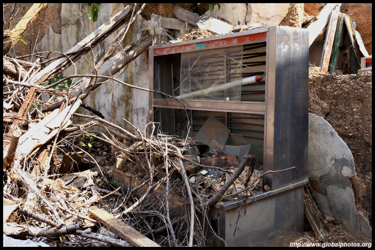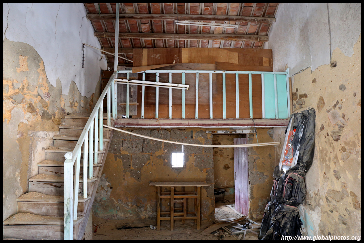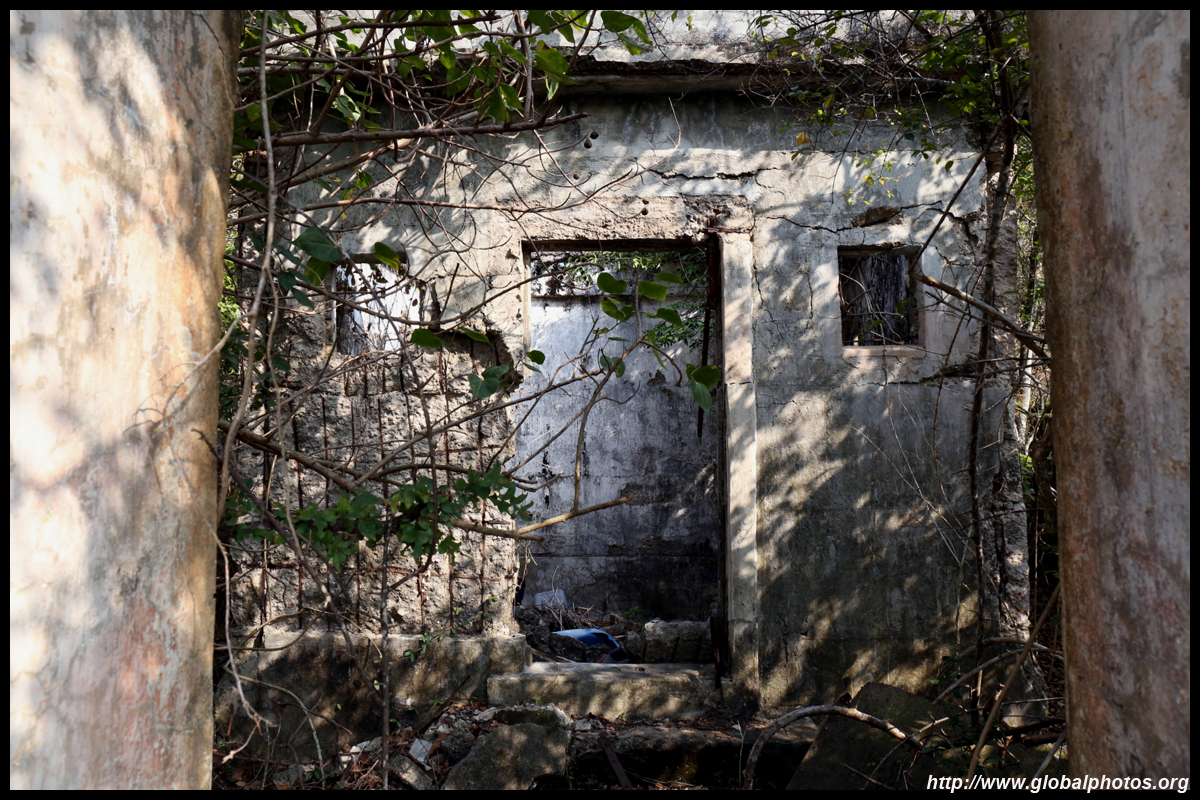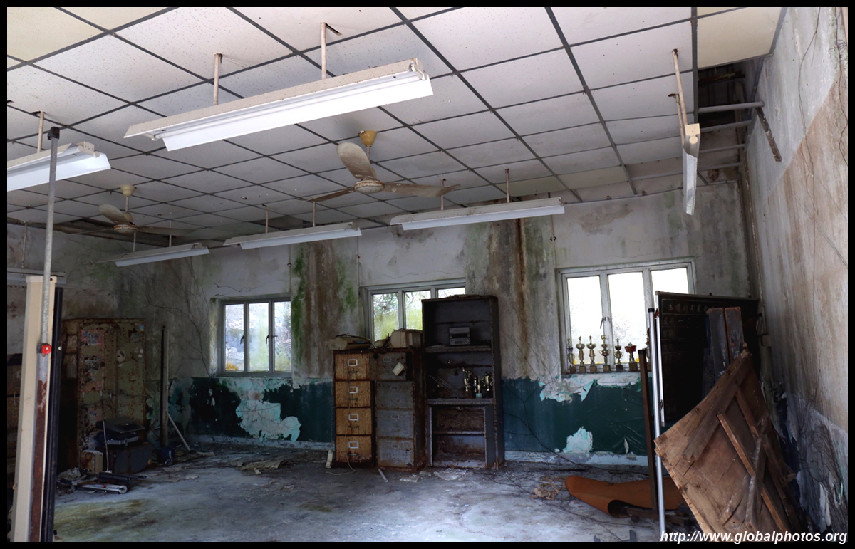 There is a mix of both modern buildings and dilapidated abandoned structures along the island's main street.