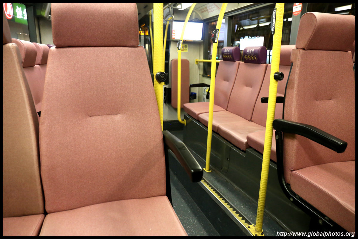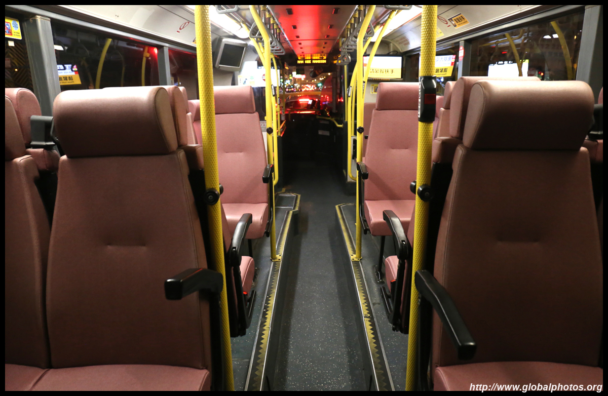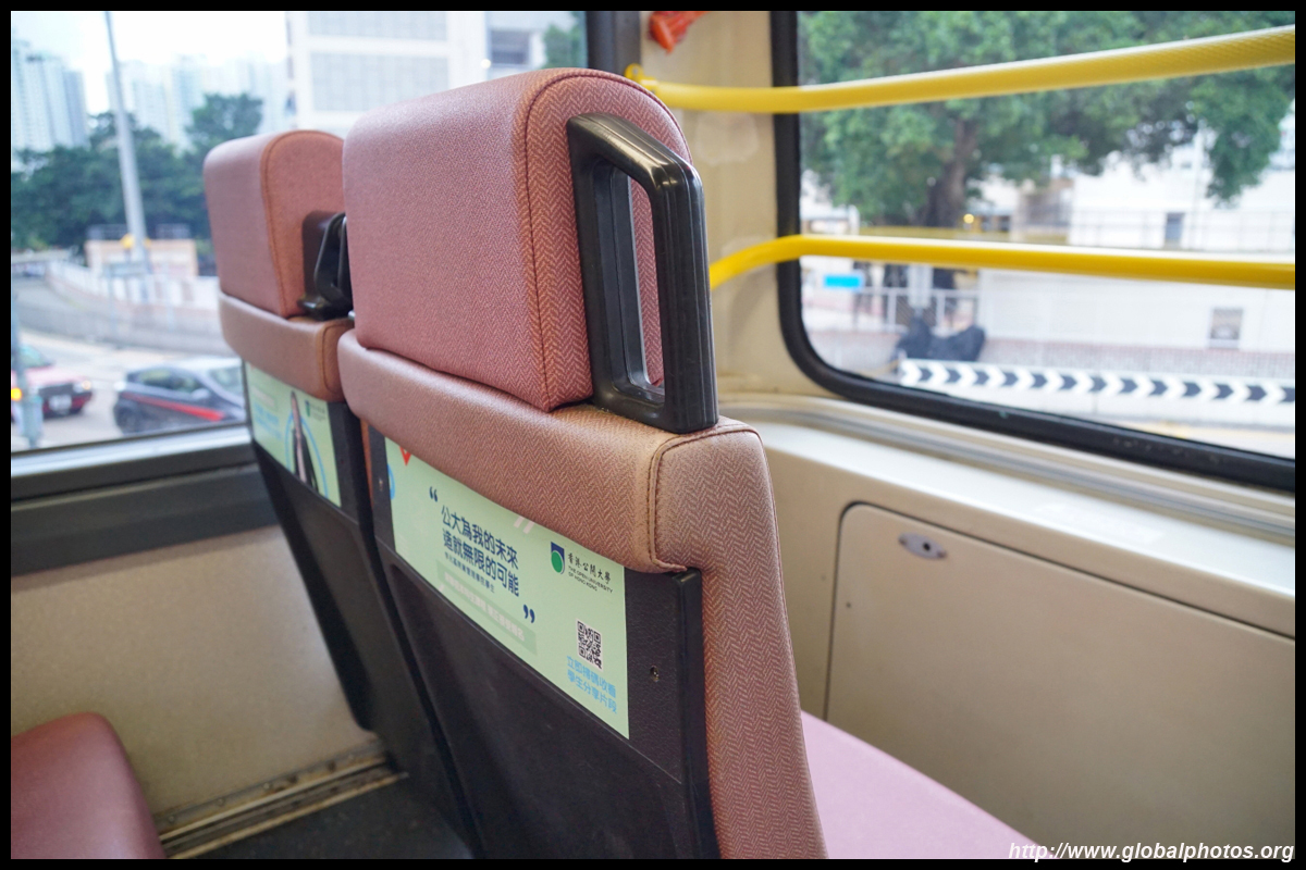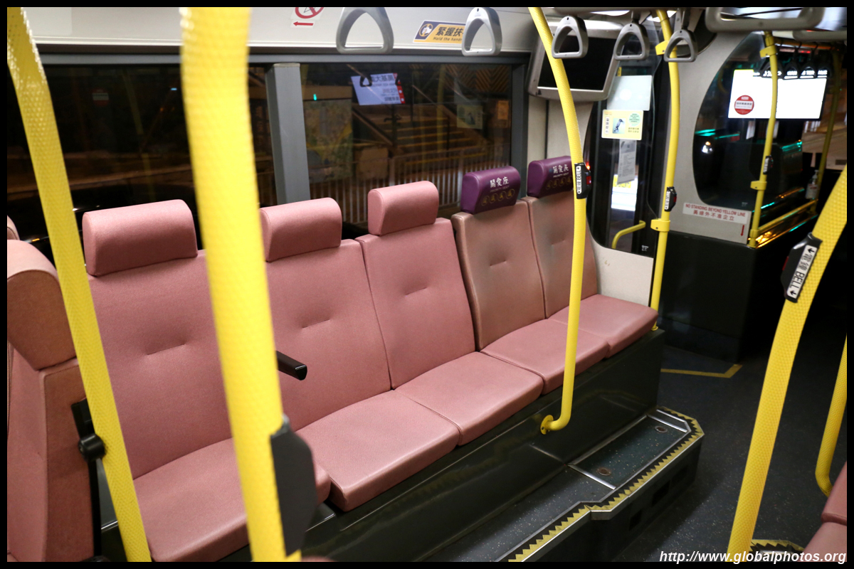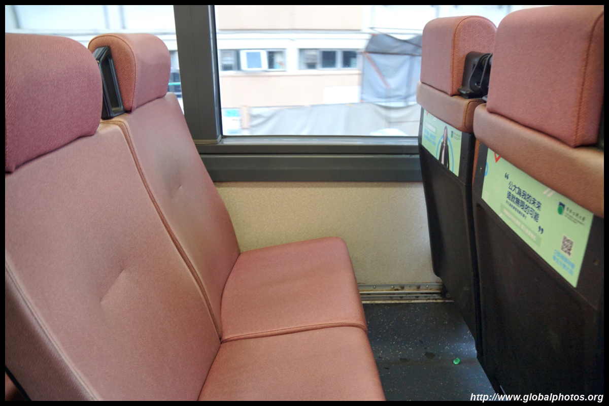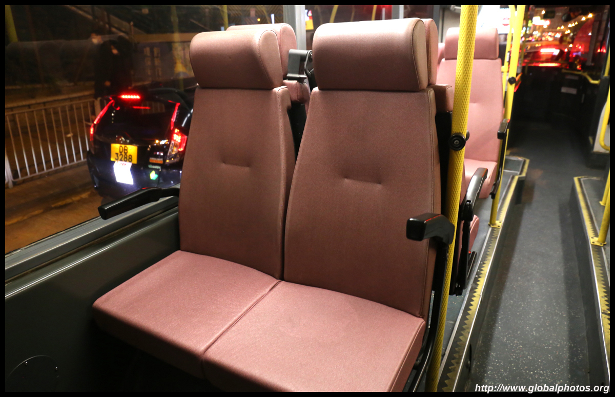 These buses have pink seats and the downstairs section has a long row of side-facing seats, a fairly unique arrangement.