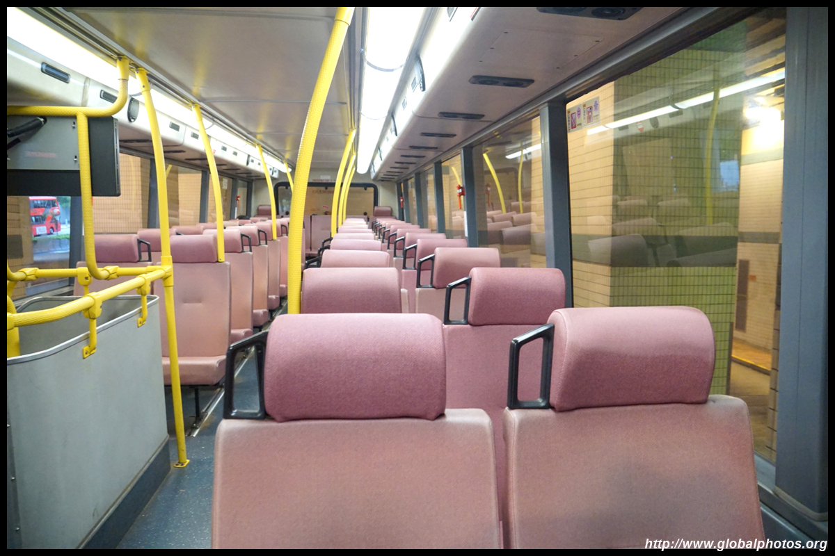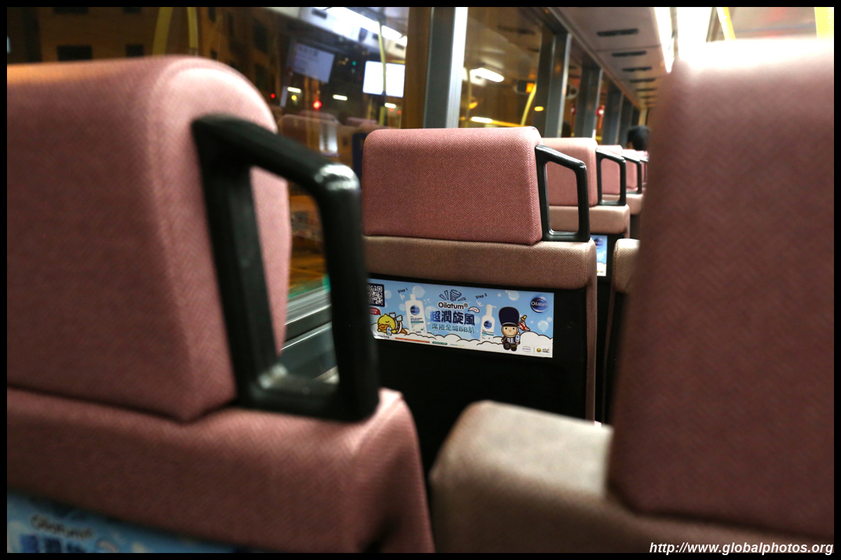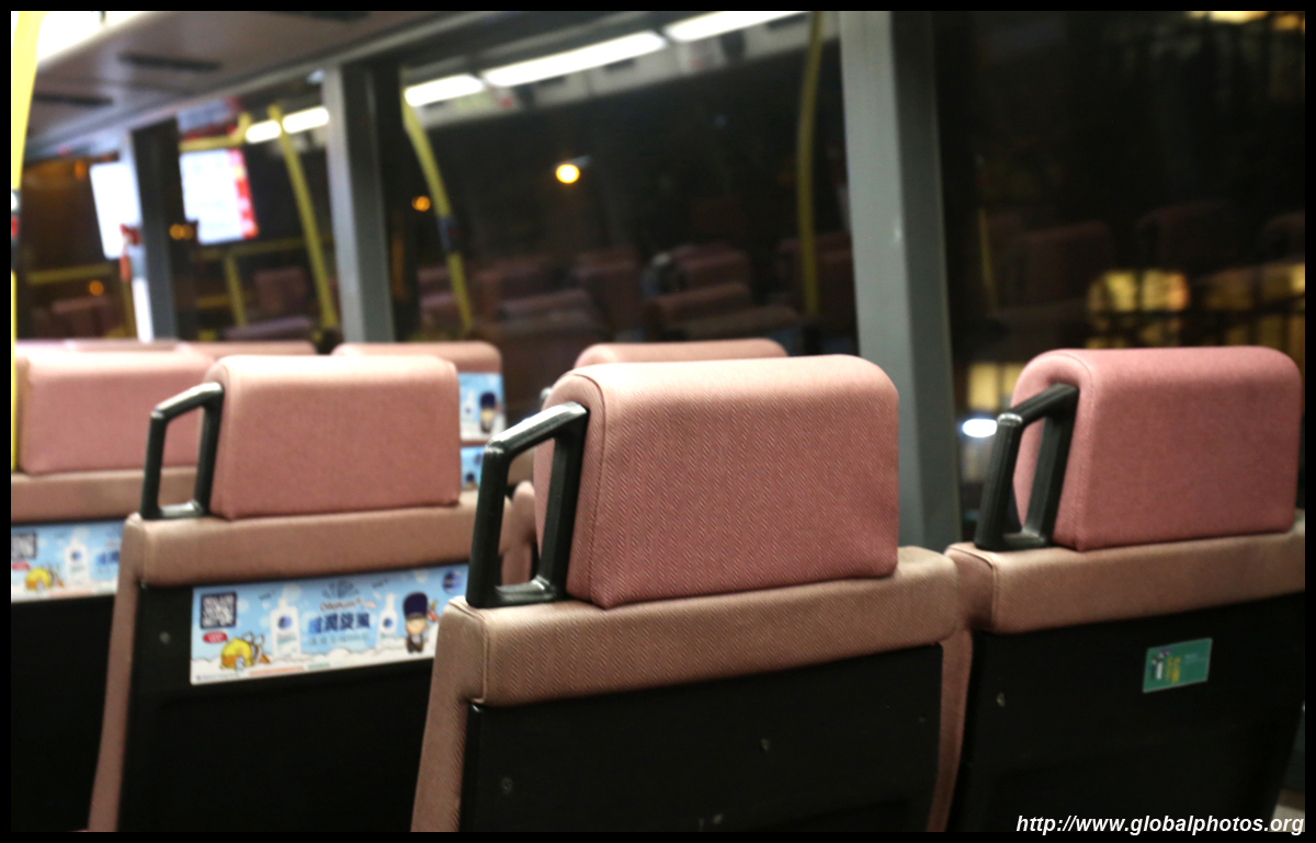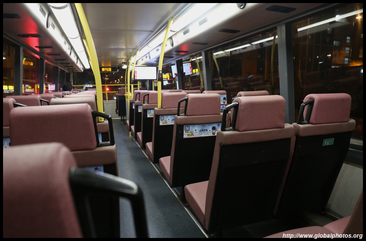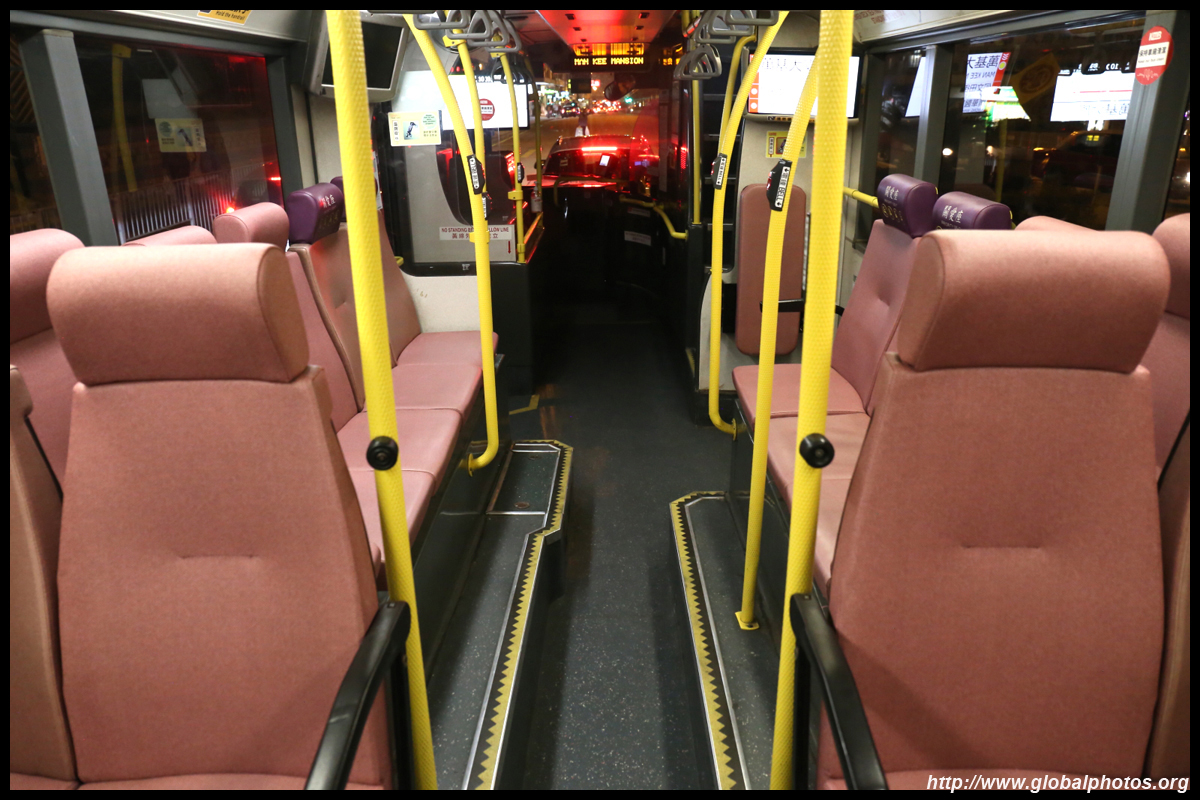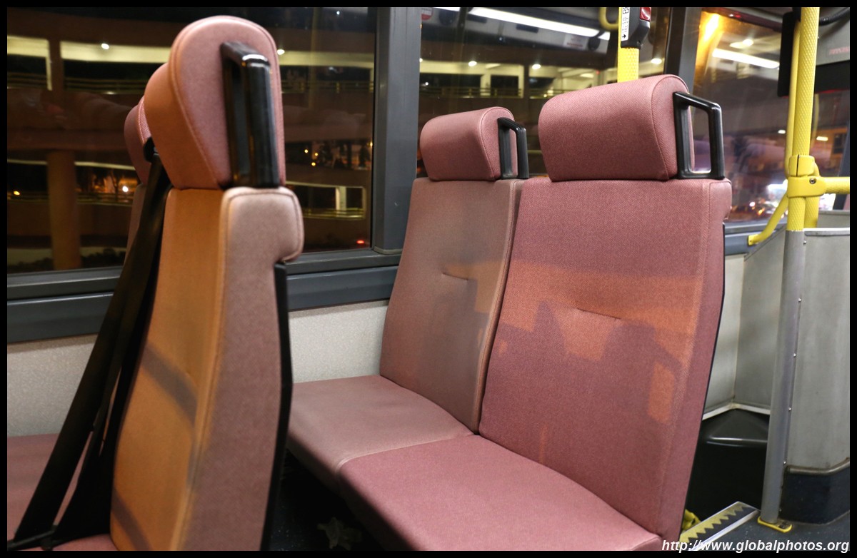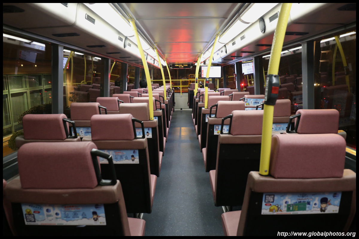 These buses have pink seats and the downstairs section has a long row of side-facing seats, a fairly unique arrangement.