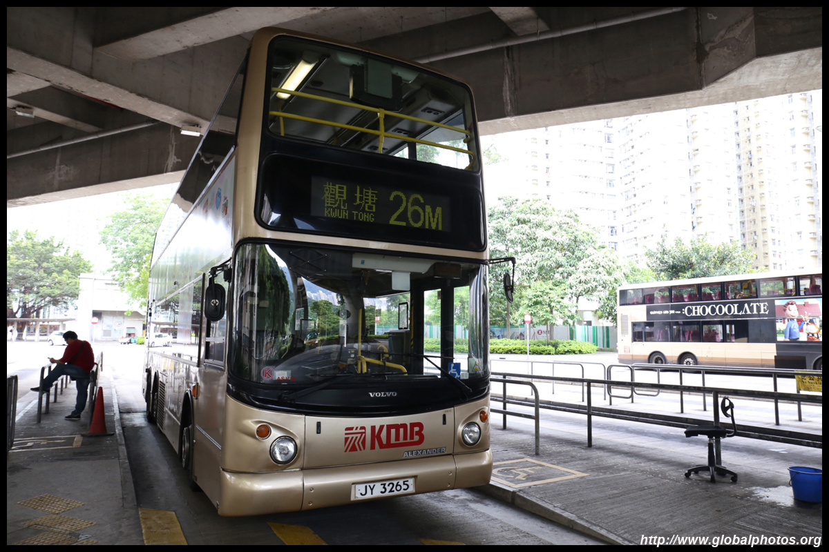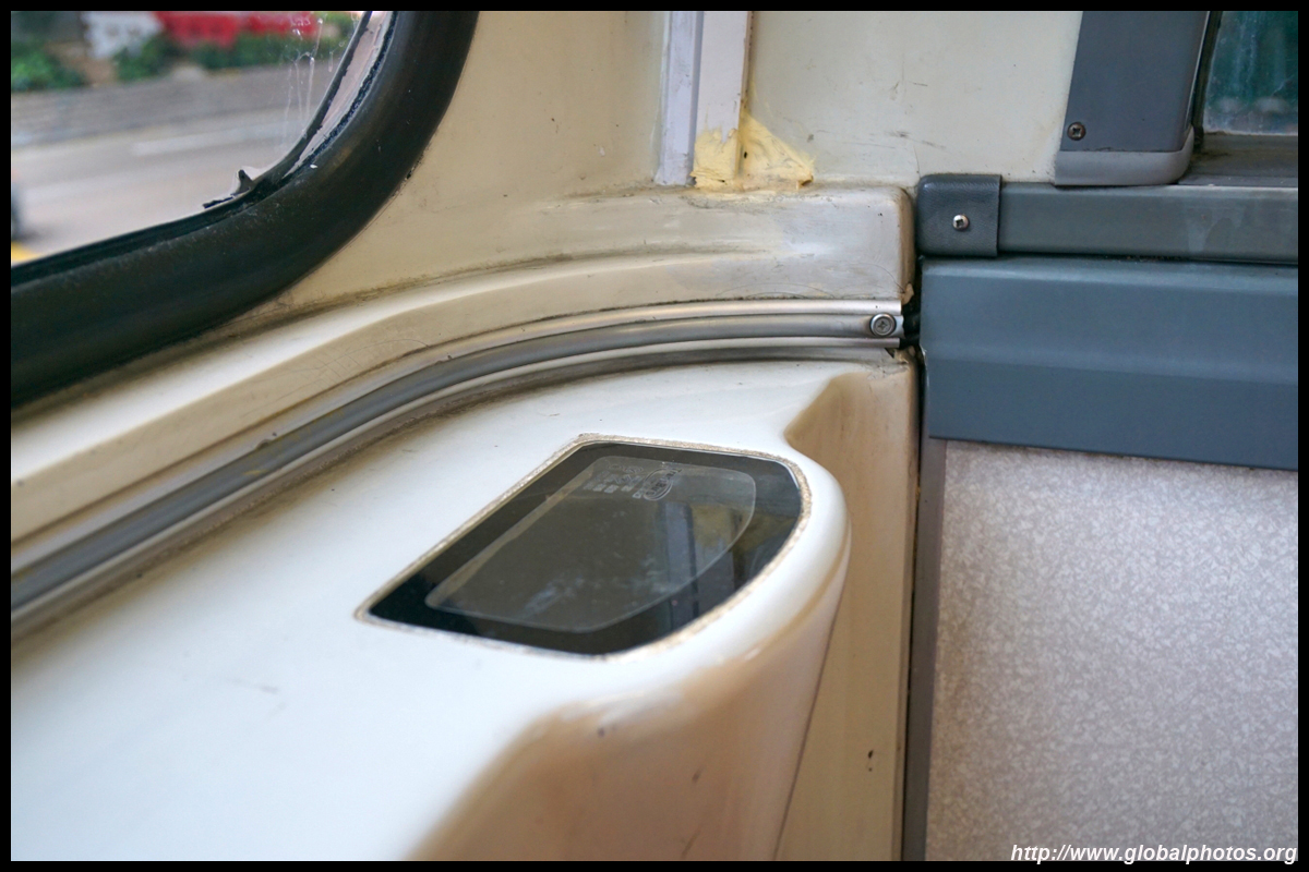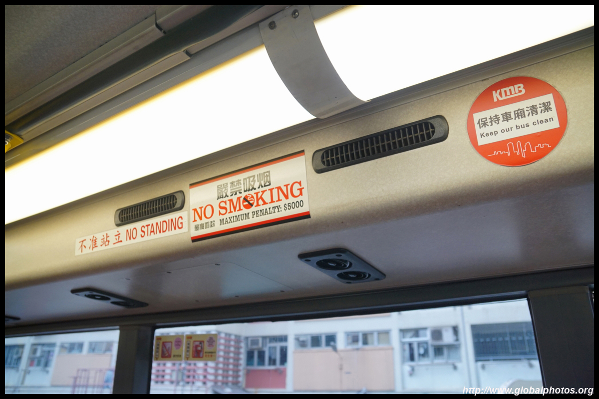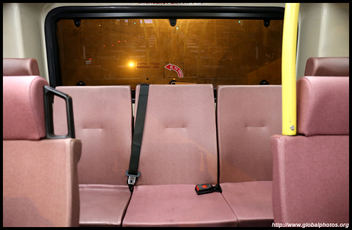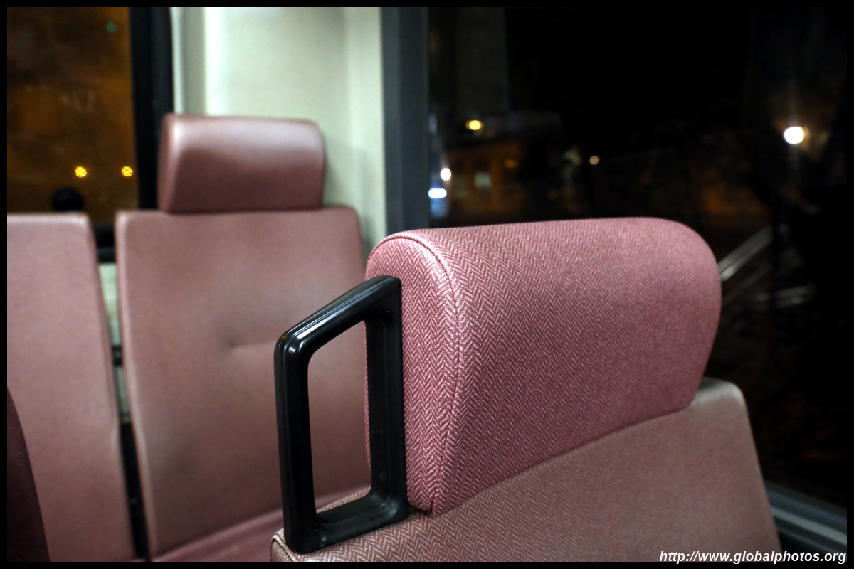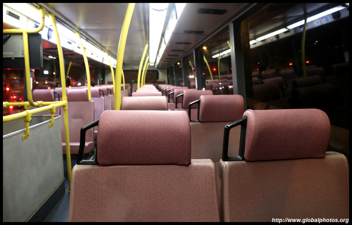 These buses have pink seats and the downstairs section has a long row of side-facing seats, a fairly unique arrangement.
