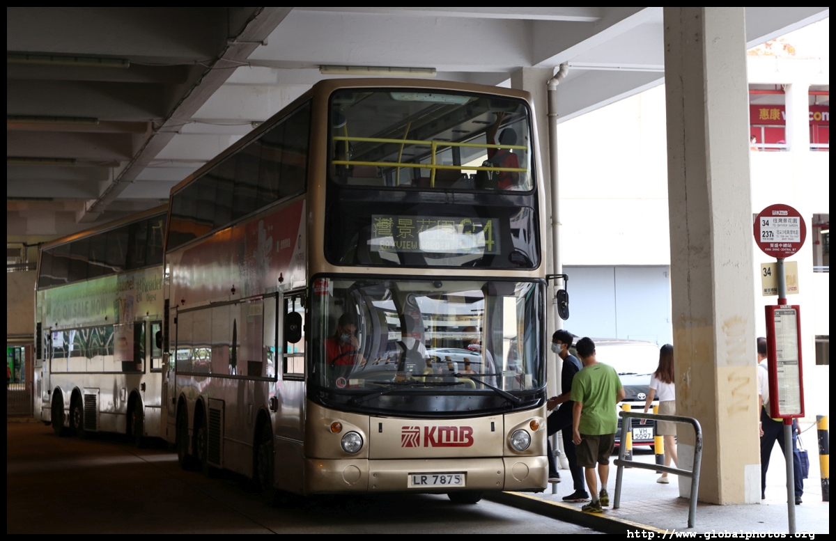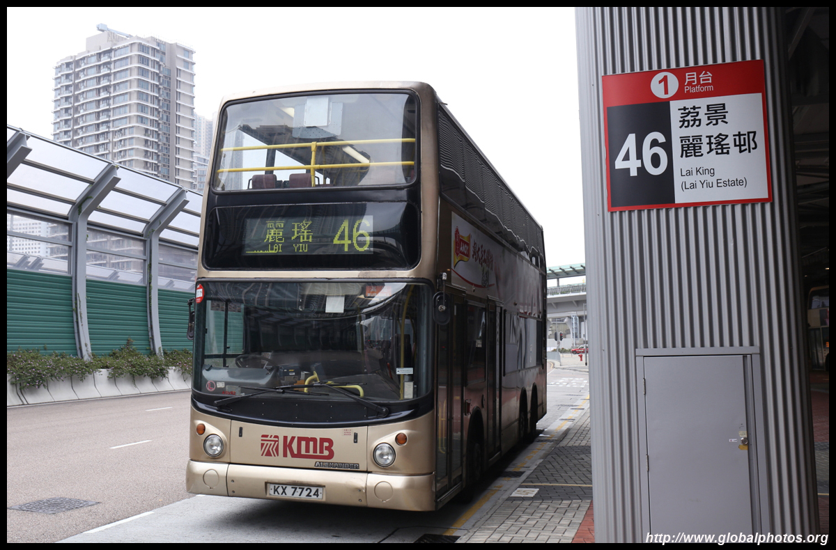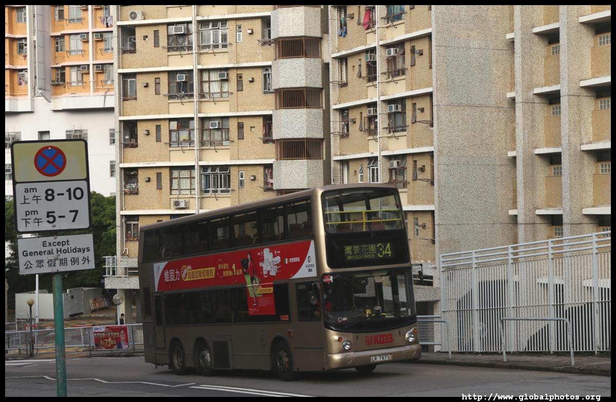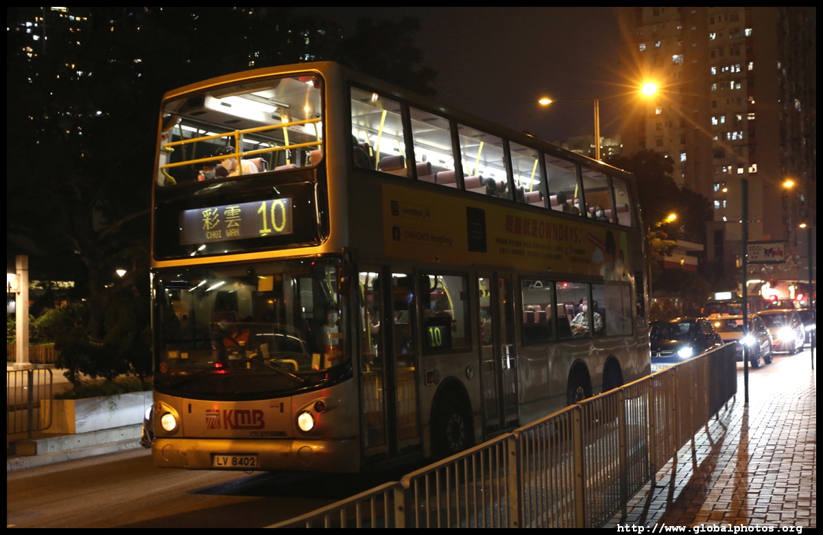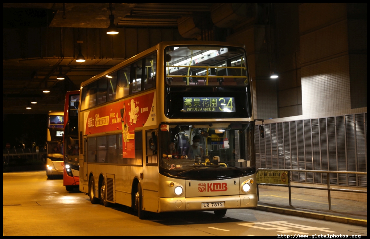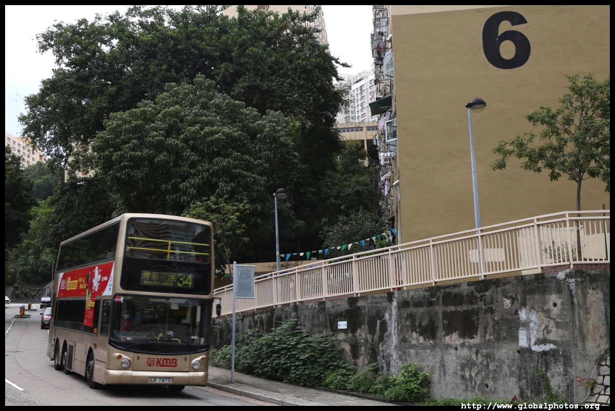 These buses have pink seats and the downstairs section has a long row of side-facing seats, a fairly unique arrangement.