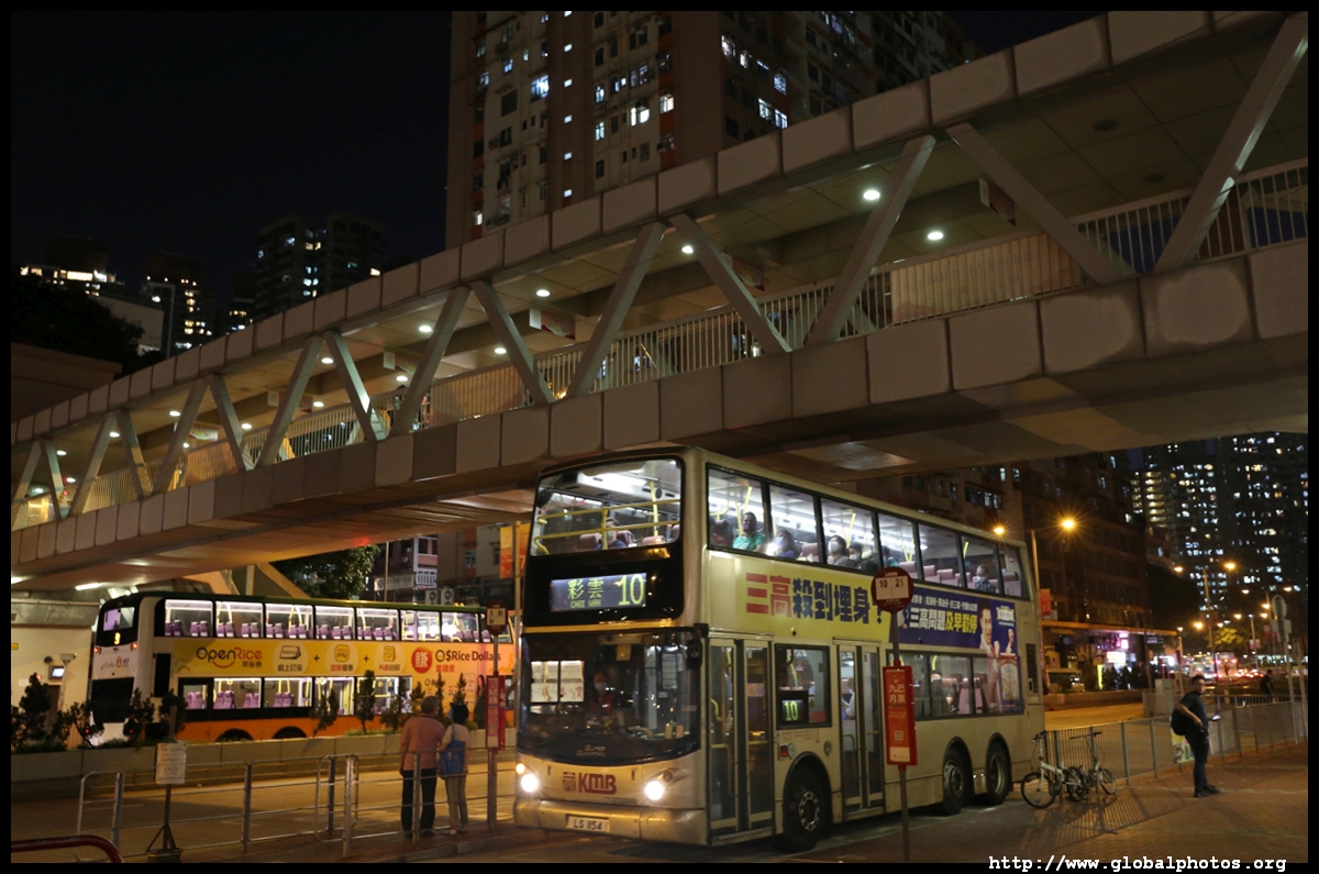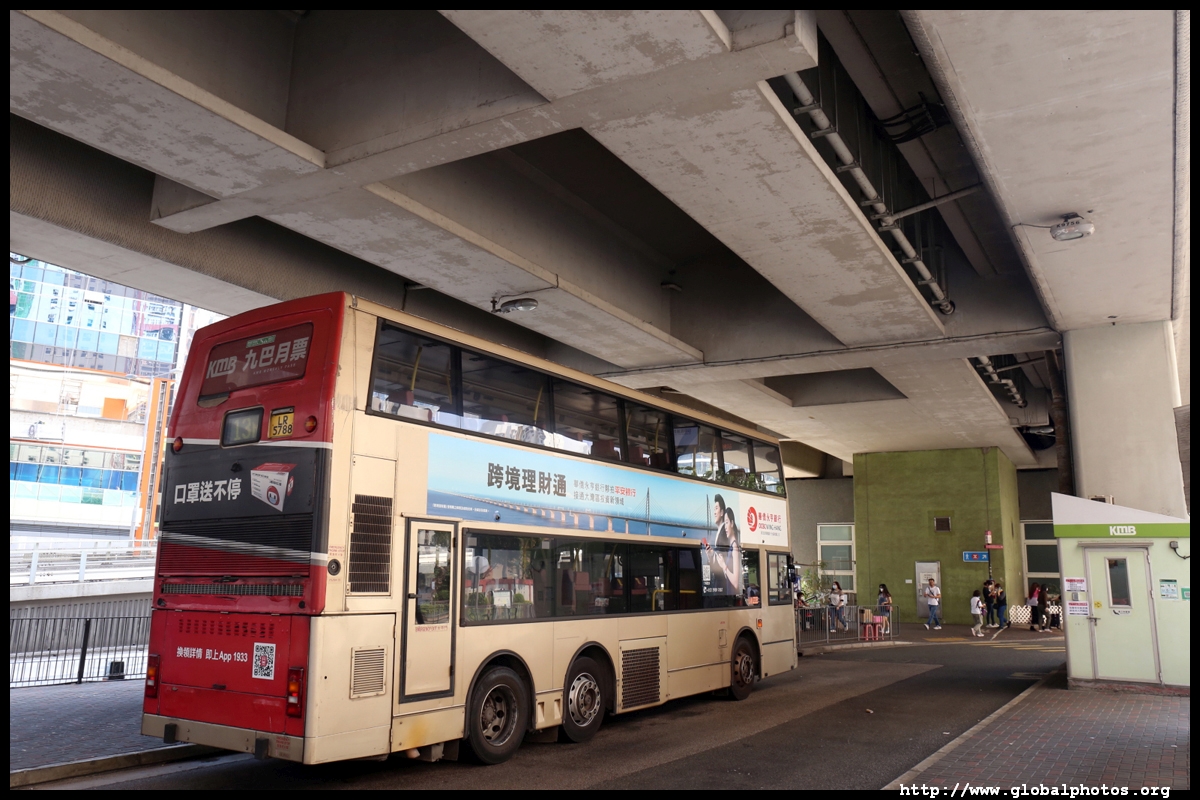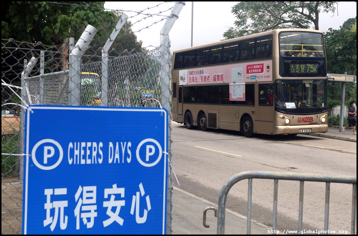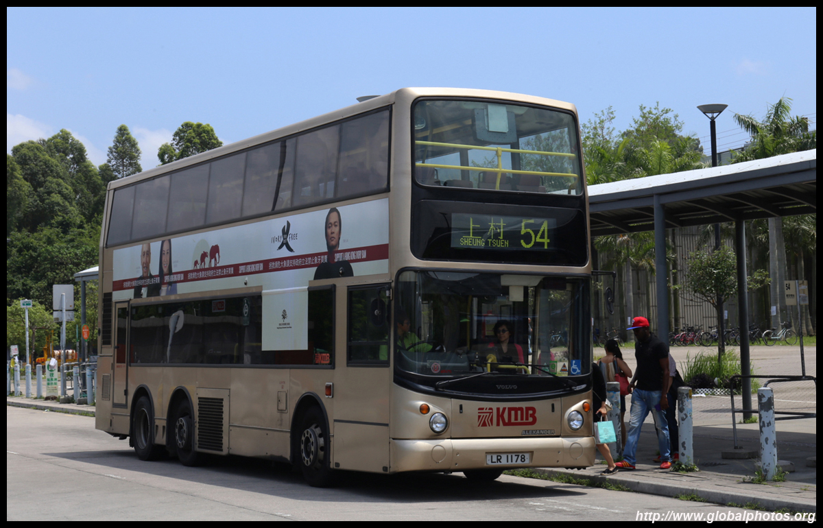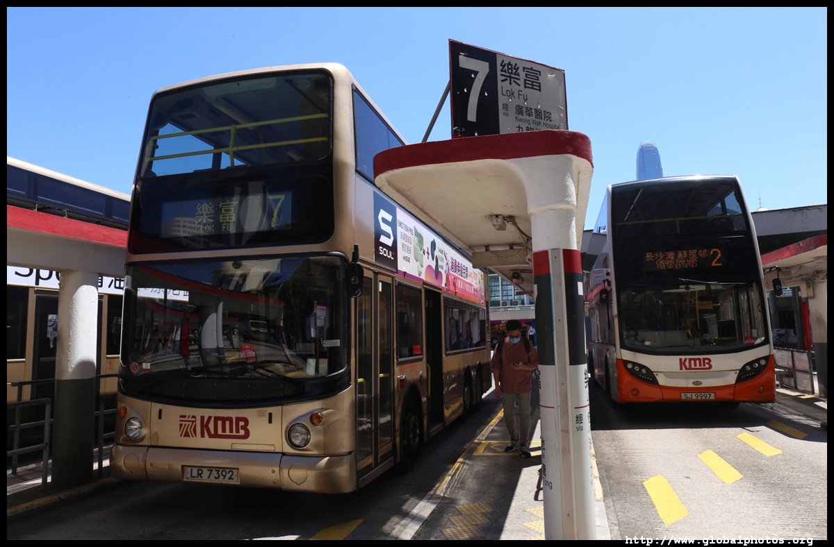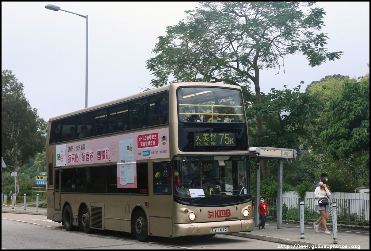 These buses have pink seats and the downstairs section has a long row of side-facing seats, a fairly unique arrangement.