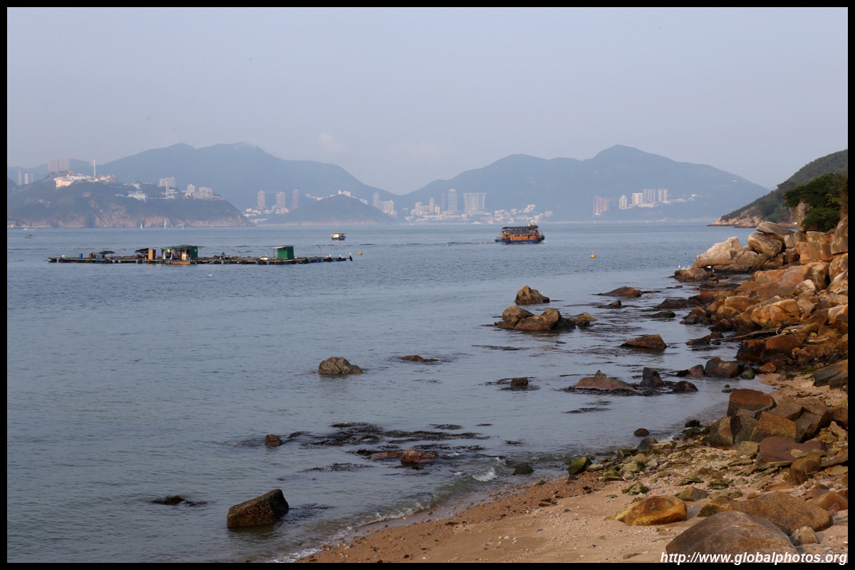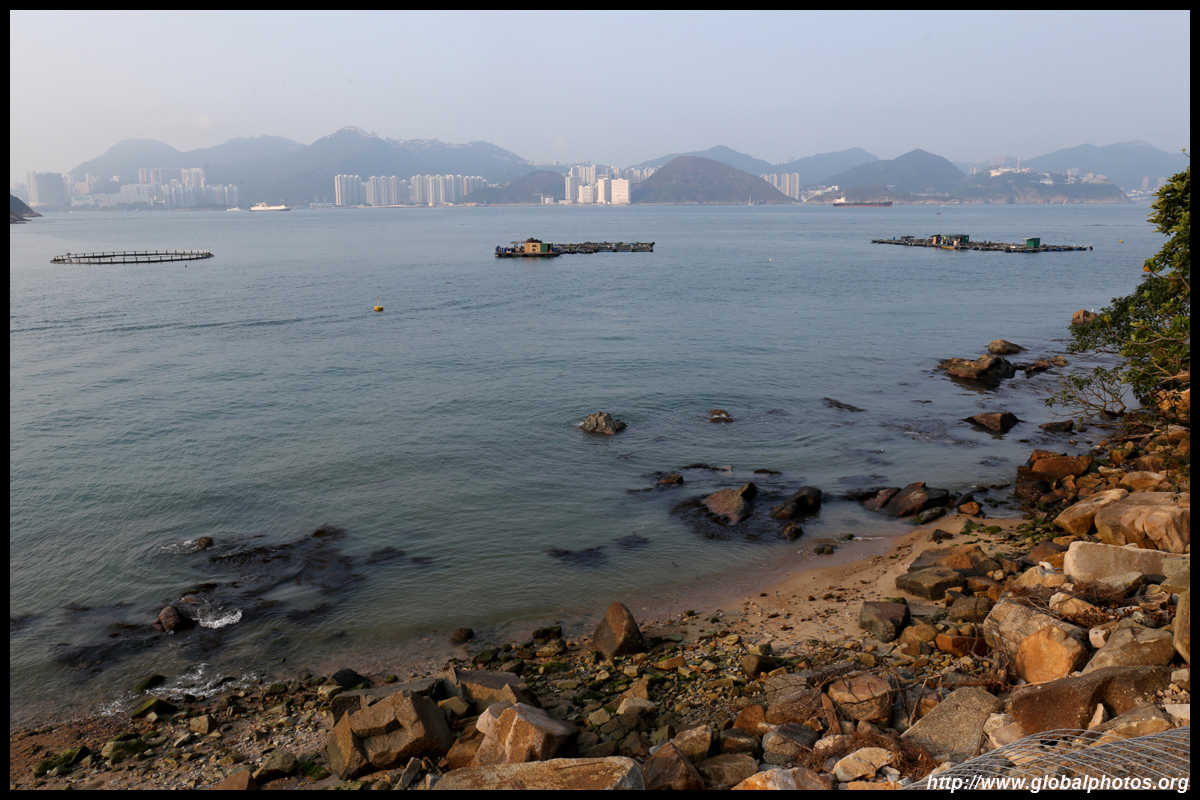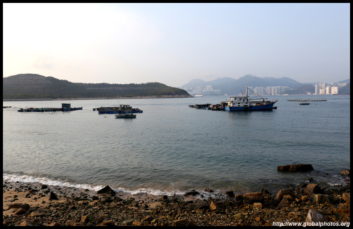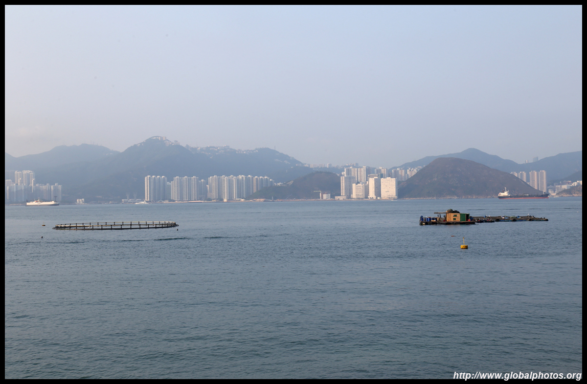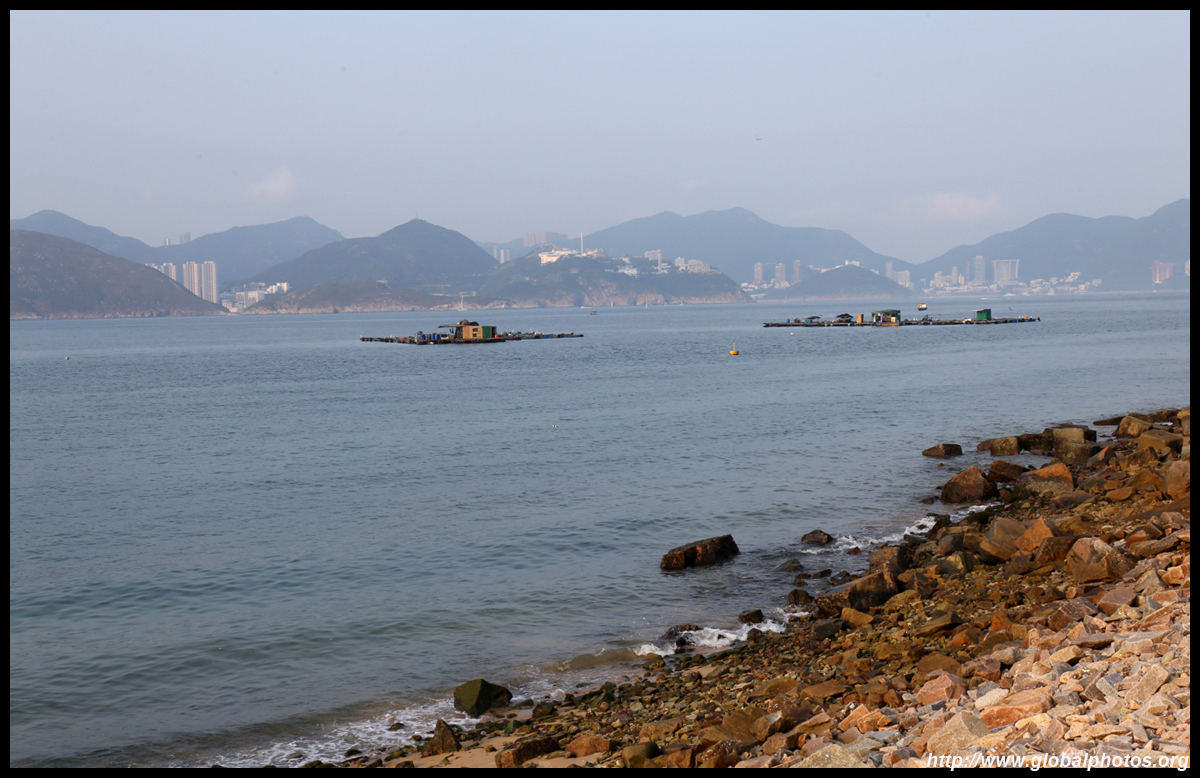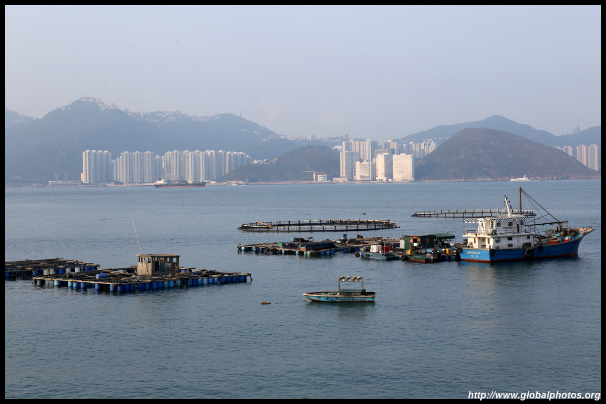 Just off the coast are fish farms with Hong Kong Island in the distance.