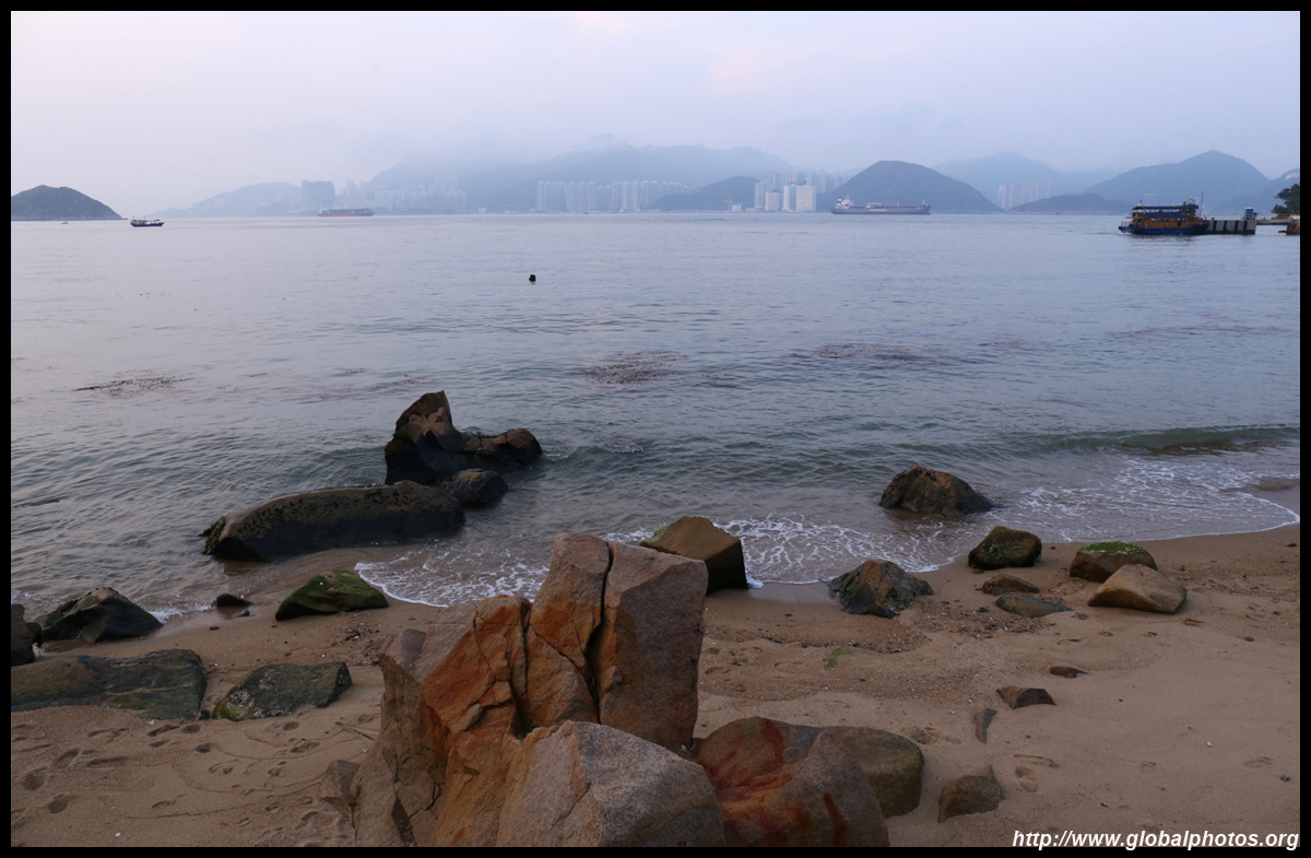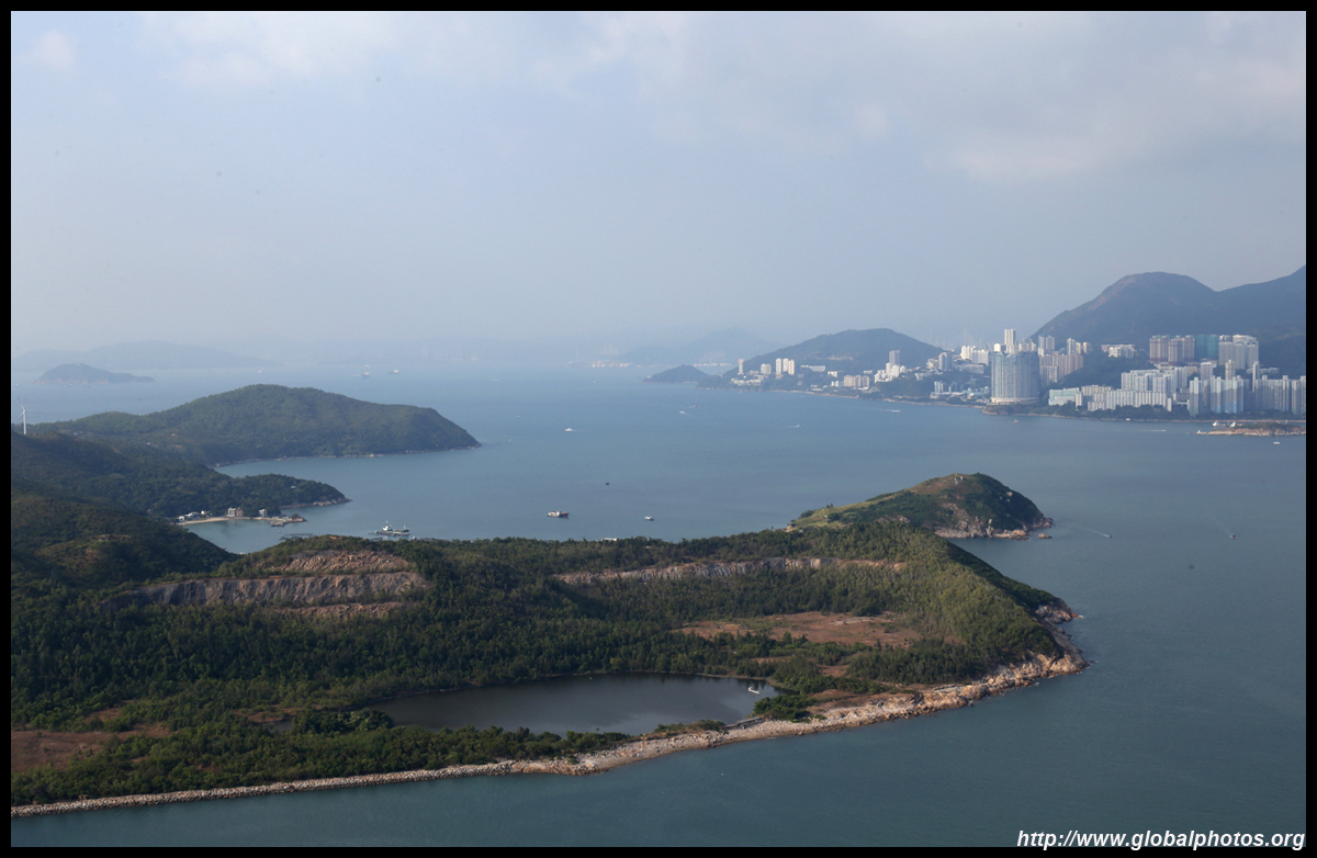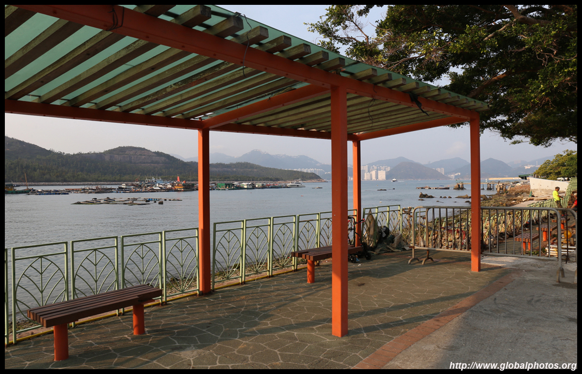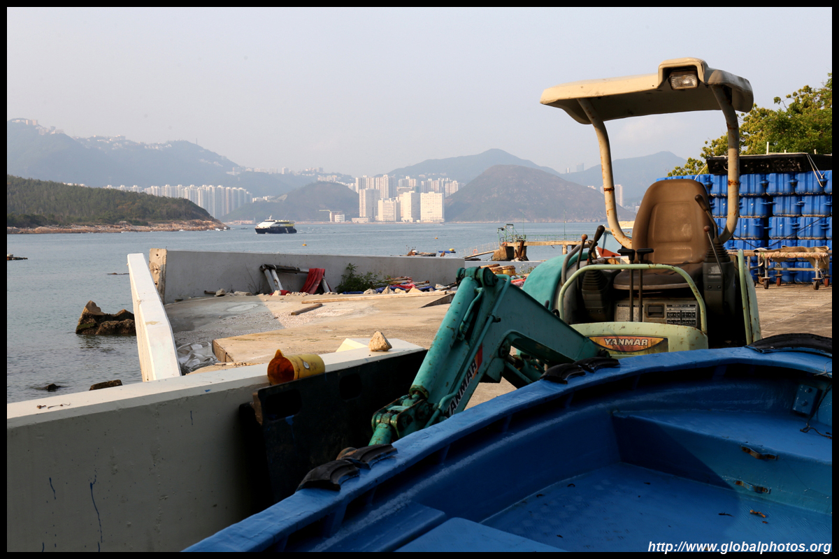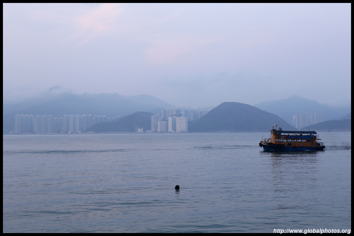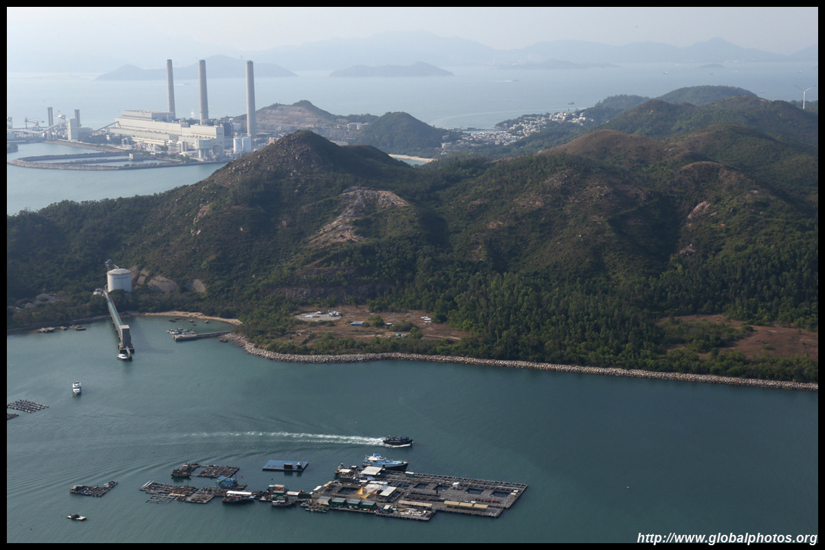 Just off the coast are fish farms with Hong Kong Island in the distance.