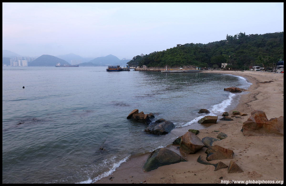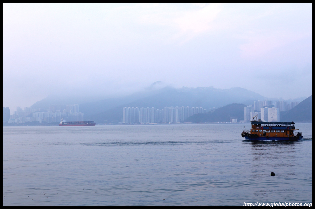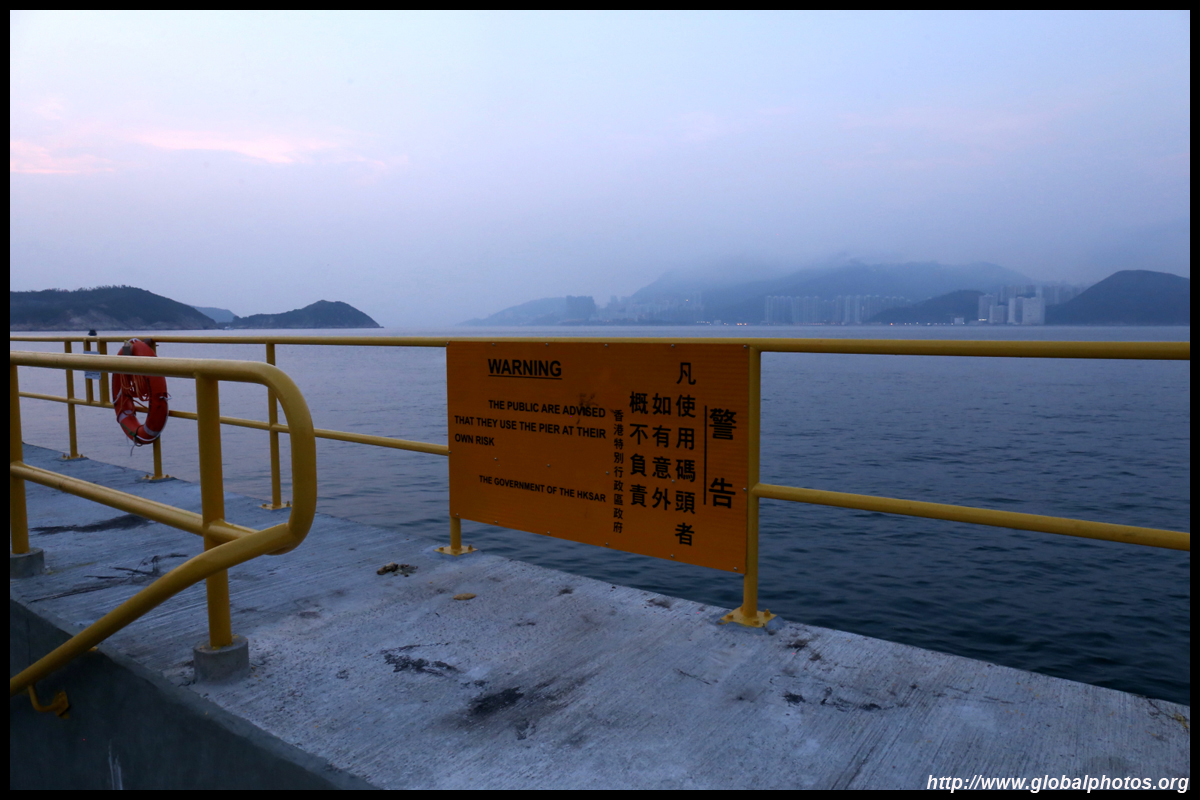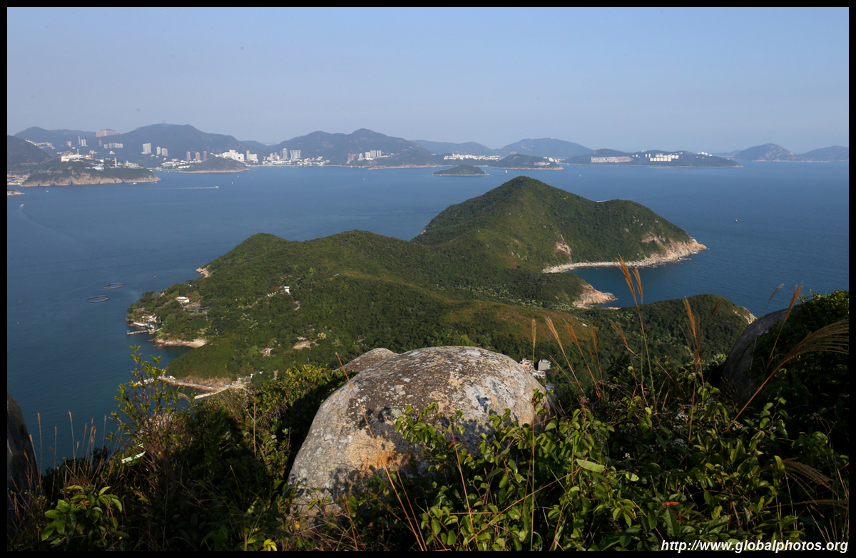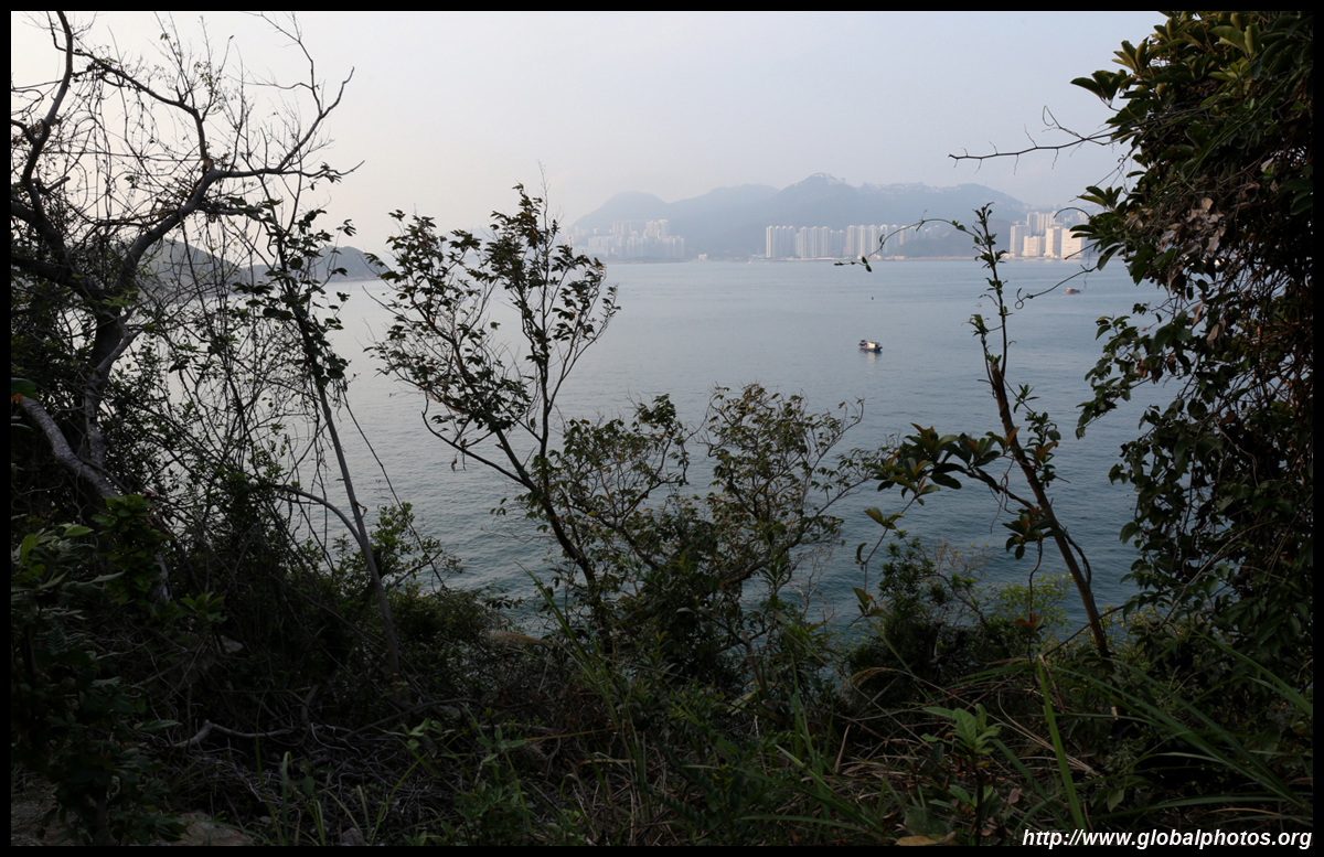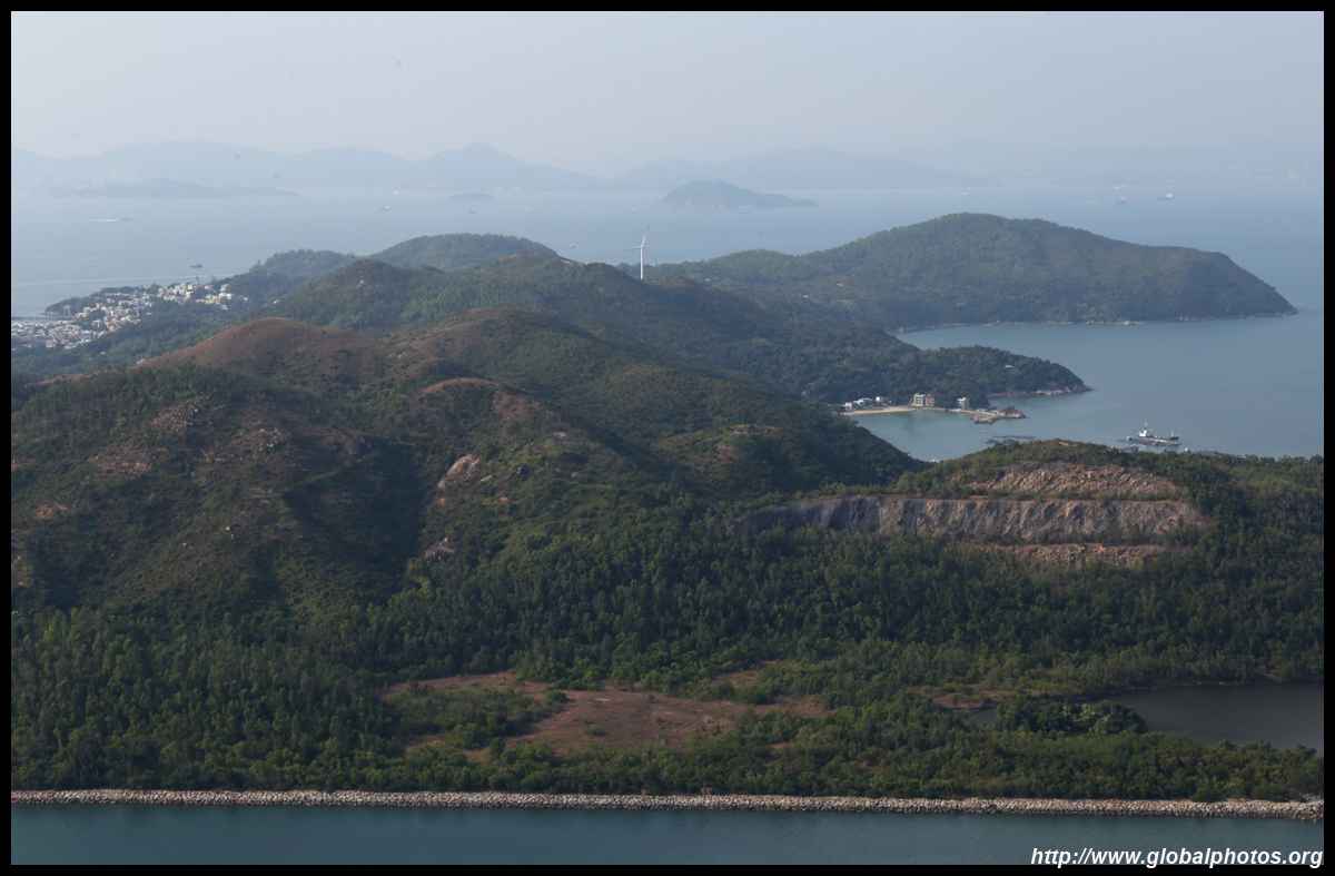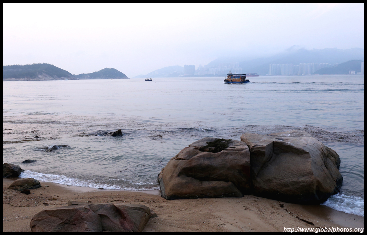 Just off the coast are fish farms with Hong Kong Island in the distance.