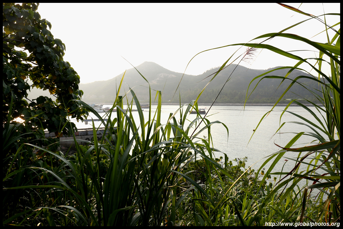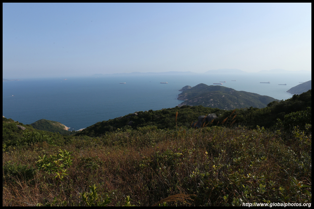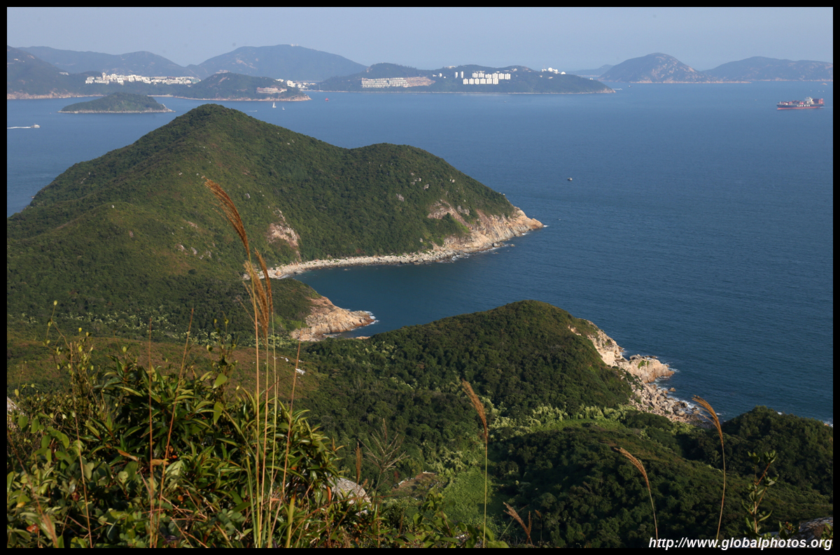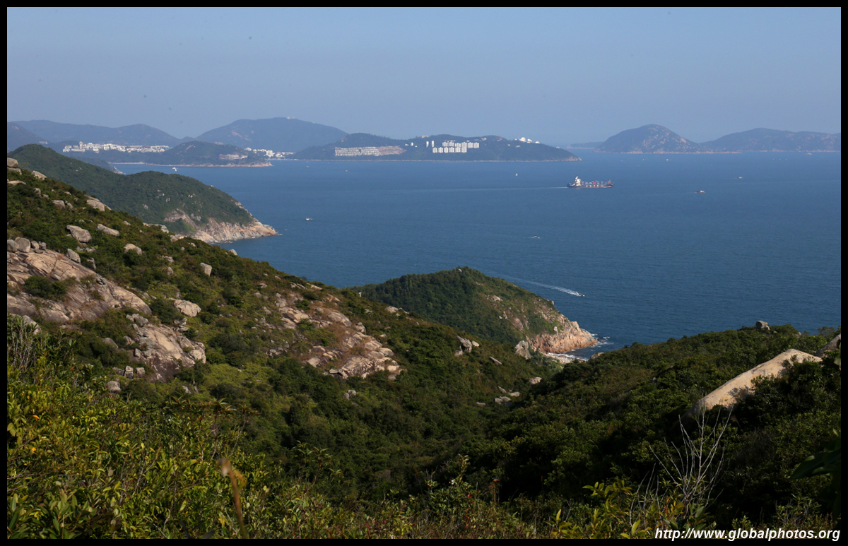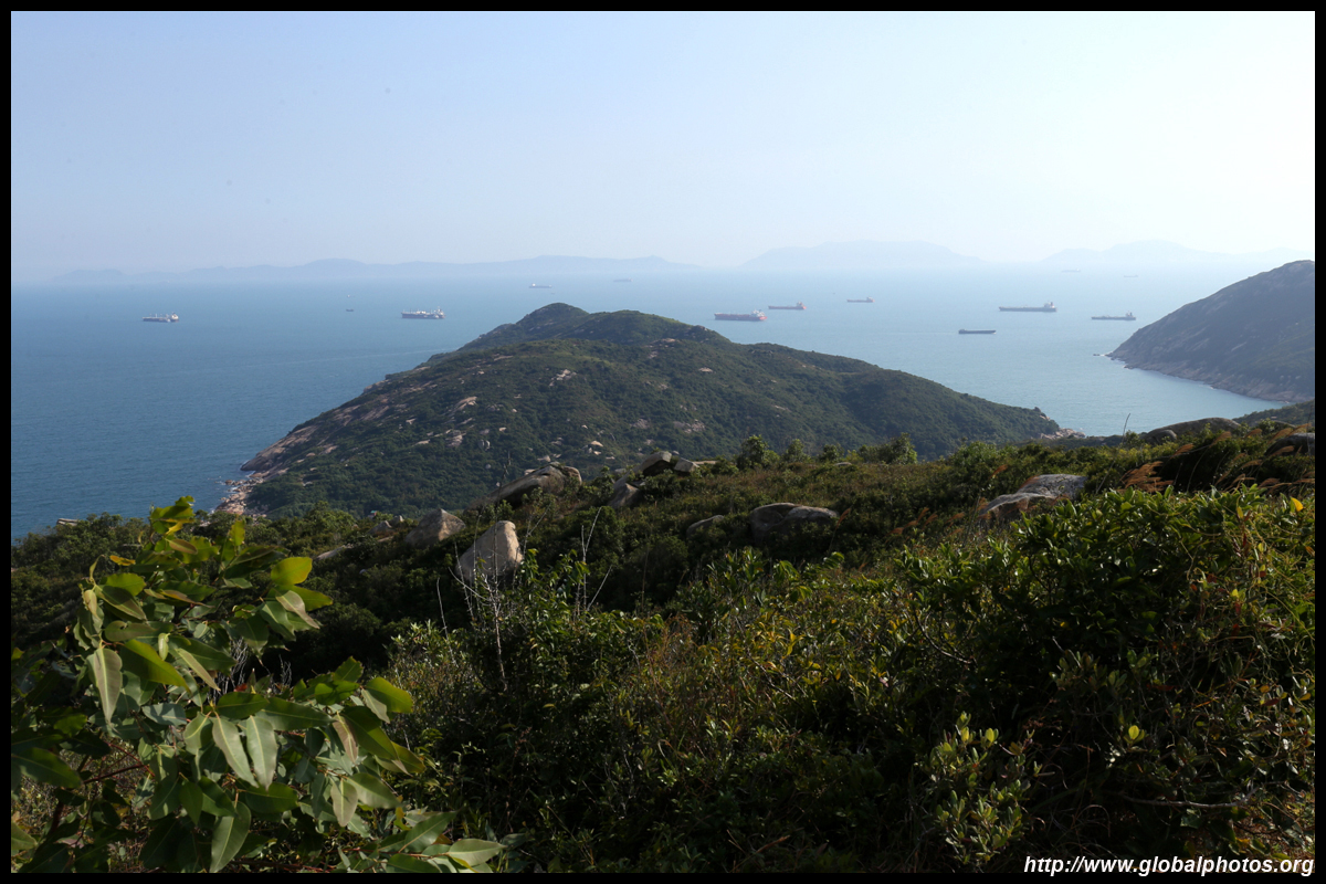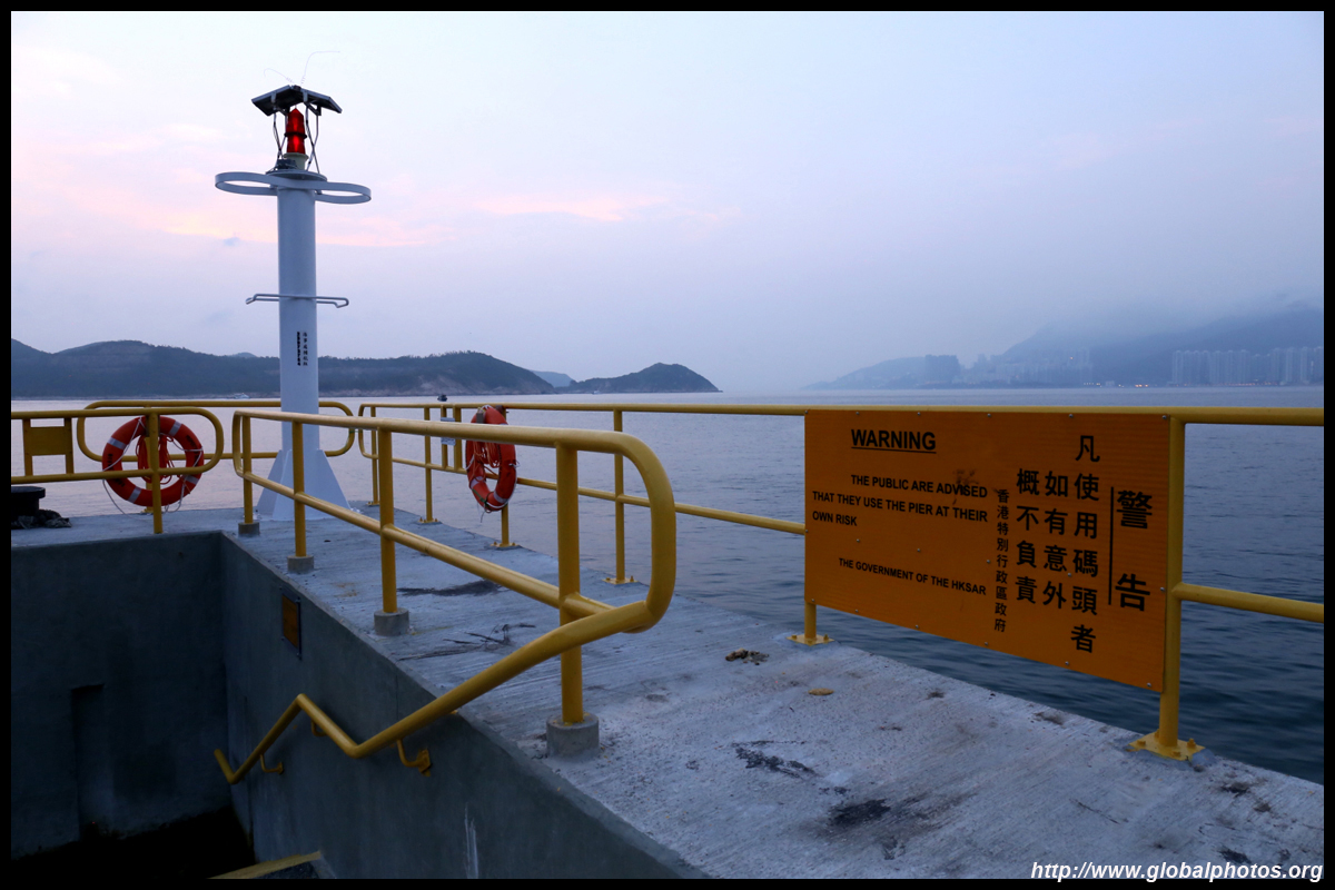 Just off the coast are fish farms with Hong Kong Island in the distance.
