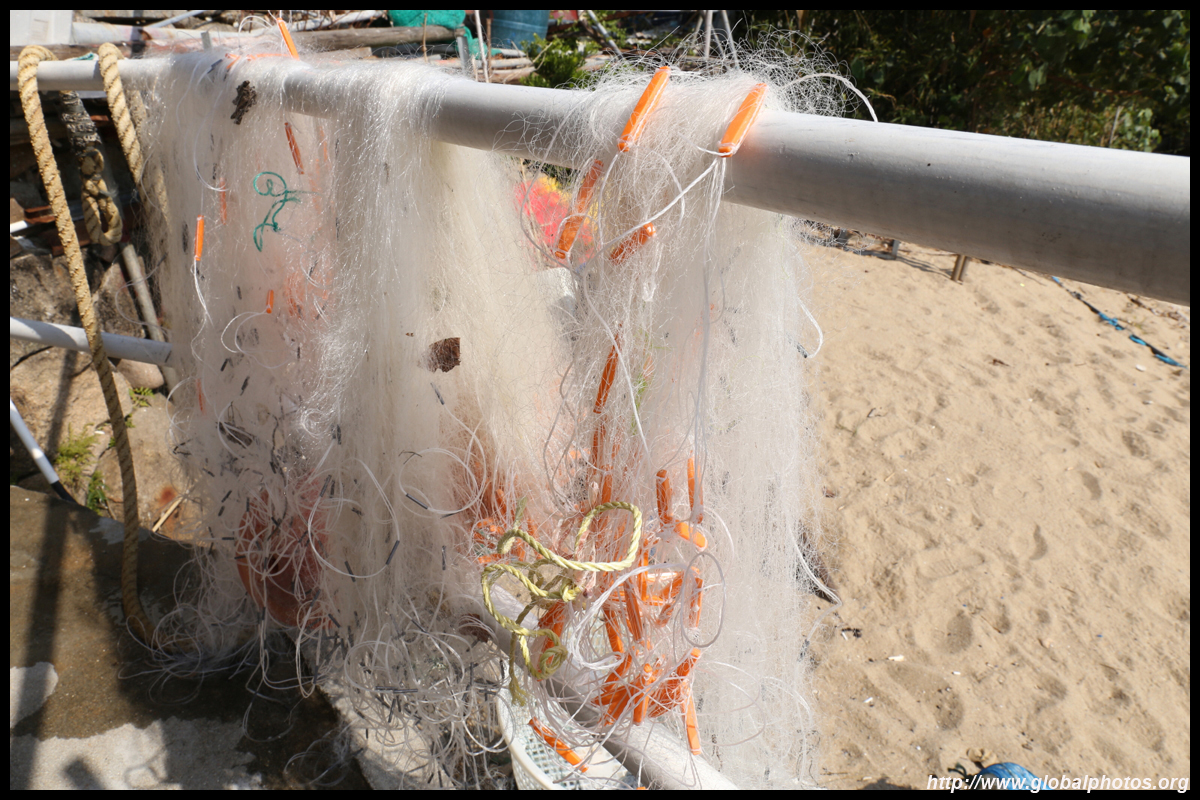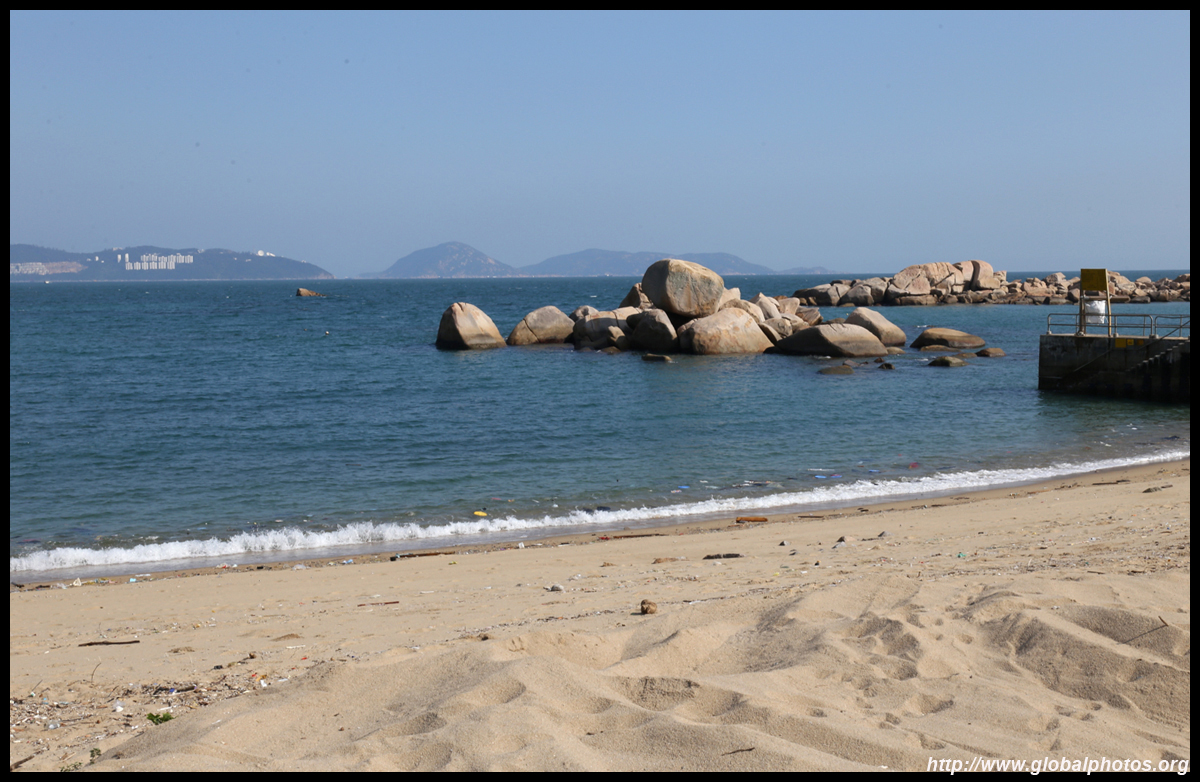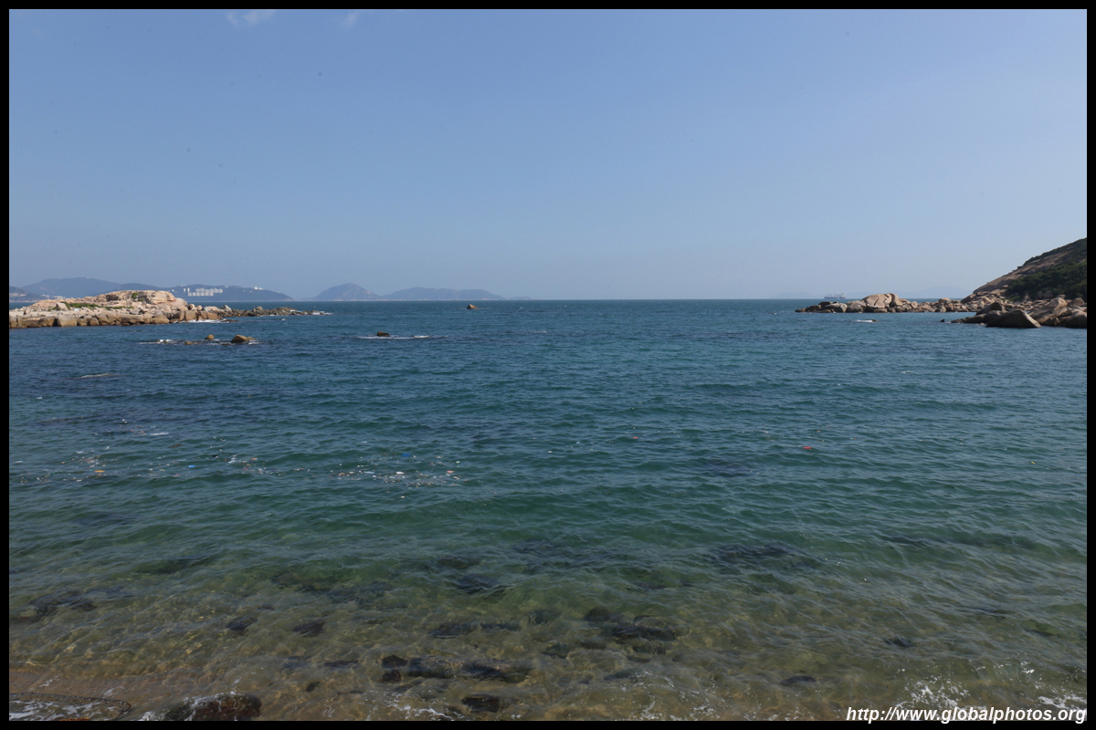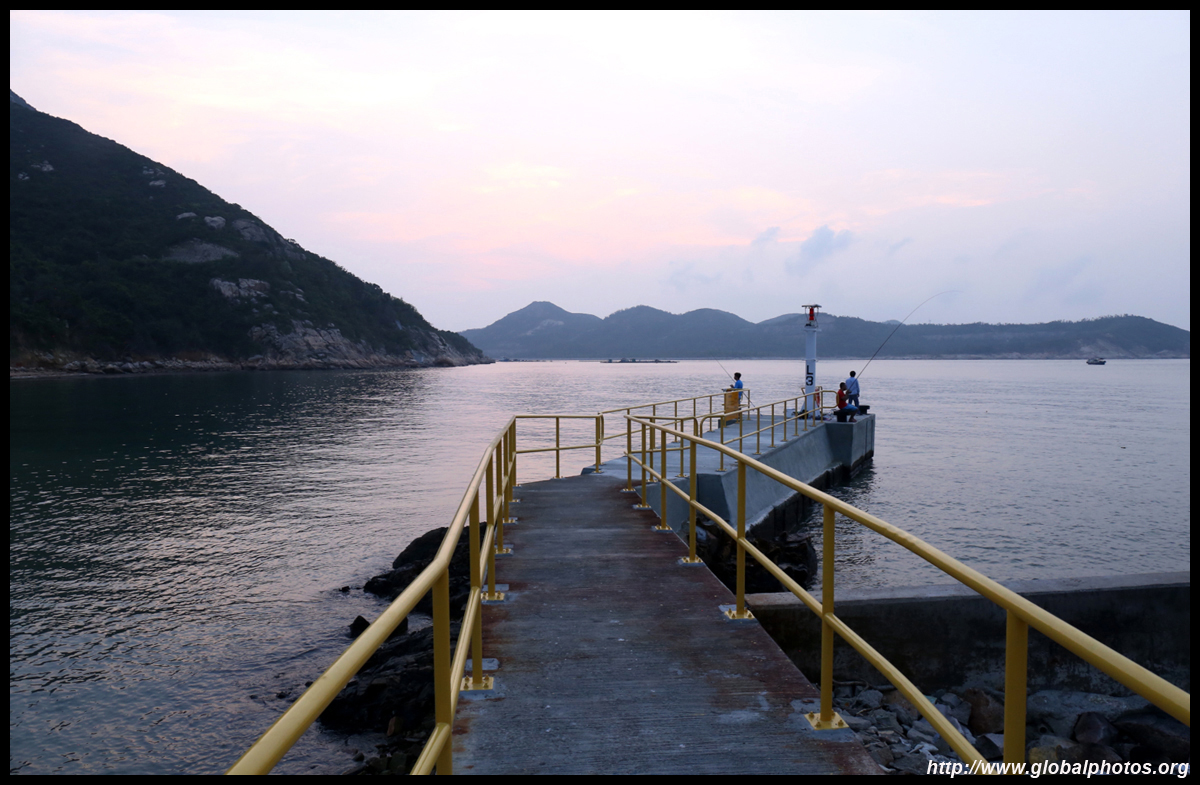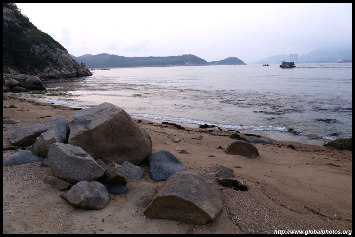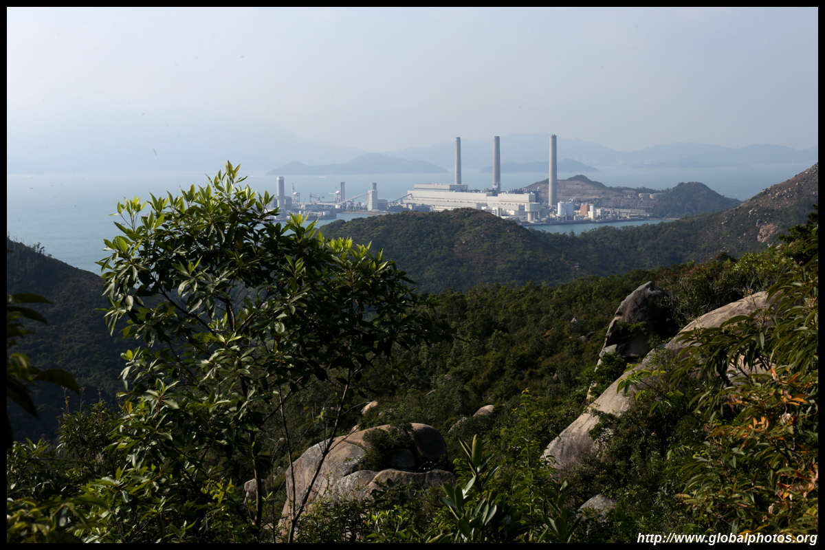 Just off the coast are fish farms with Hong Kong Island in the distance.