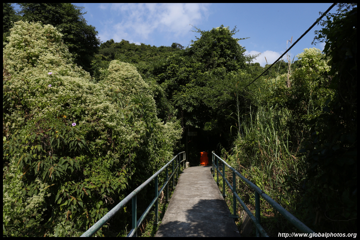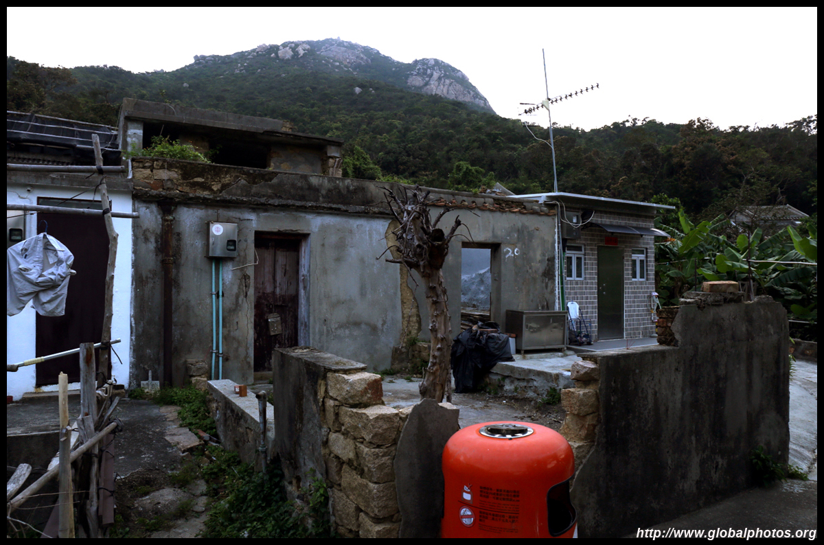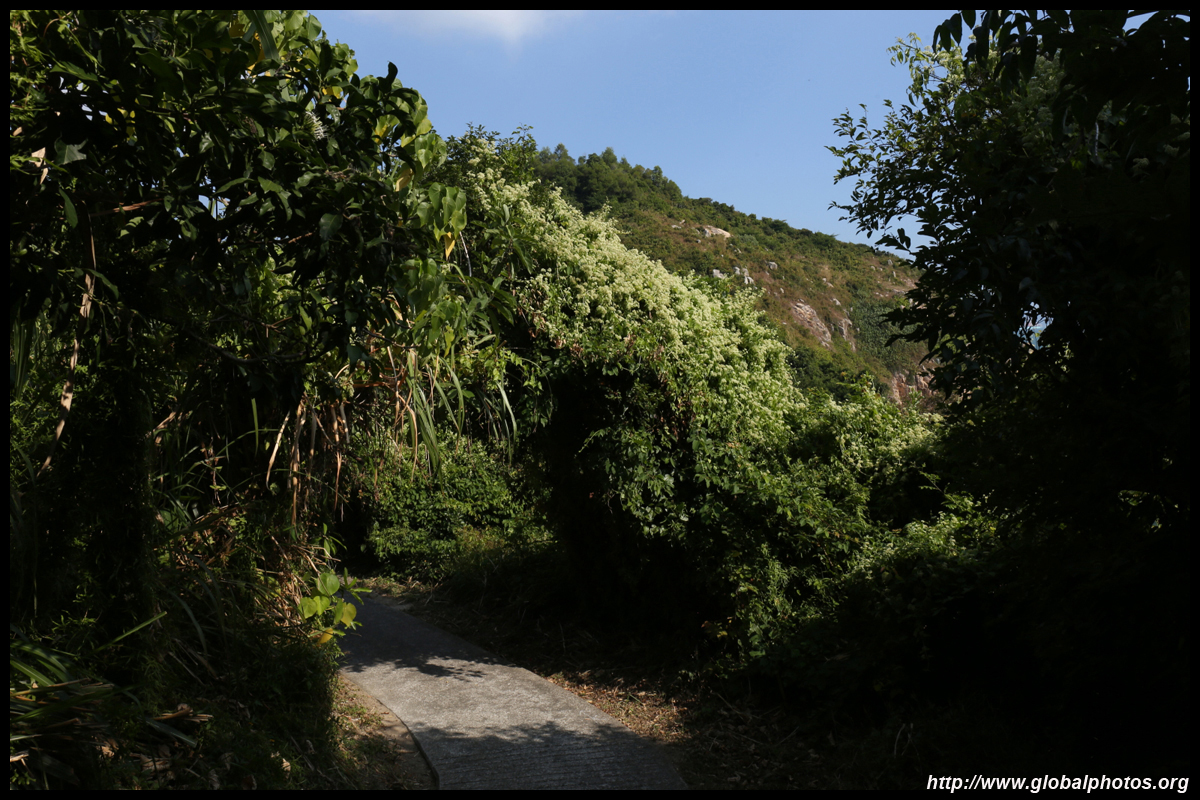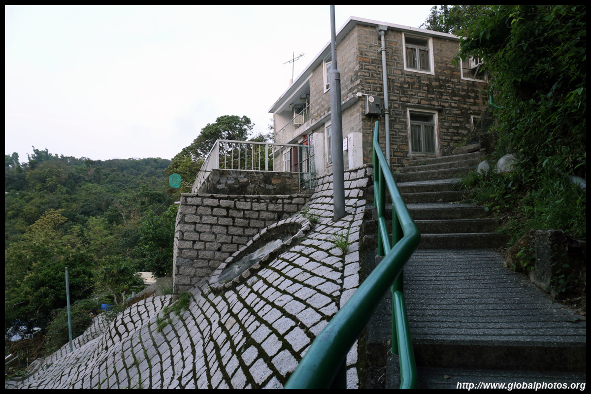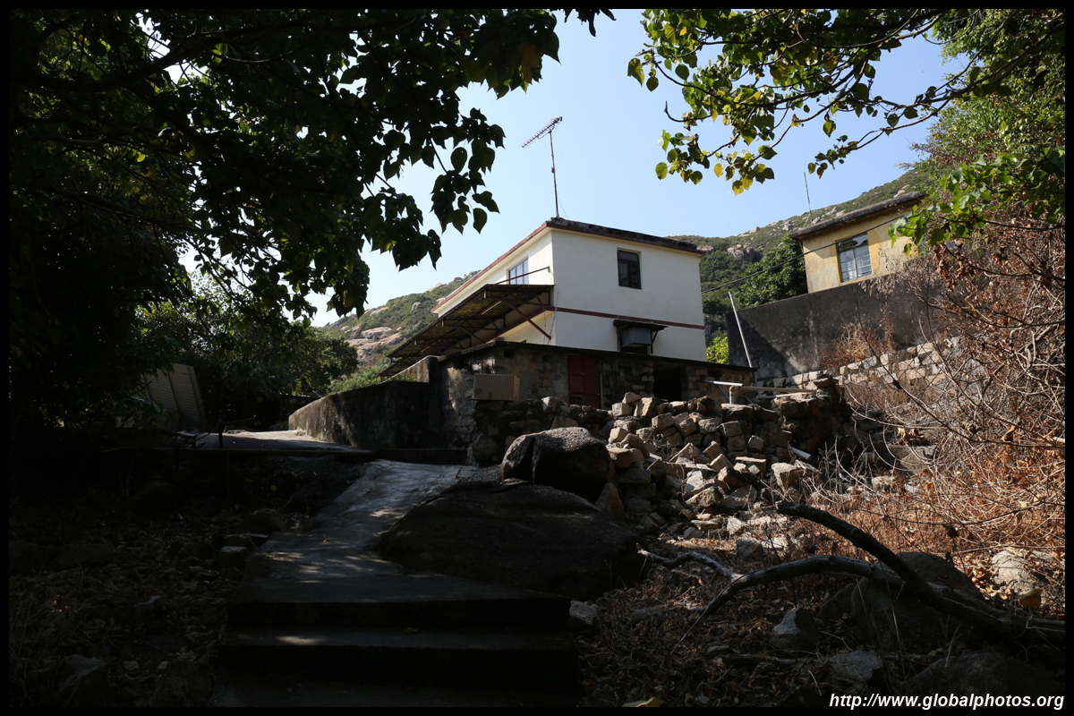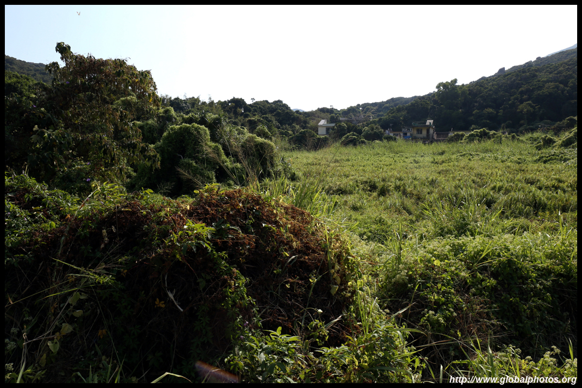 Heading further inland, the village extends along the slopes heading downhill to abandoned farms. Just past the last houses, beyond a river full of croaking frogs, is a public toilet with a staircase up some 250m to Ling Kok Shan.
