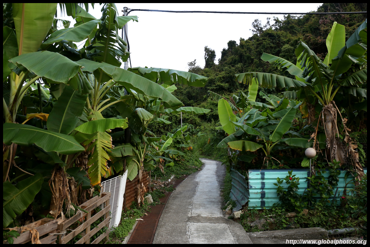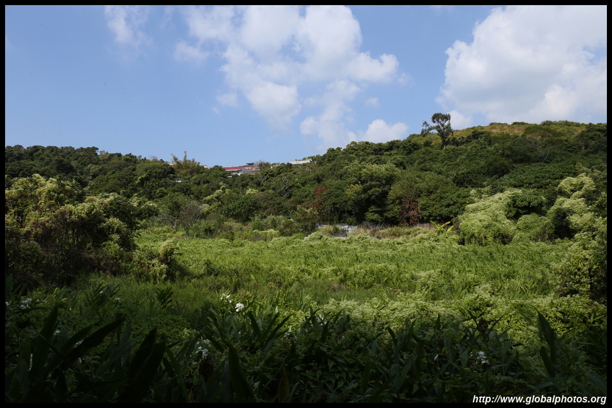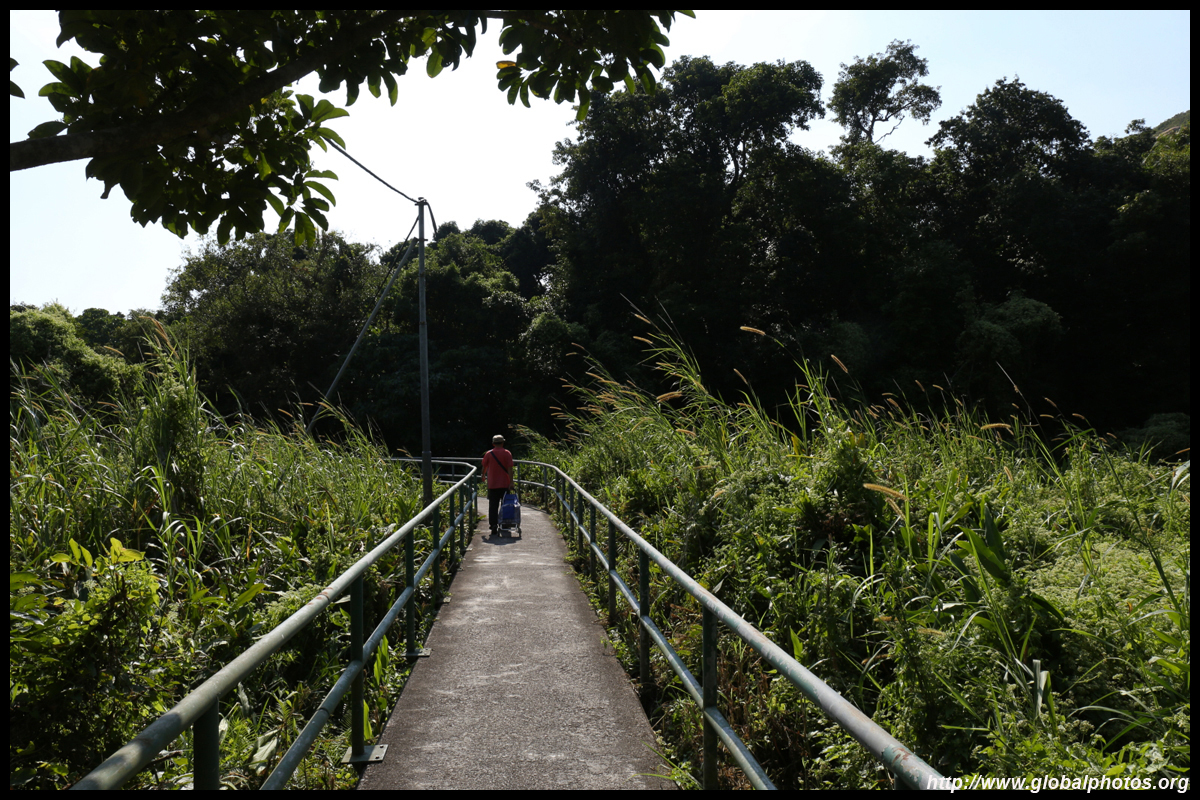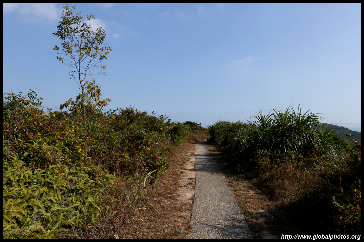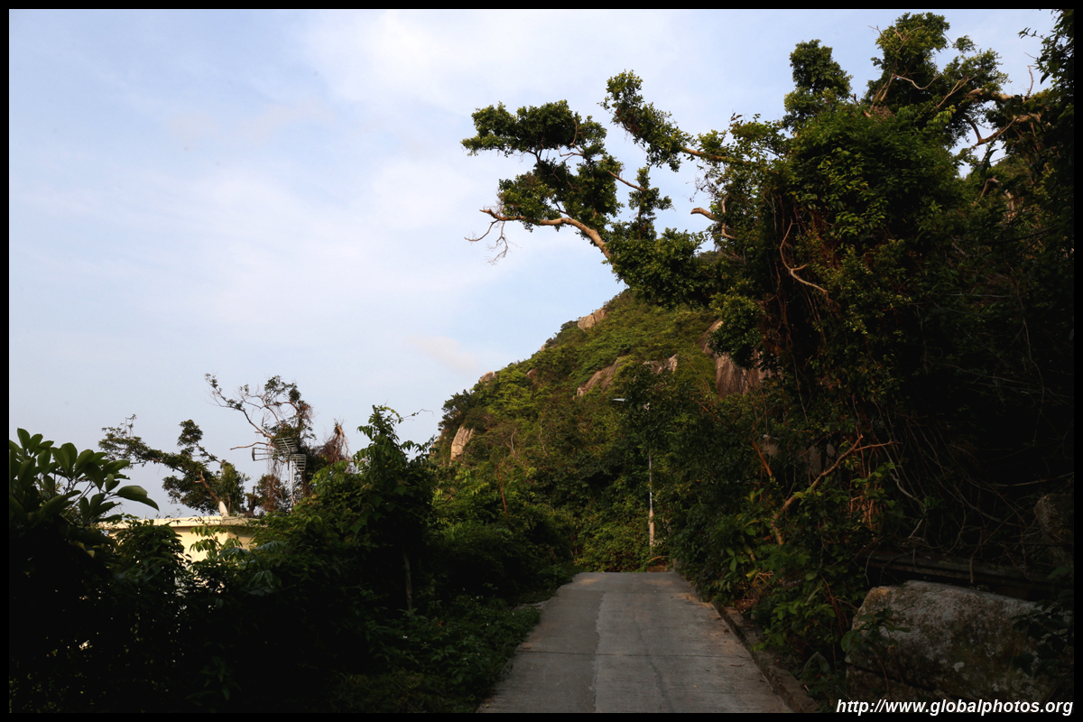 Heading further inland, the village extends along the slopes heading downhill to abandoned farms. Just past the last houses, beyond a river full of croaking frogs, is a public toilet with a staircase up some 250m to Ling Kok Shan.