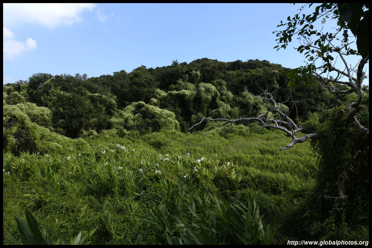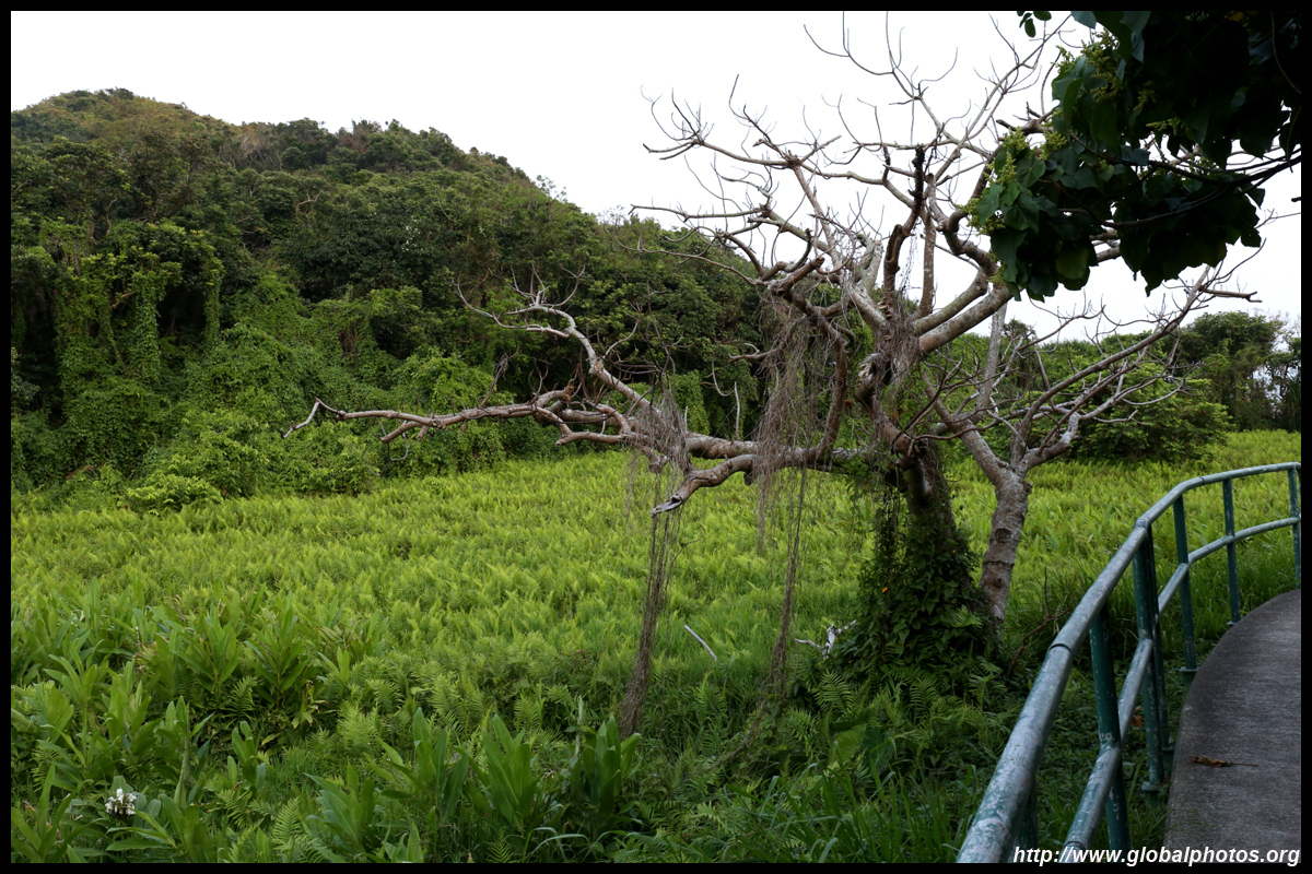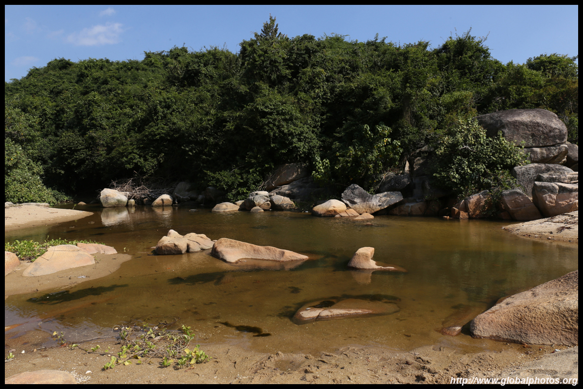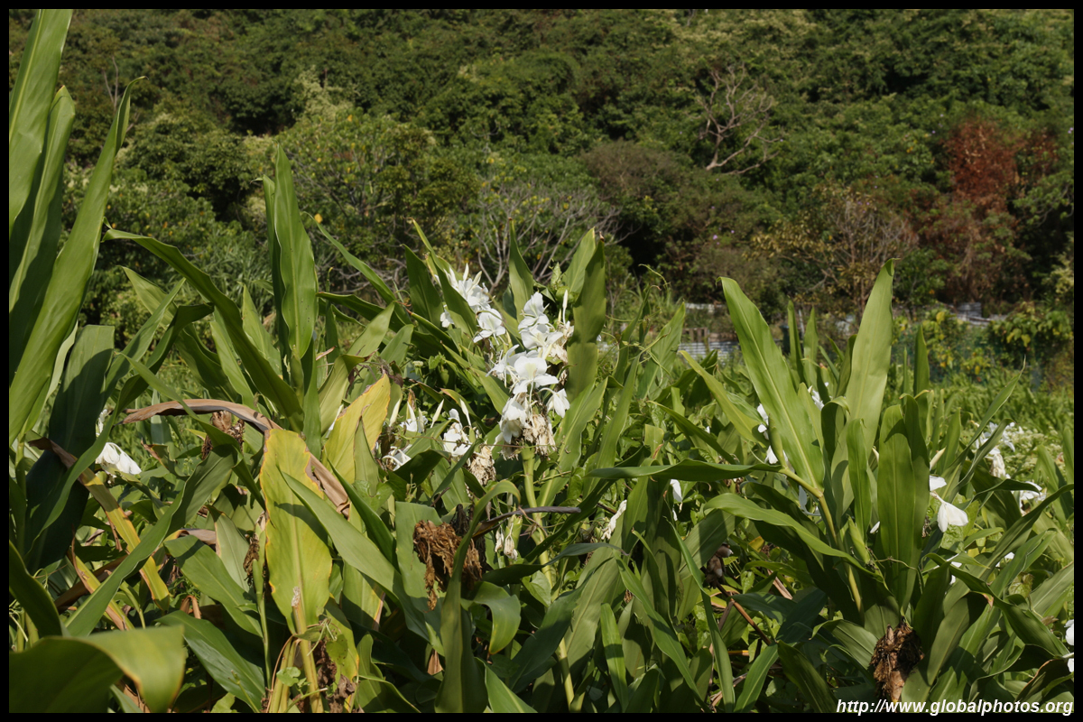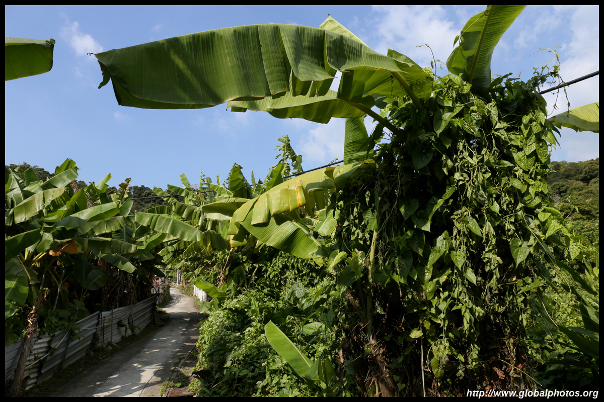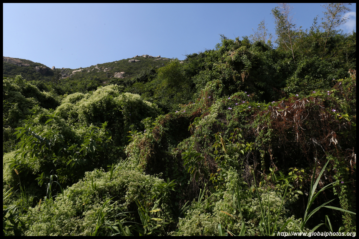 Heading further inland, the village extends along the slopes heading downhill to abandoned farms. Just past the last houses, beyond a river full of croaking frogs, is a public toilet with a staircase up some 250m to Ling Kok Shan.