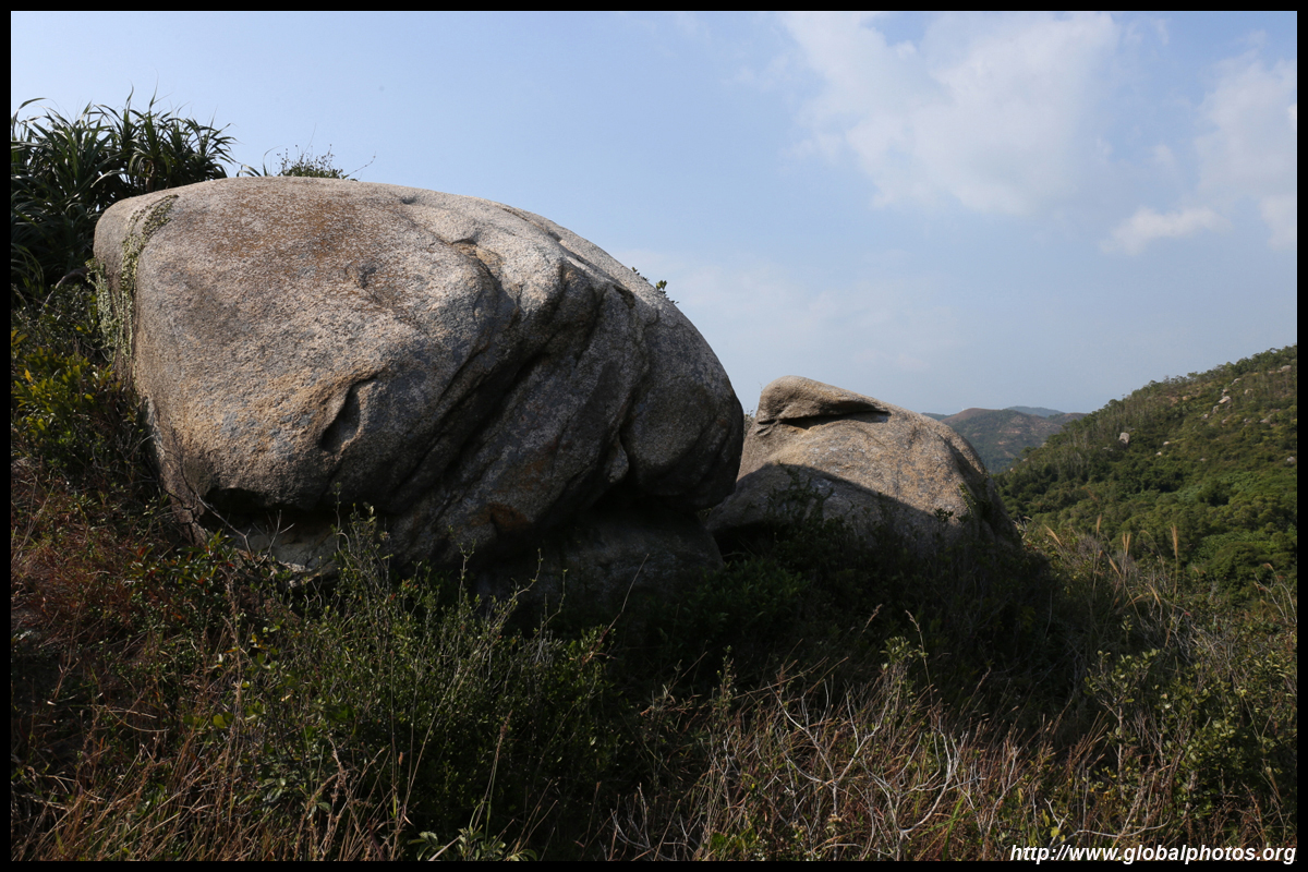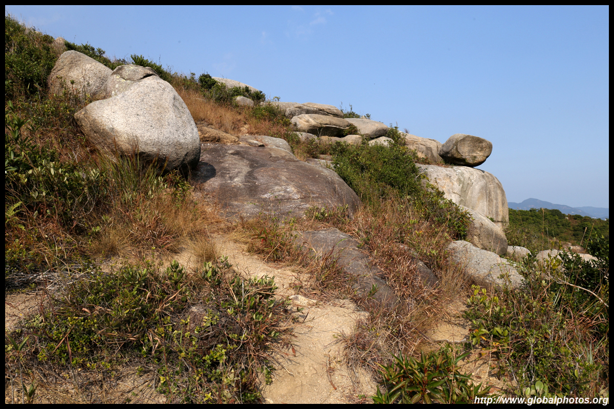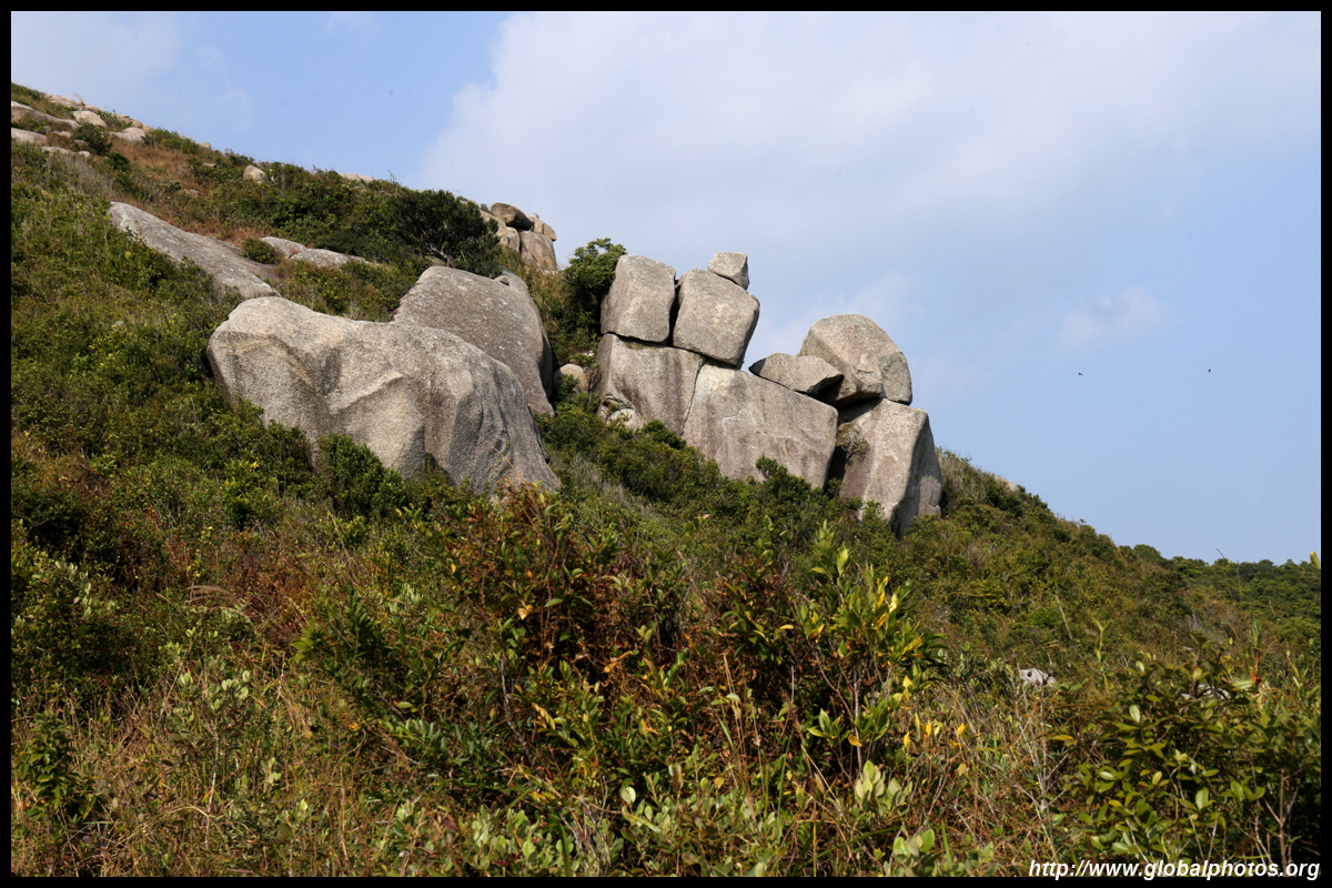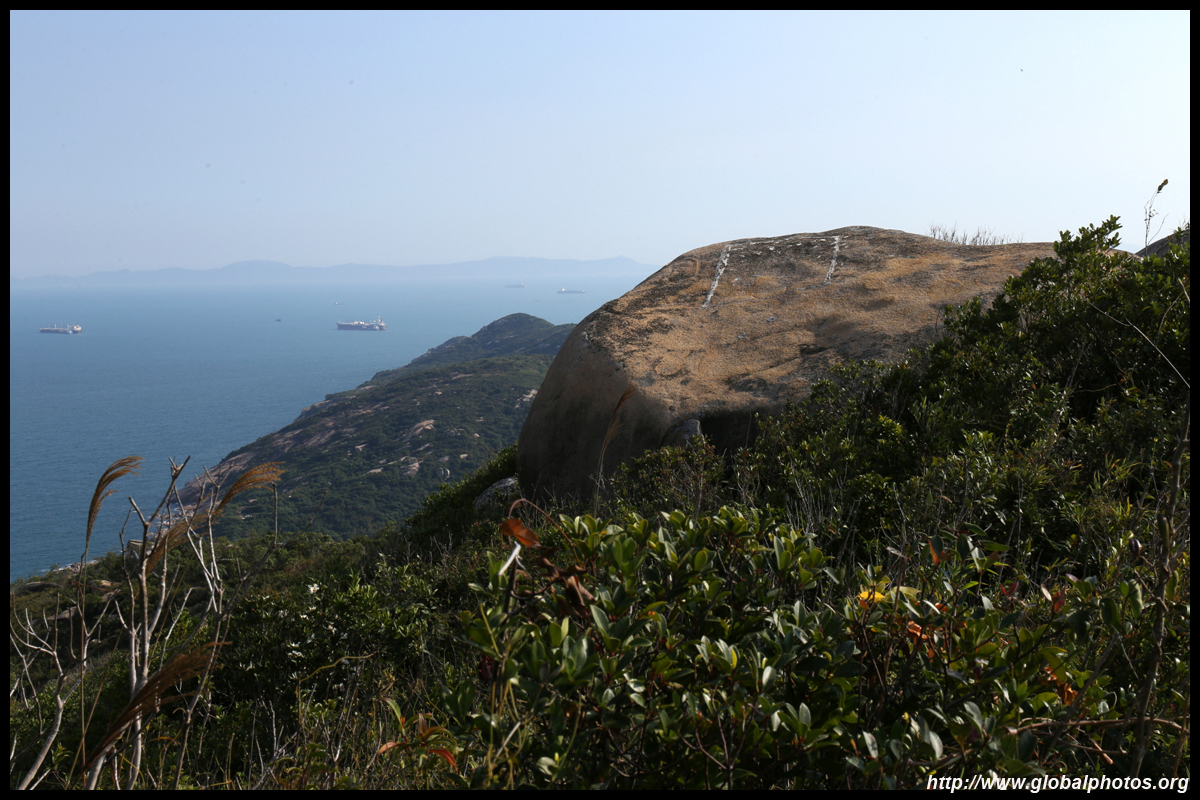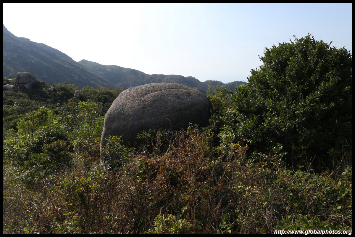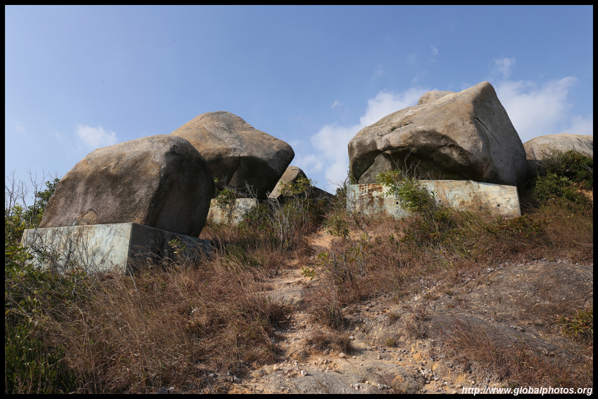After the pavilion break, head back down to the intersection and continue up the hill ahead. If you want to give up at this point, the path on the left leads back to Sok Kwu Wan downhill. As you climb further to Ling Kok Shan, you will notice a number of large rocks hanging precariously along the hillsides They have been secured with concrete bases to prevent any surprises from rolling downhill.