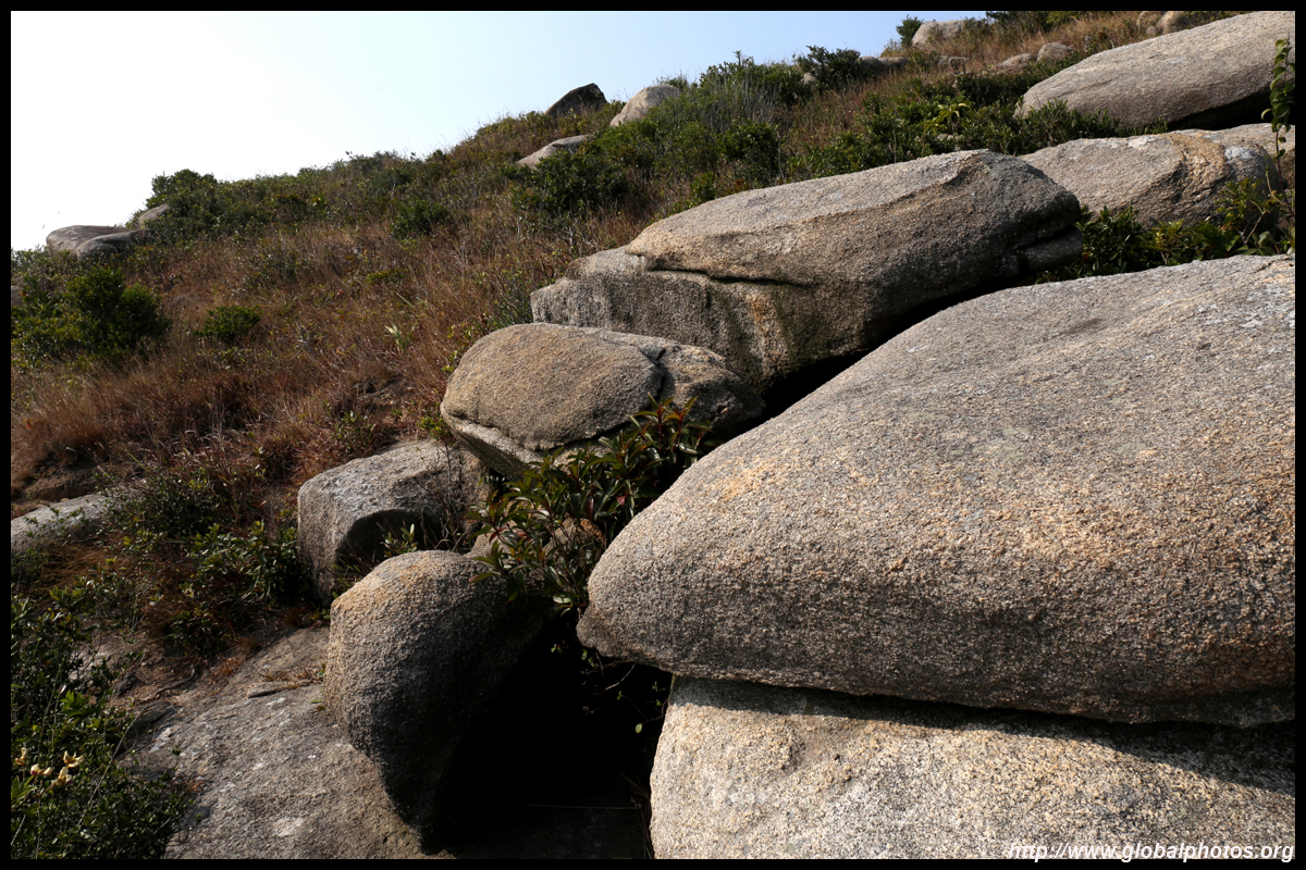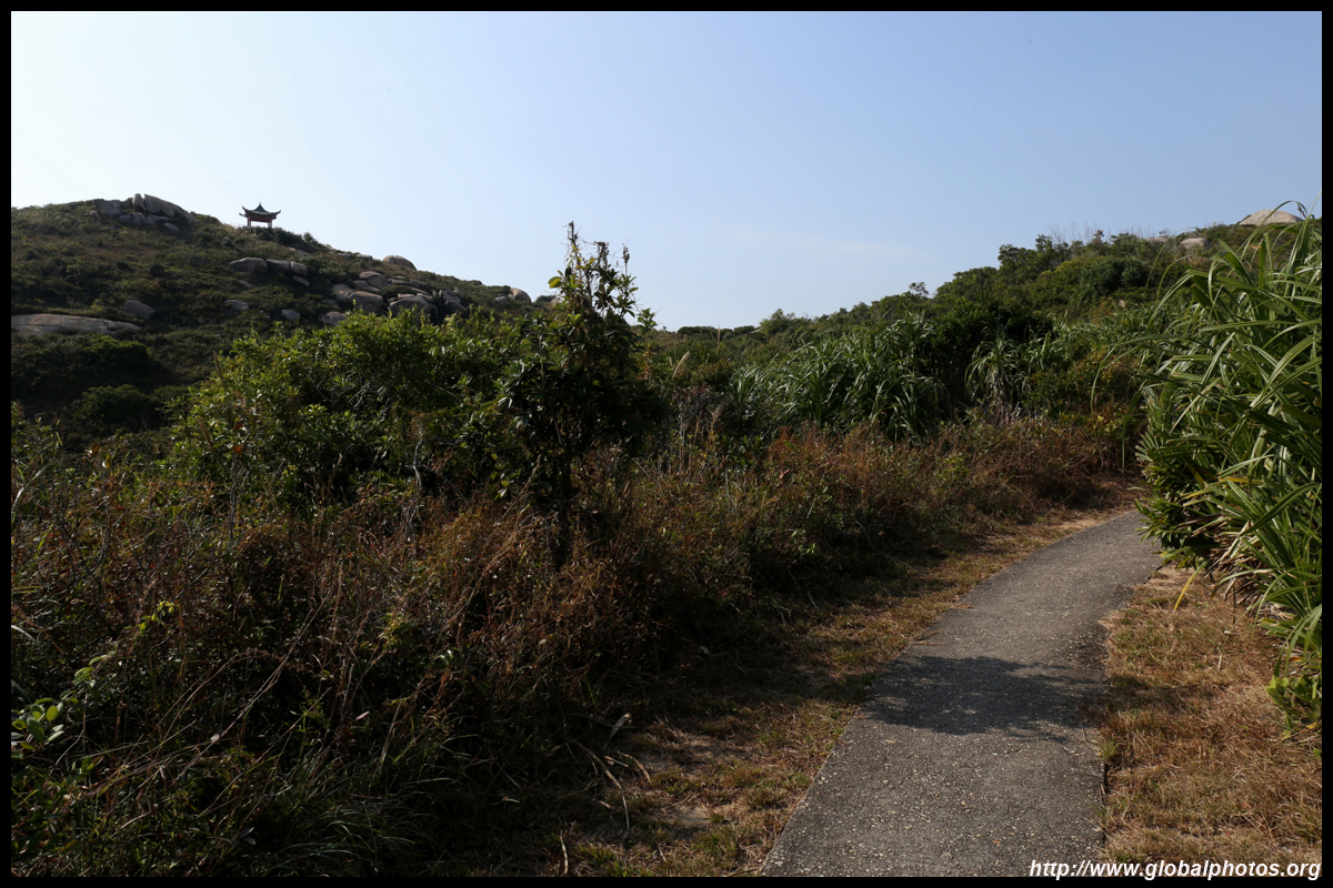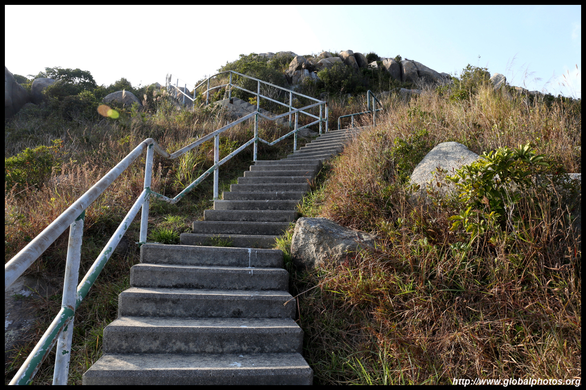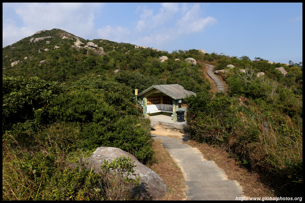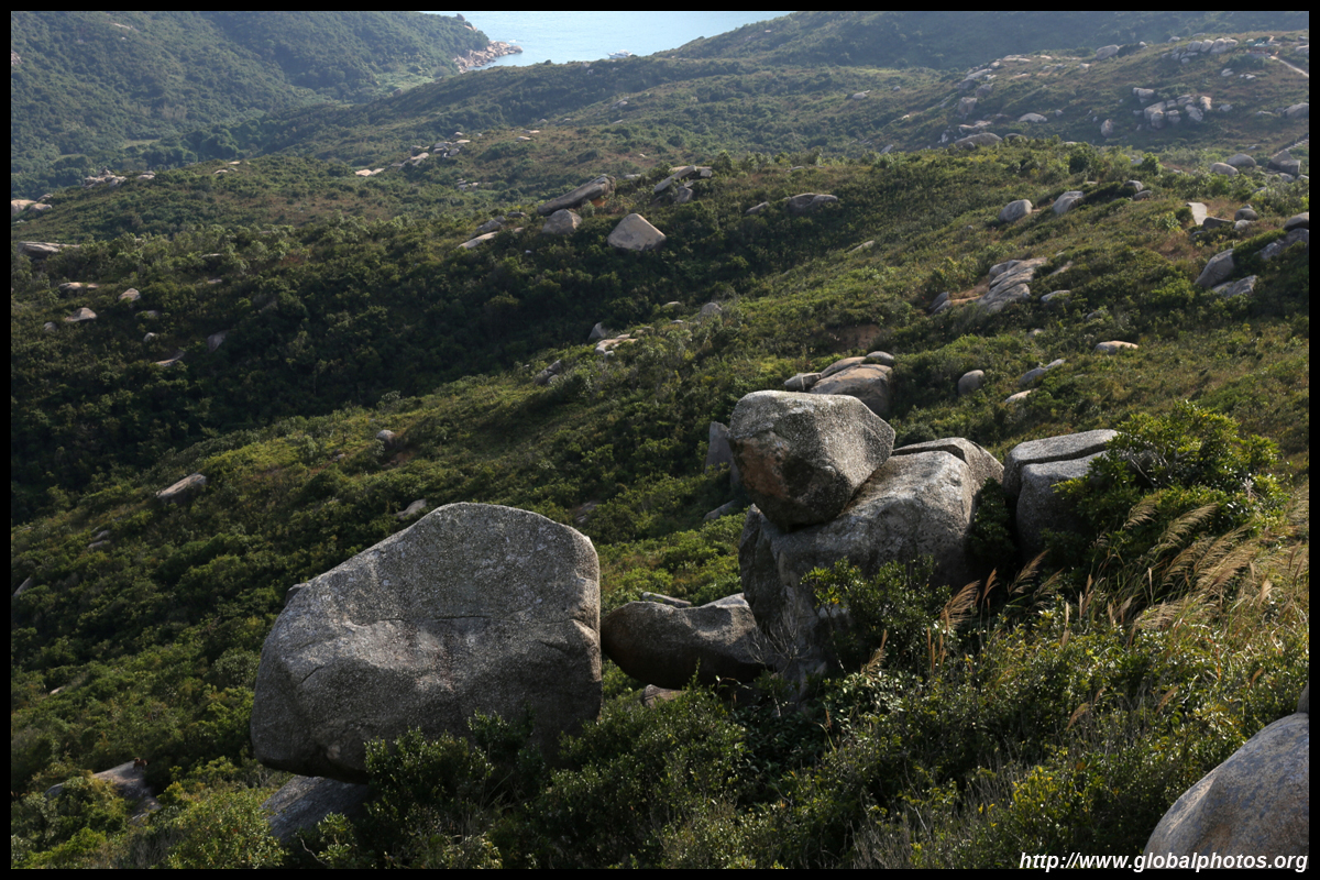 After the pavilion break, head back down to the intersection and continue up the hill ahead. If you want to give up at this point, the path on the left leads back to Sok Kwu Wan downhill. As you climb further to Ling Kok Shan, you will notice a number of large rocks hanging precariously along the hillsides They have been secured with concrete bases to prevent any surprises from rolling downhill.