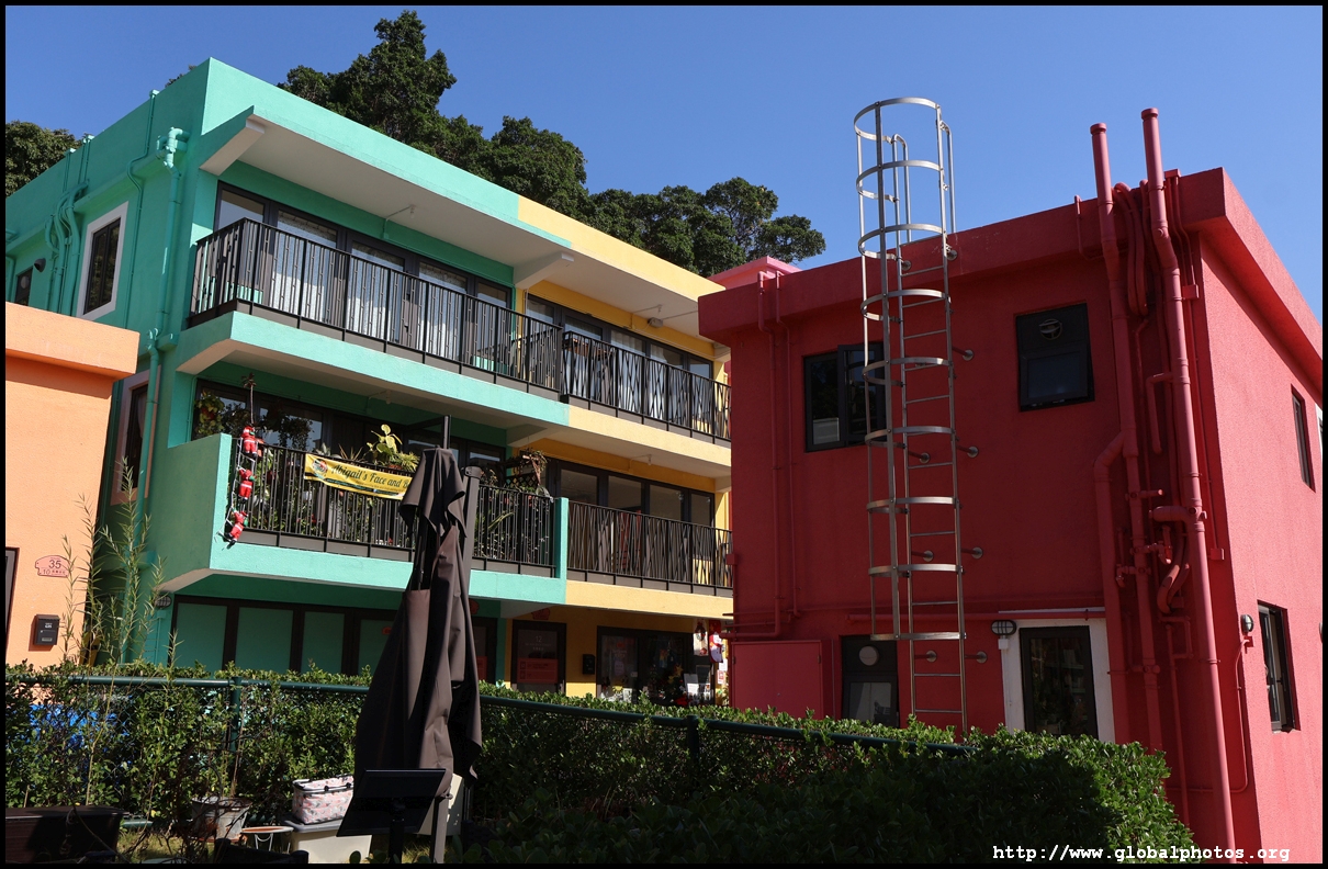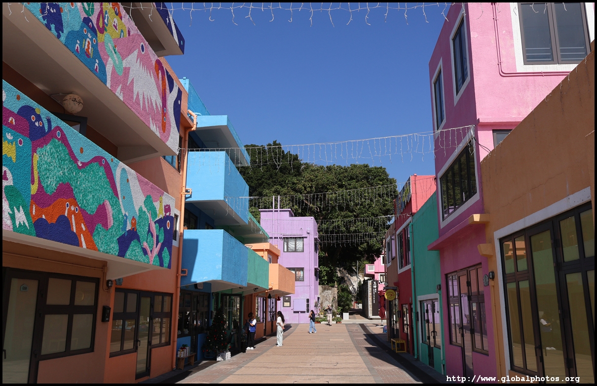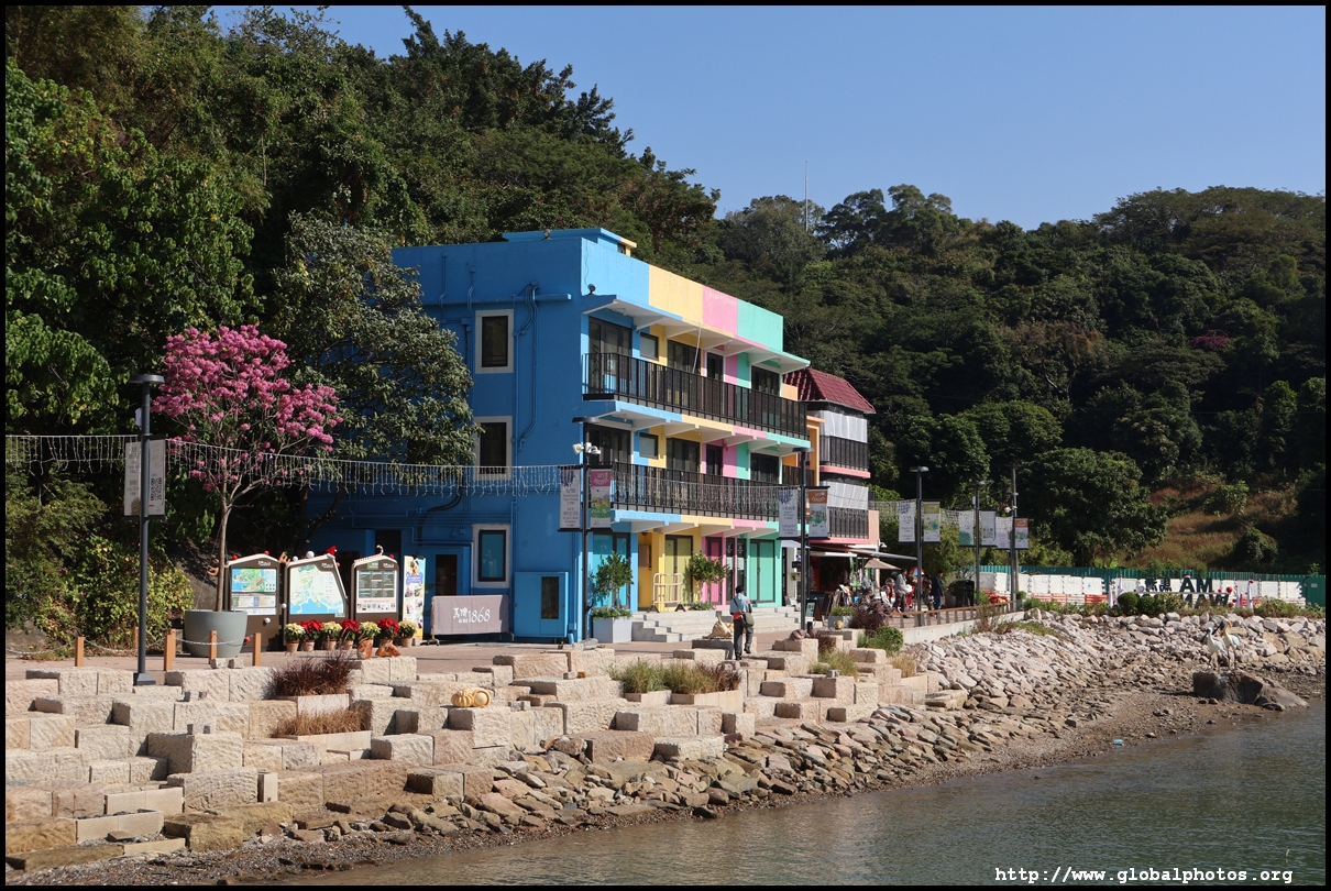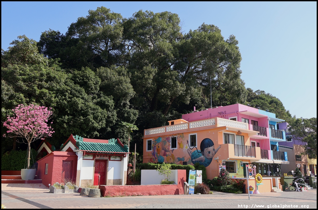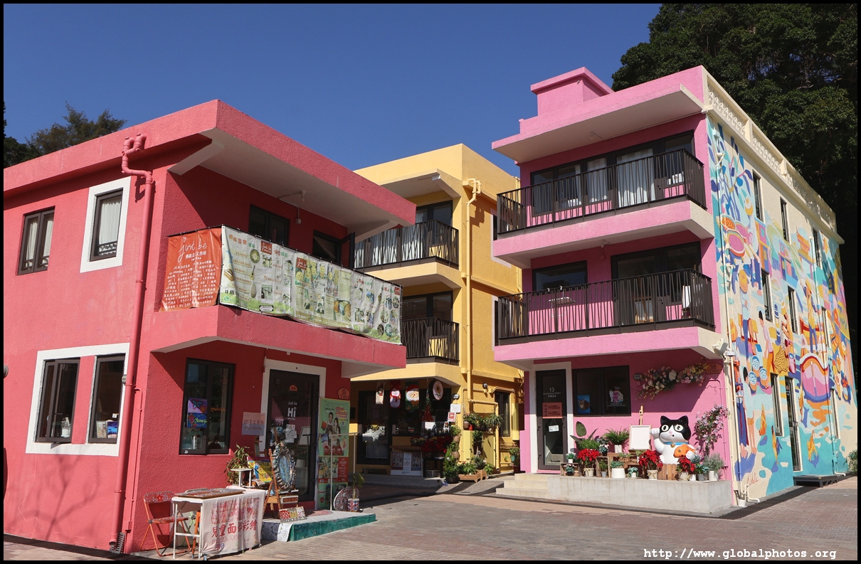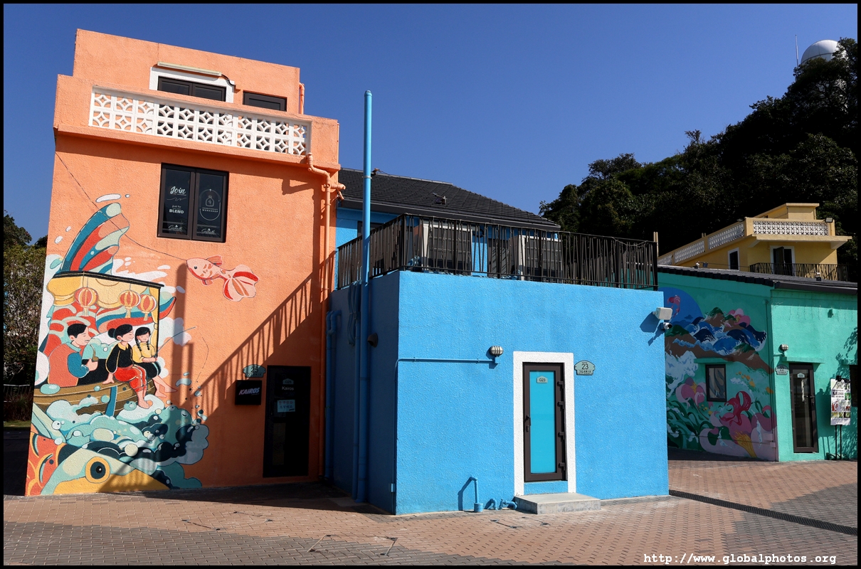 Ma Wan was once a quiet island just off Lantau where fishing was the main deal. That all changed when the new airport was built and as part of the transport infrastructure to serve it, a huge suspension bridge crossed here.Hundreds of villagers were resettled out of their original homes in 1997 to make way for a private developer to build a tourism and cultural facility. That plan stalled for over 20 years but finally opened in March 2025, turning the former village buildings into a Disneyland-like theme park with a new coat of colourful paint. I walked into the site along Fong Yuen Road to find the Ma Wan Heritage Centre. This was previously a study hall that was established in 1956 and now houses artifacts from archaeological excavations during the 1990s. Ruins of a lime kiln from the Tang Dynasty as well as a brick kiln from the more recent Qing Dynasty were found. After a short visit, I continued downhill along the path towards the sea. Soon, I could spot the repainted houses in all sorts of bright colours. Only a small number were open with shops and a large number of buildings were closed.