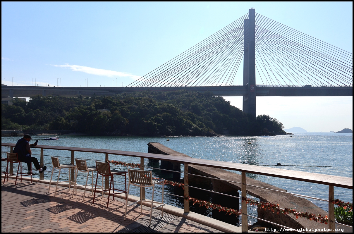 Tables and chairs have been set up along the waterfront to enjoy the bridge and sea views. There is a very small beach but I don't think these waters are swimmable.