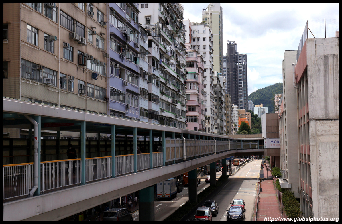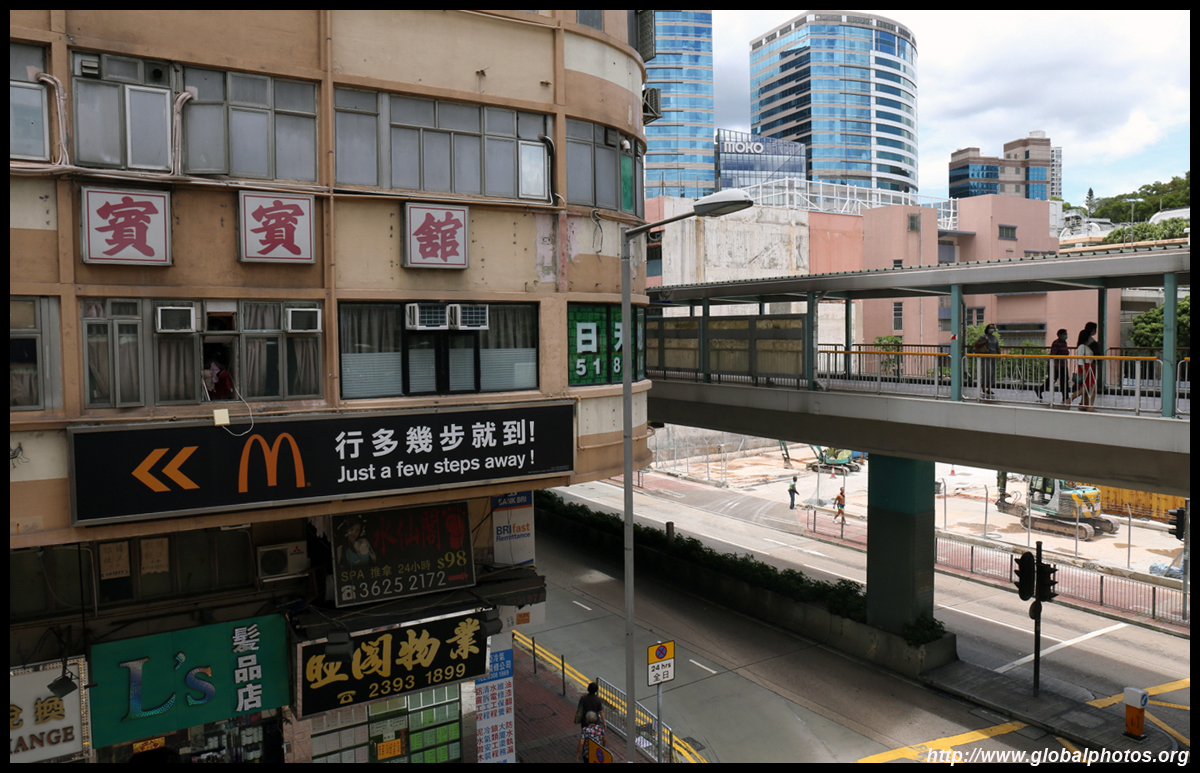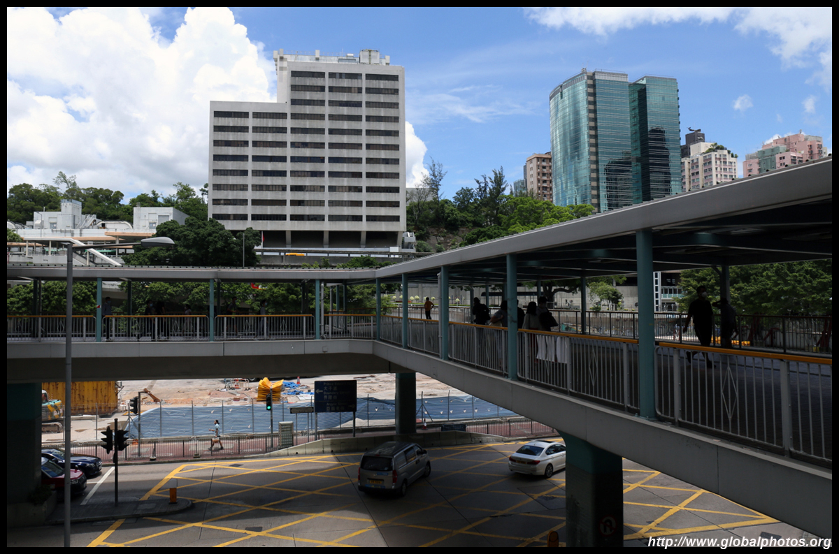 A pedestrian bridge looms above Mong Kok Road and is being extended about 100m past Nathan Road. However, it has taken 10 years to build and is expected to open in 2021.