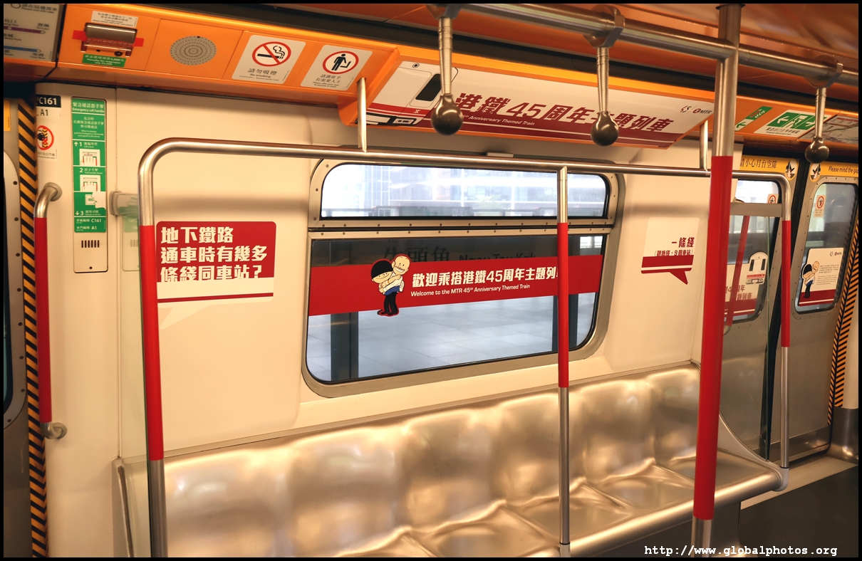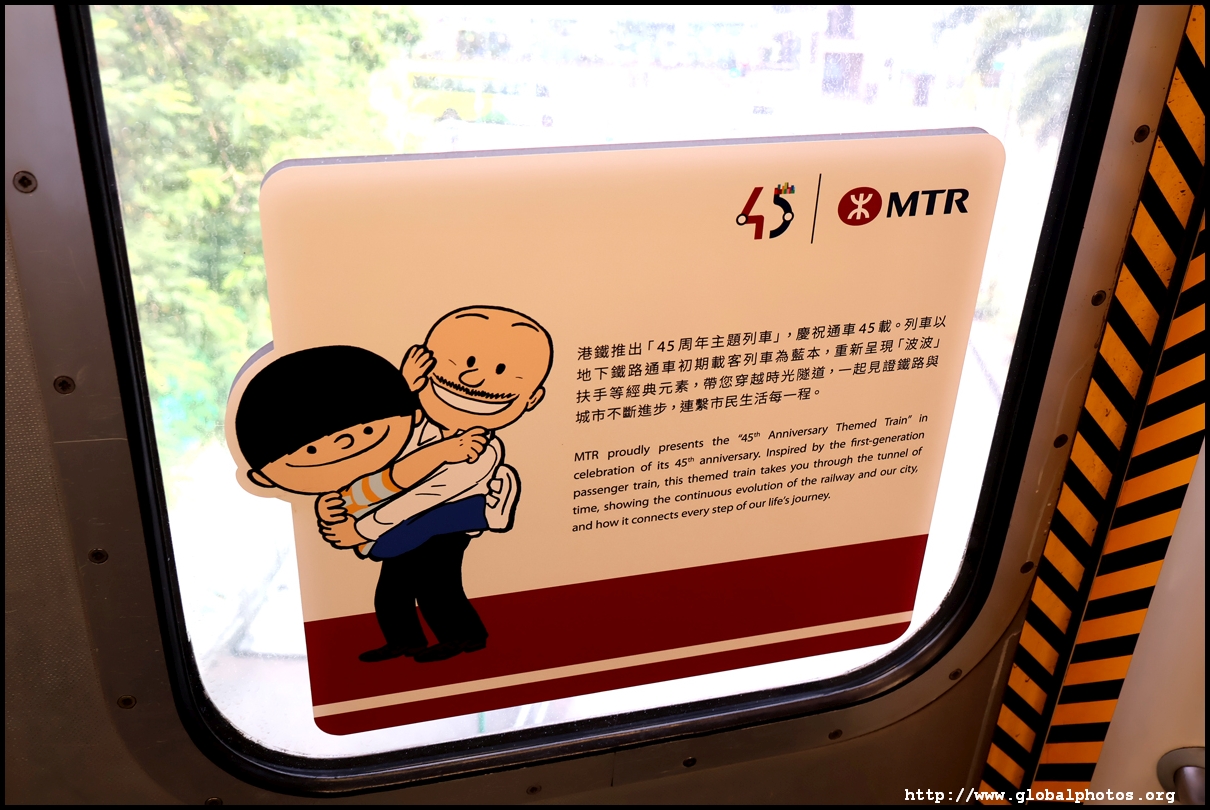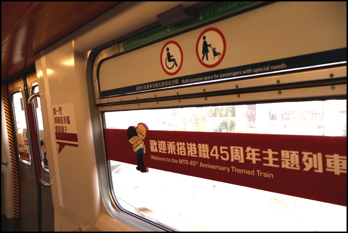 As part of the MTR's 45th anniversary celebrations, the company launched a special train draped in its old livery in August 2024. The classic train mimicks the first generation rolling stock on the network with a red and white exterior, ball-shaped straphangers, and orange-yellow interior ceilings.The MTR opened in 1979 with 1 line serving 9 stations.