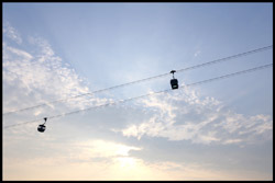 The path becomes much better paved beneath the cable car. It will then rise and fall through the rugged geography.