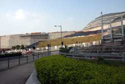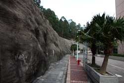 One side of these buildings face the valley, and a small walled park runs along the border between the buildings and the steep incline.