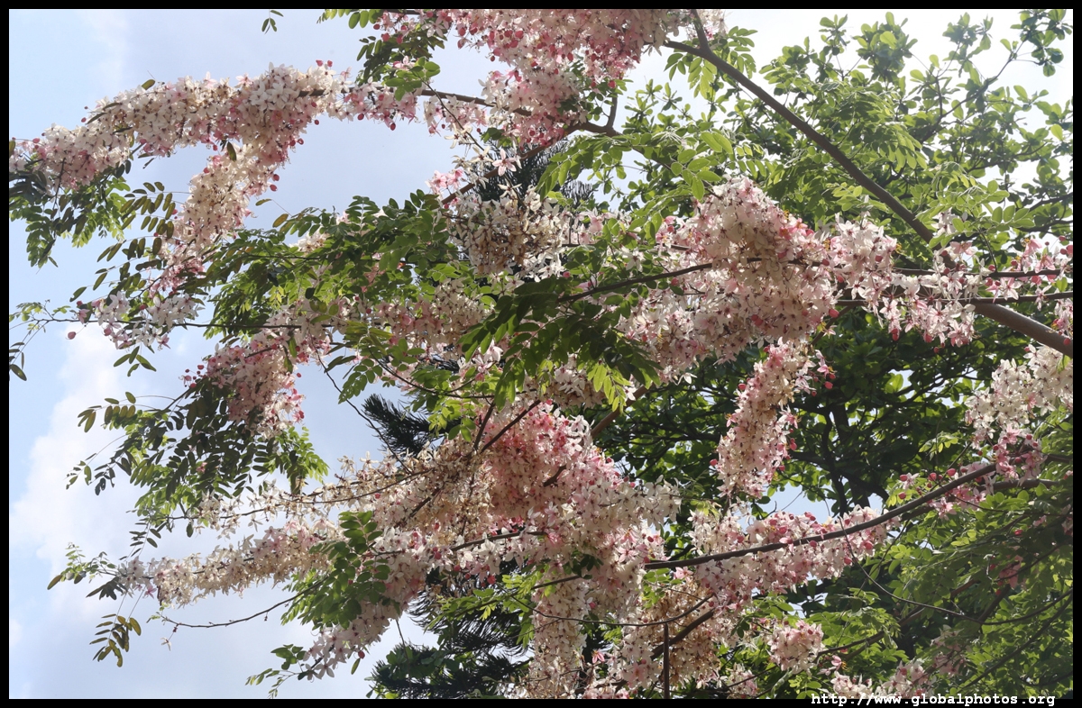 A lone Pink and White Shower tree, a rare species in the city, blooms in Cherry Street Park.