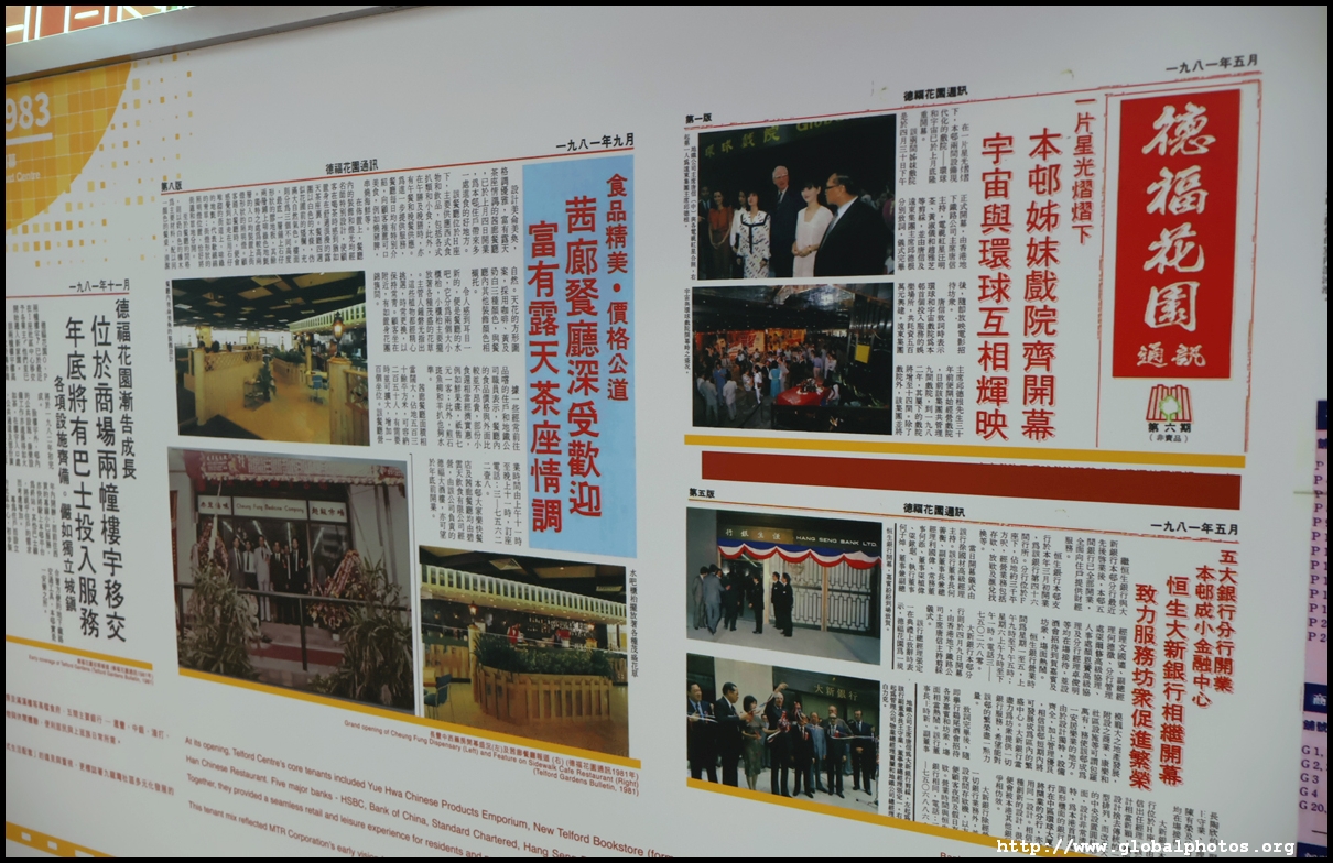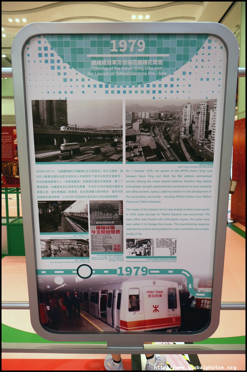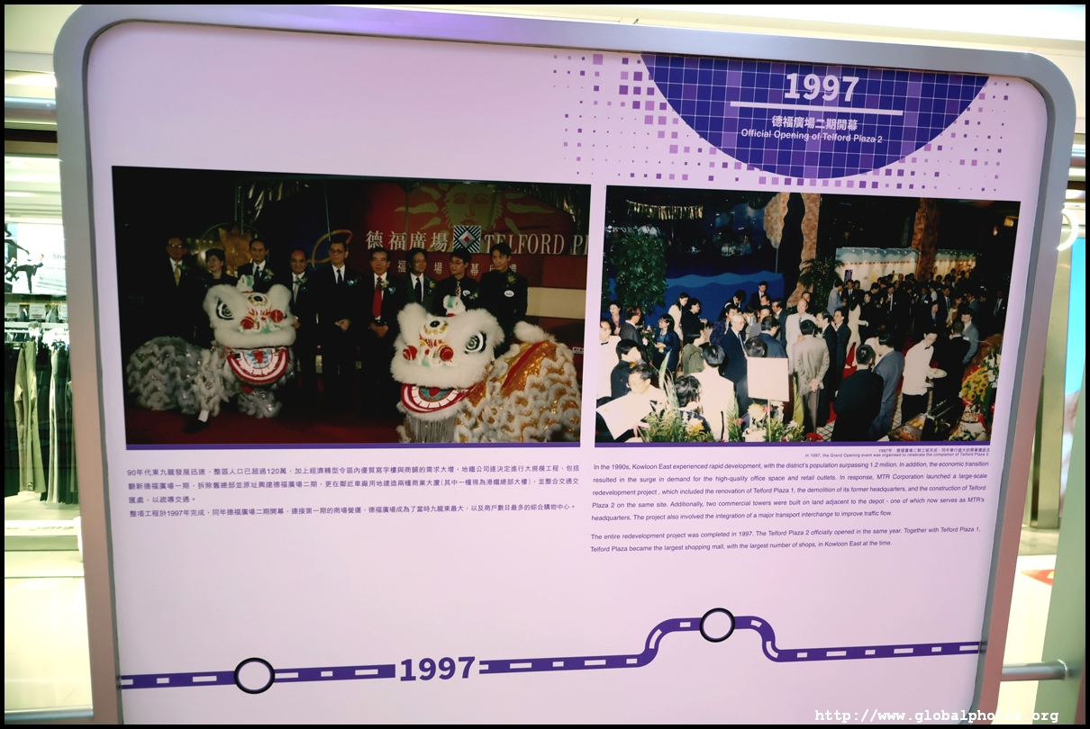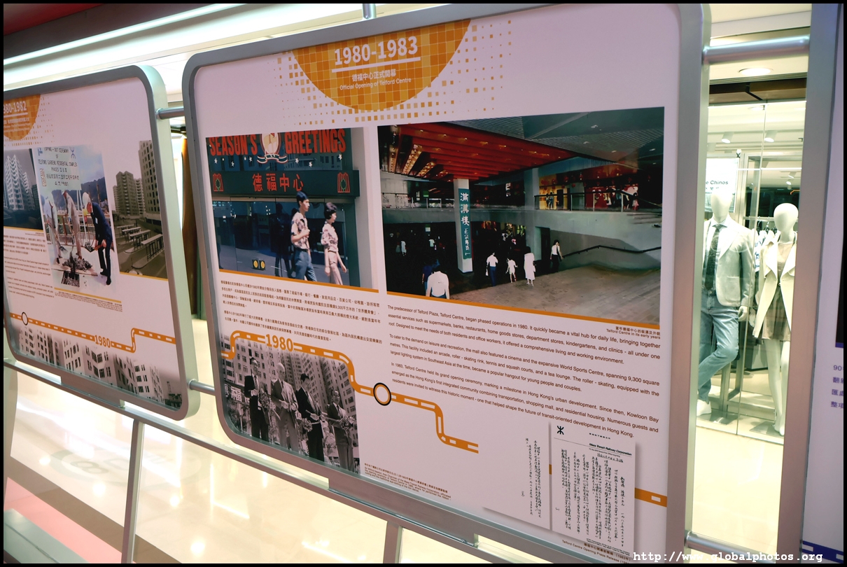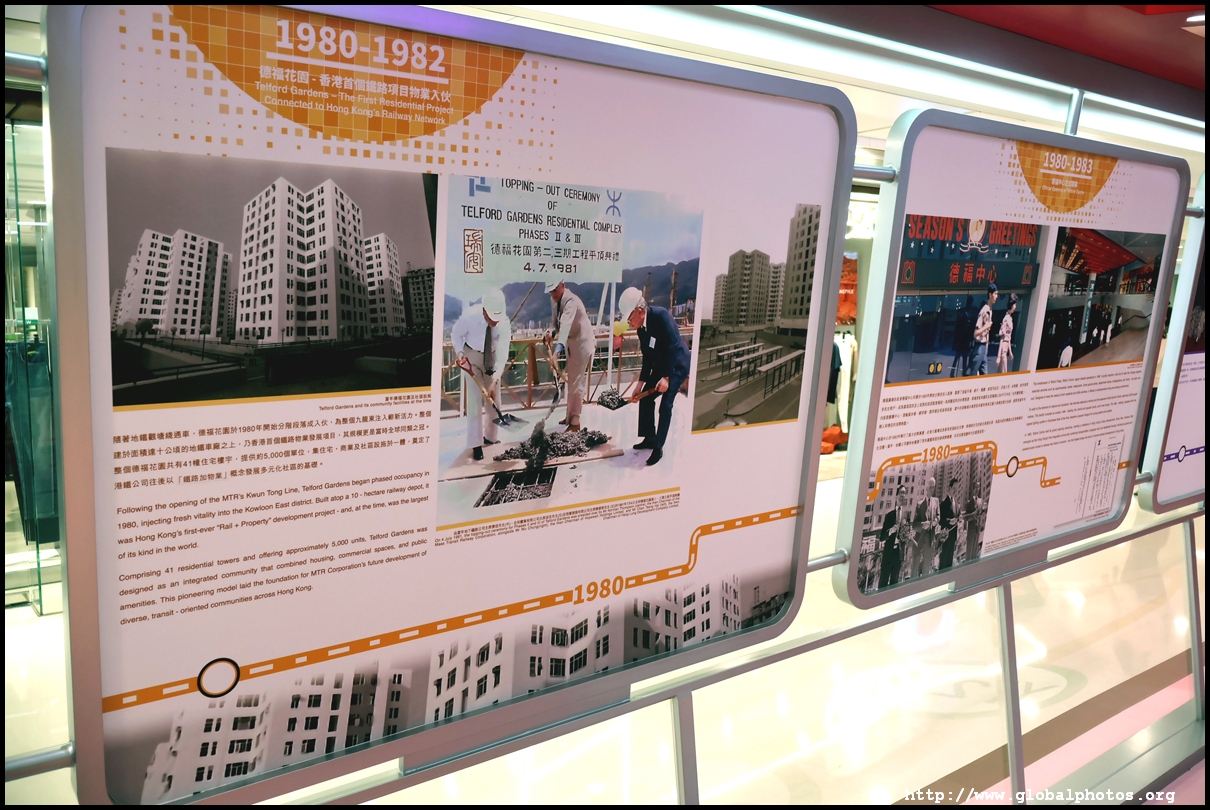 To celebrate Telford Plaza's 45 the anniversary, the MTR has hosted an exhibition about its history. This is the company's first property development, built in the early 1980s as an integrated model of shopping centre and residences above, all above the railway depot.The Kwun Tong Line first opened in 1979 from Shek Kip Mei to Kwun Tong, passing through this area. The first residents moved into Telford Gardens a year later, and the project would comprise 41 residential towers with about 5000 units. This type of integrated property development was repeated across many stations subsequently.
