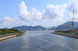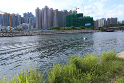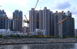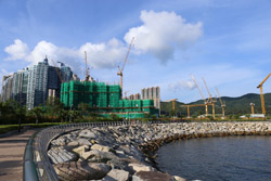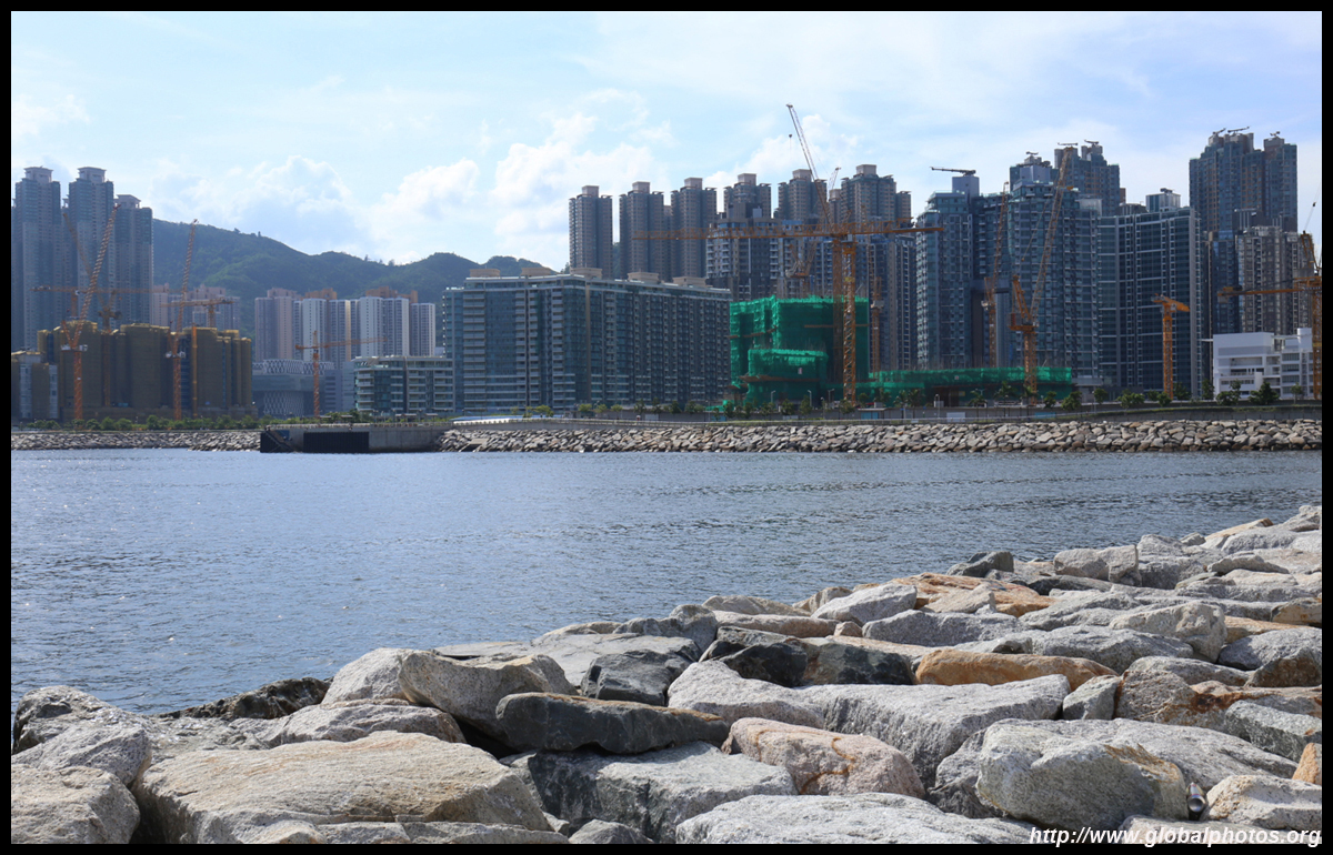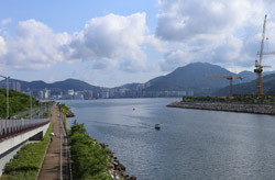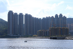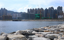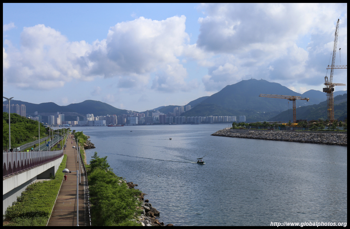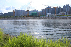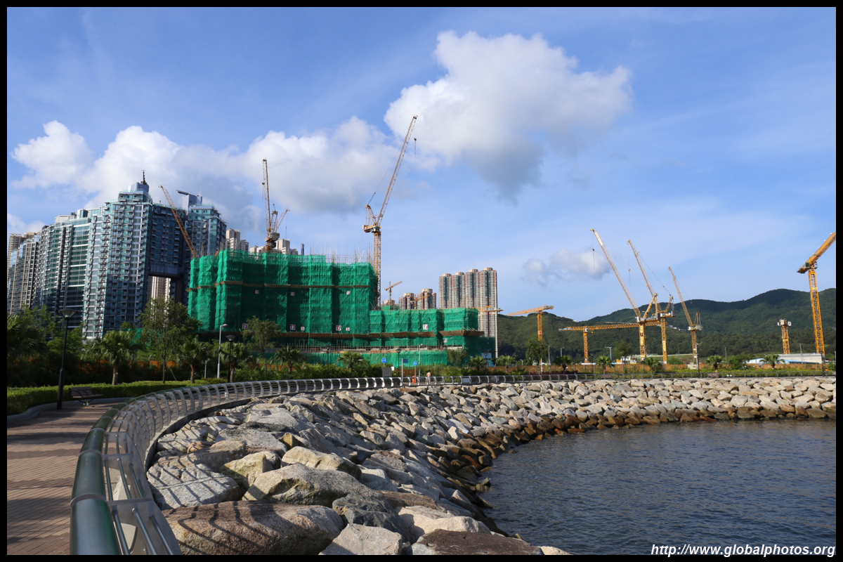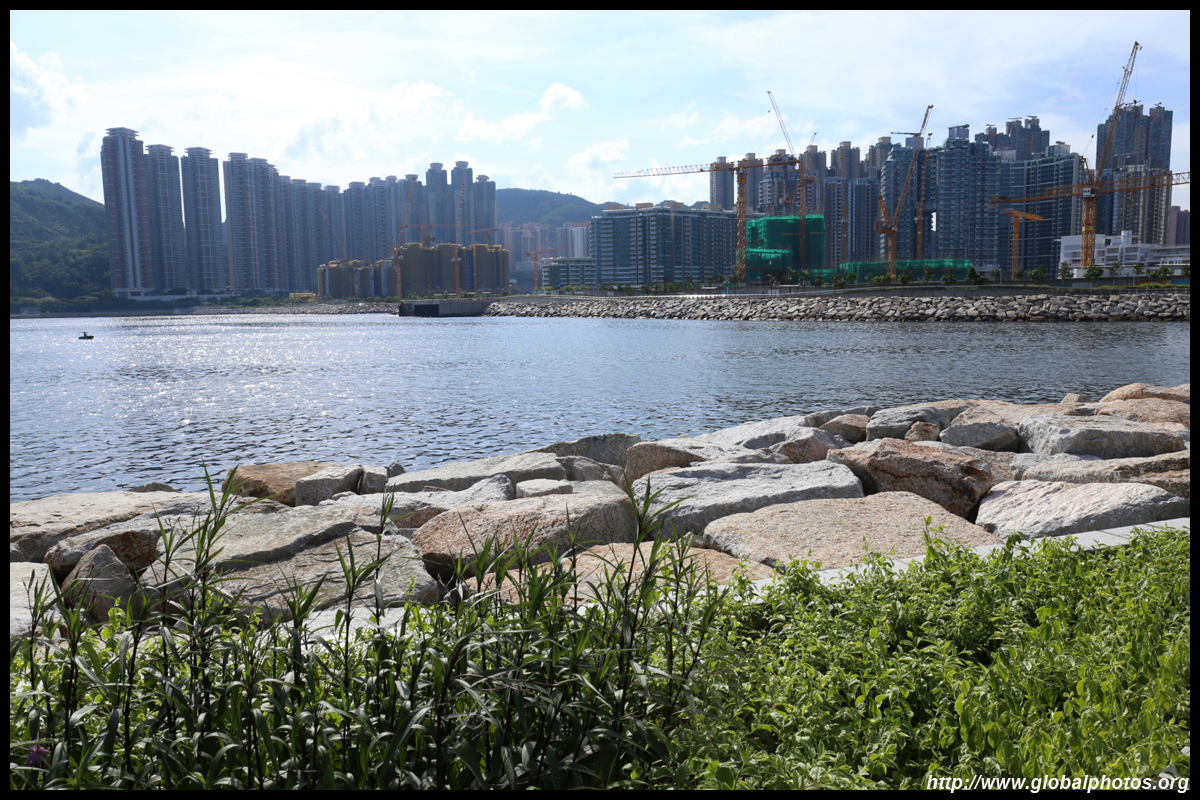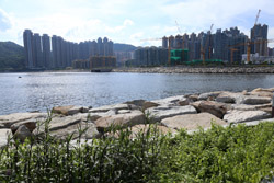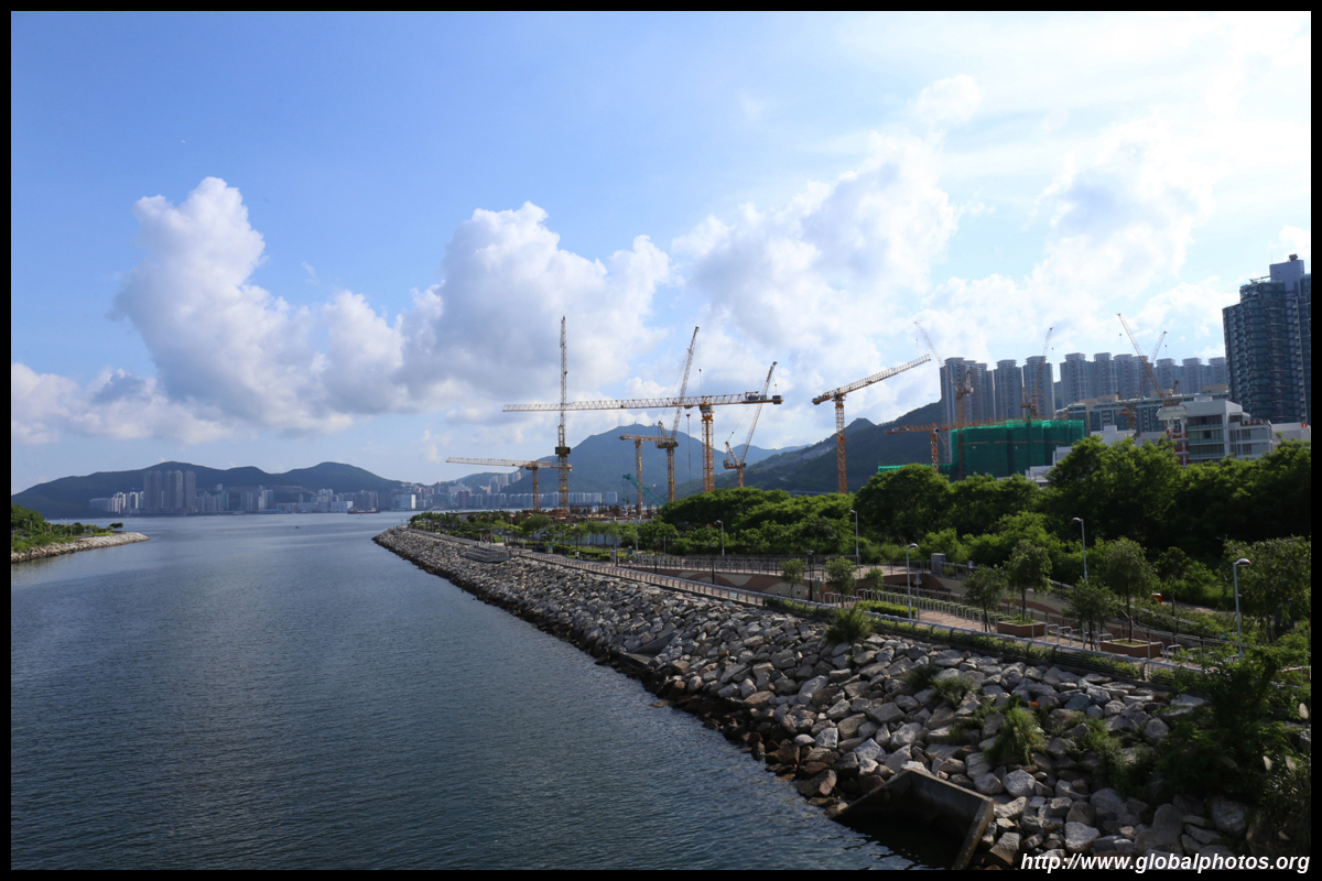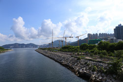 The new town is built mainly by reclaiming Tseung Kwan O Bay starting in 1983 and forming platforms on both sides of a long narrow inlet.