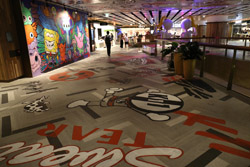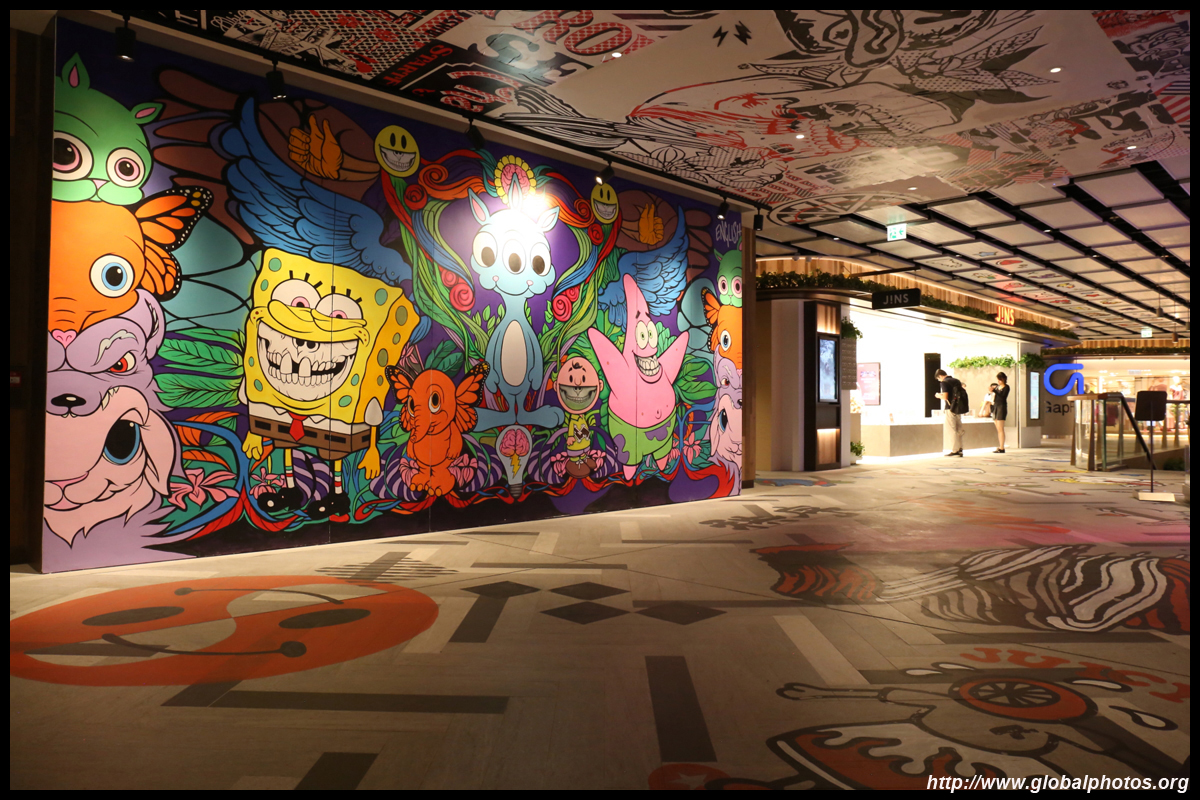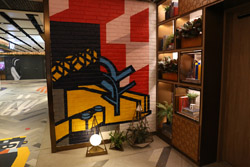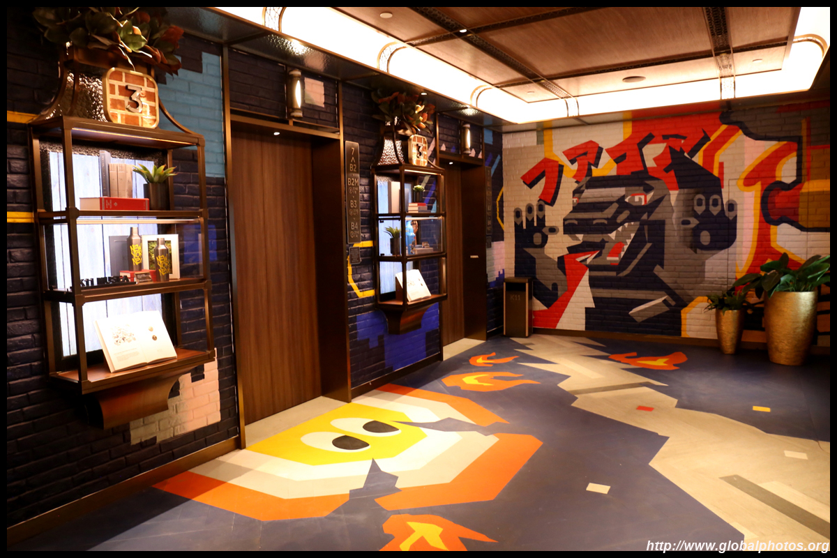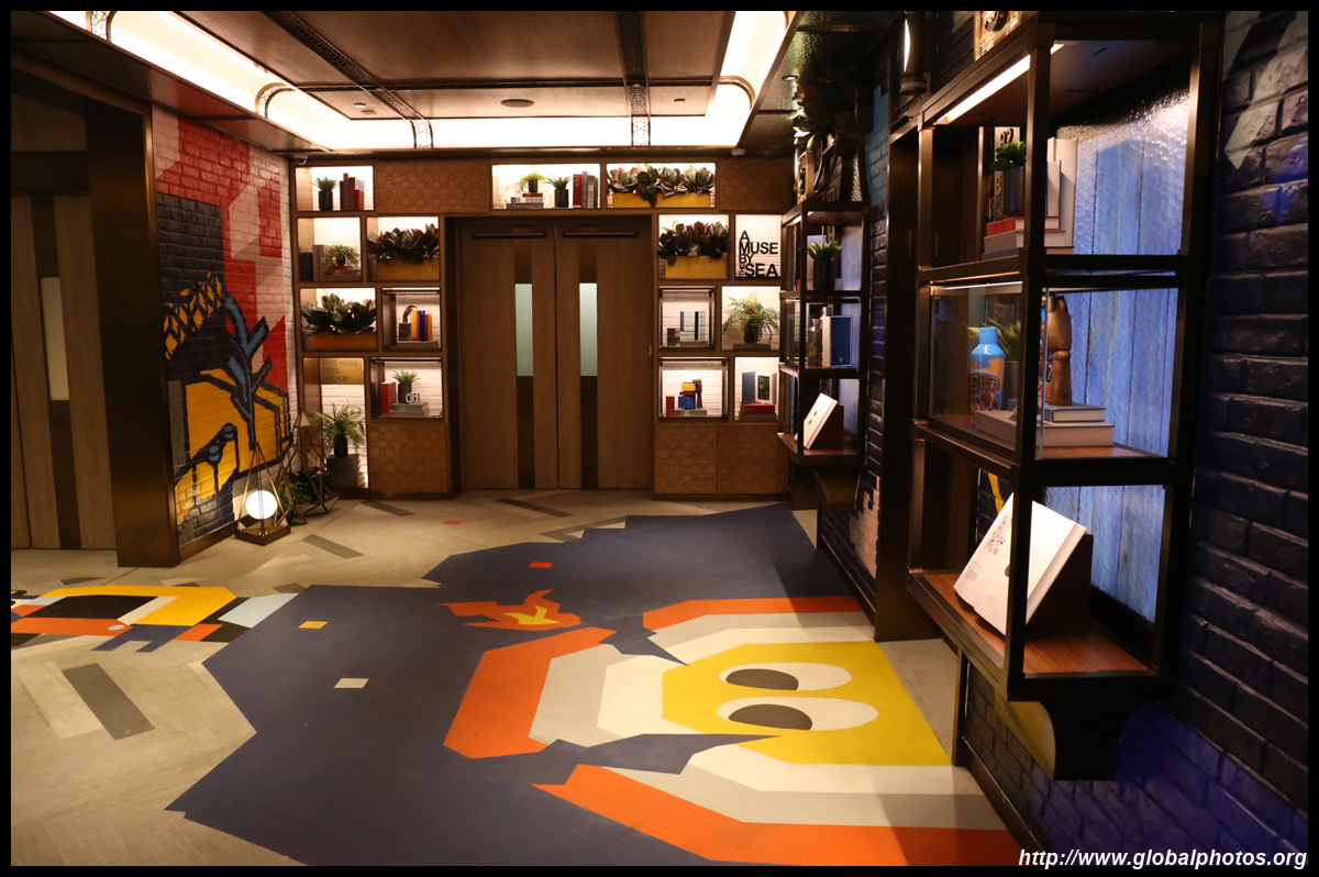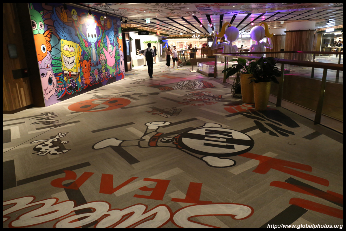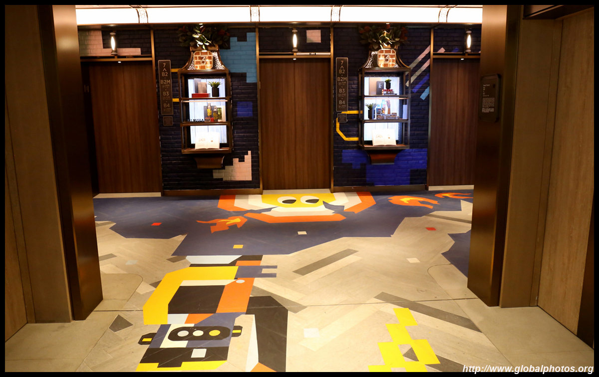 Each floor has a particular theme, with this one showcasing street culture. Notice the iconography on the floors.