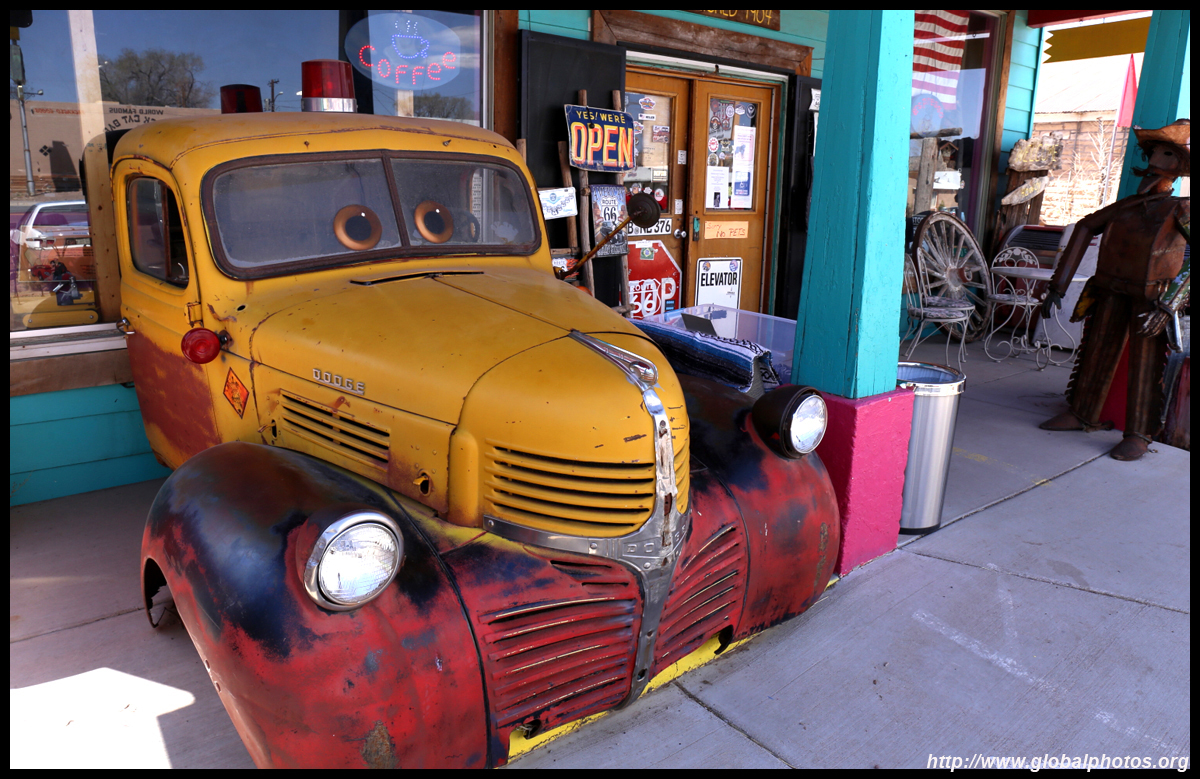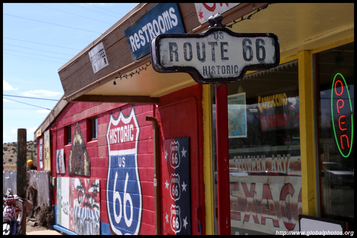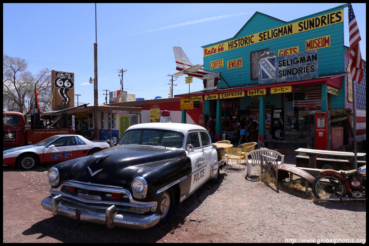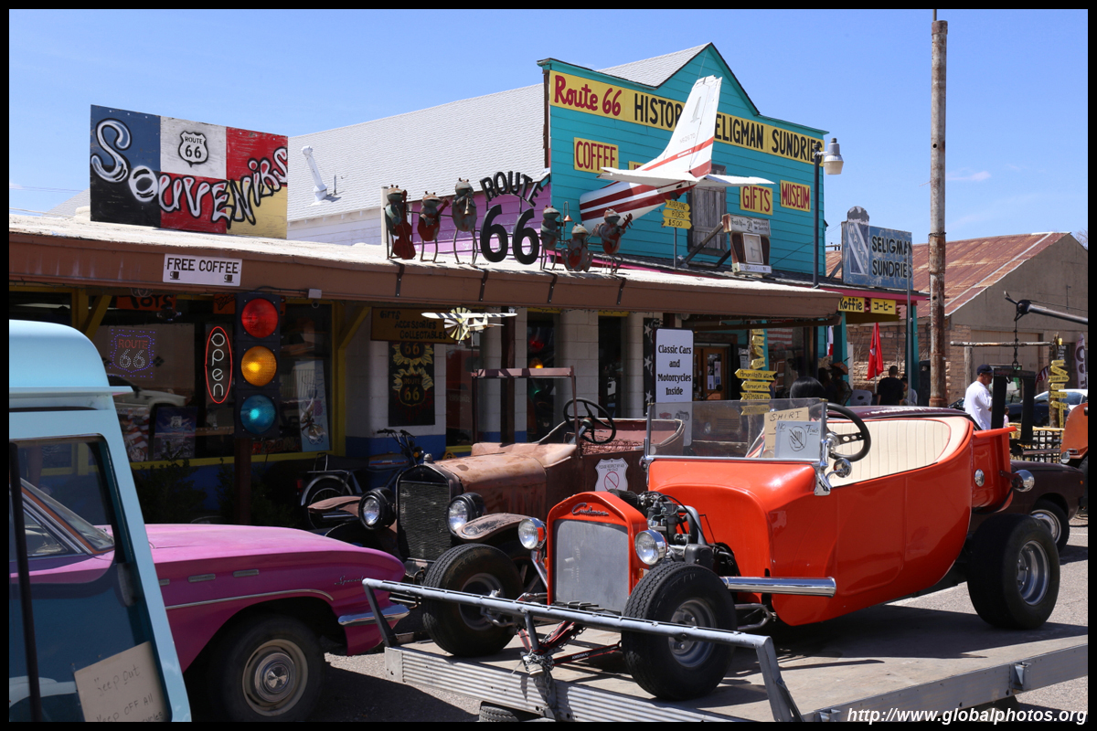 Route 66, or the Mother Road, is the first all-weather highway from Chicago to Los Angeles. Symbolizing hope, progress, adventure, and the automobile's impact on the country, the route reduced the driving distance by over 200 miles, and was the preferred route to head west. Seligman, Arizona celebrates this highway's history, and there were some spring flowers to throw in as a bonus. Originally a railroad town, it suffered badly when the Interstate opened in 1978, diverting traffic away from Route 66.