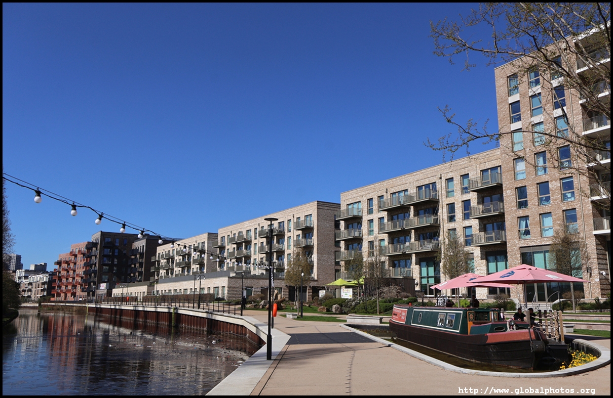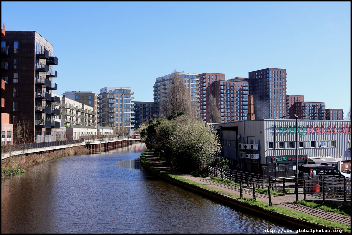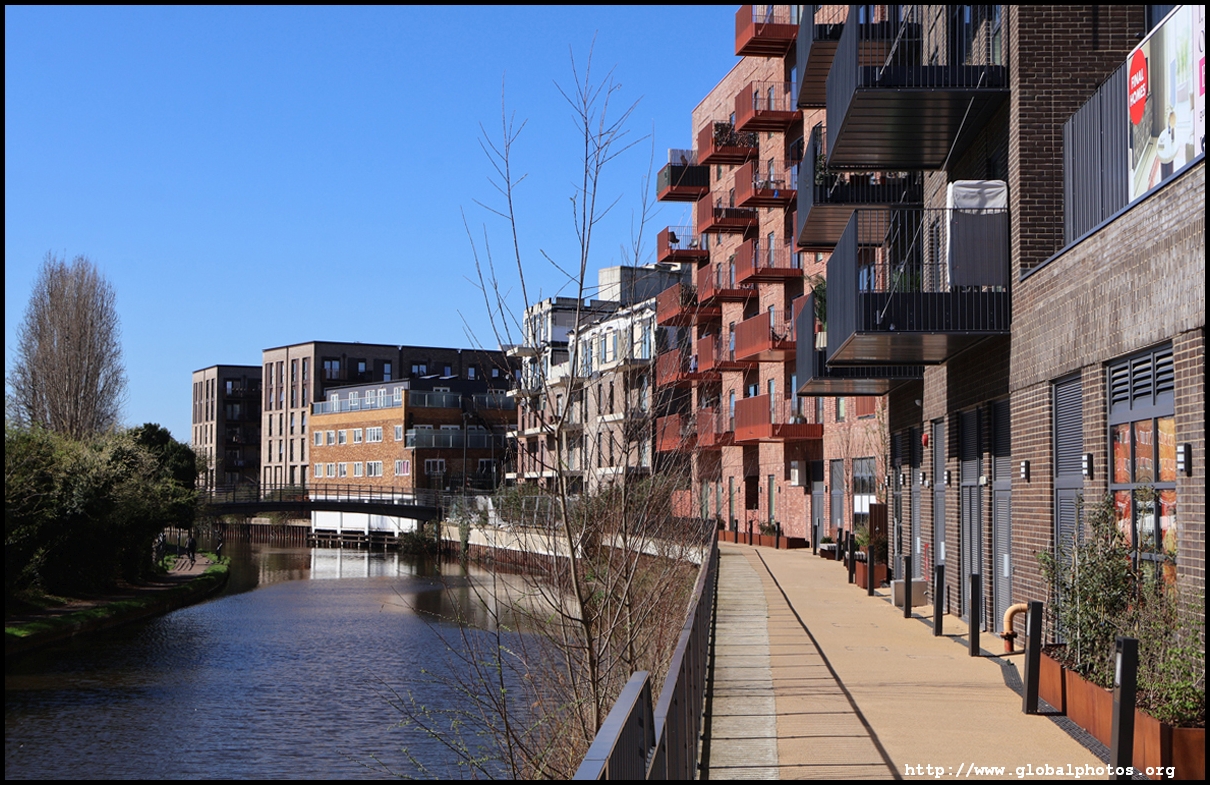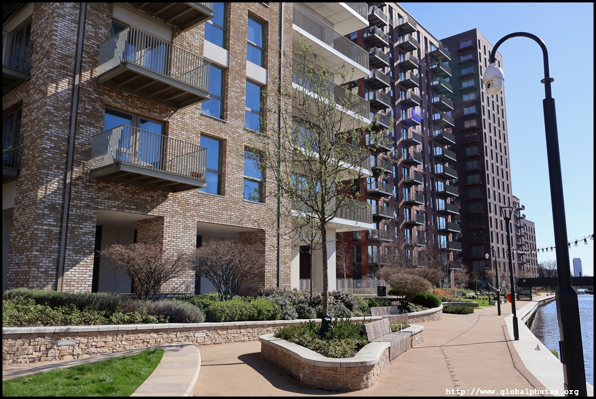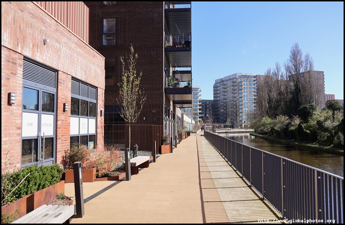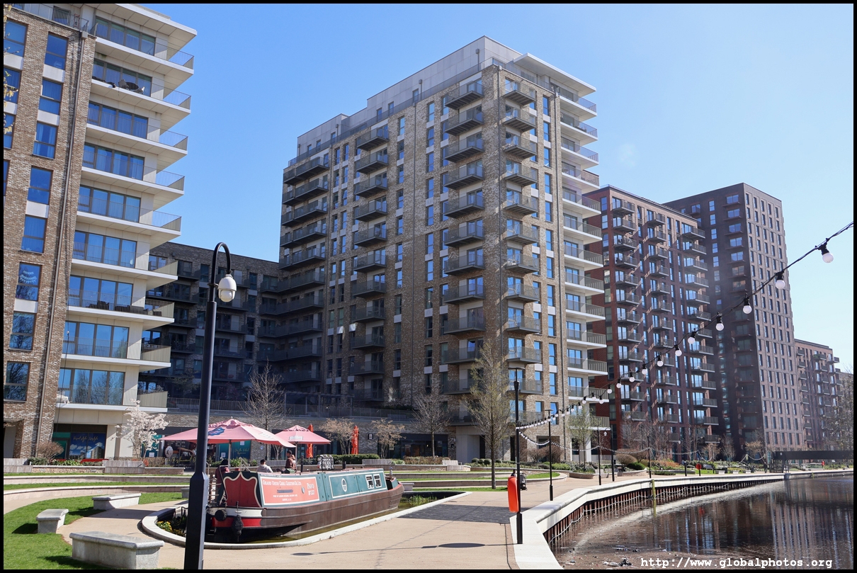 Across the canal, you face industrial buildings. This area is still fairly mixed use with pre-existing lowrises homes as well. It is a fairly long 10-minute walk to the nearest Tube station.