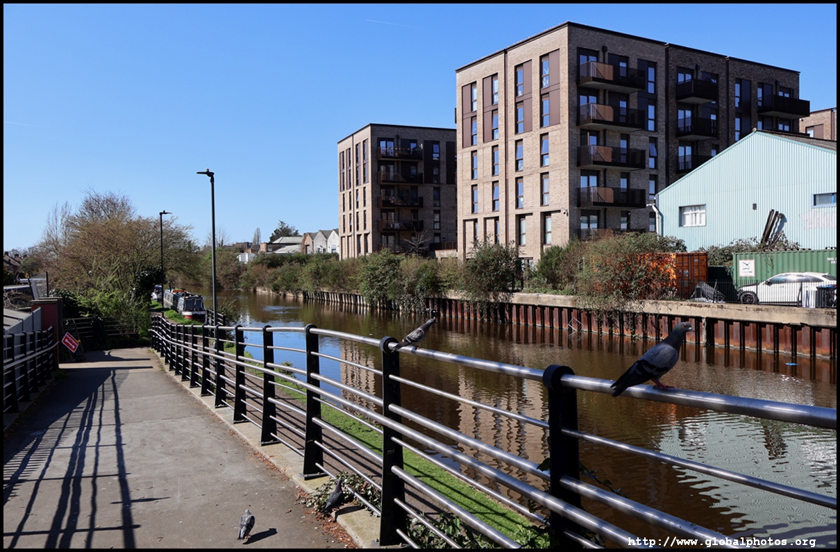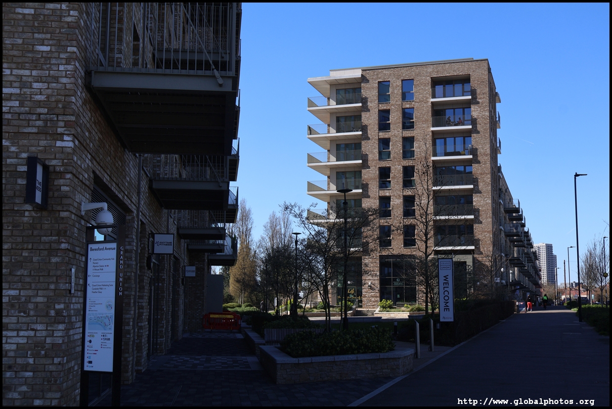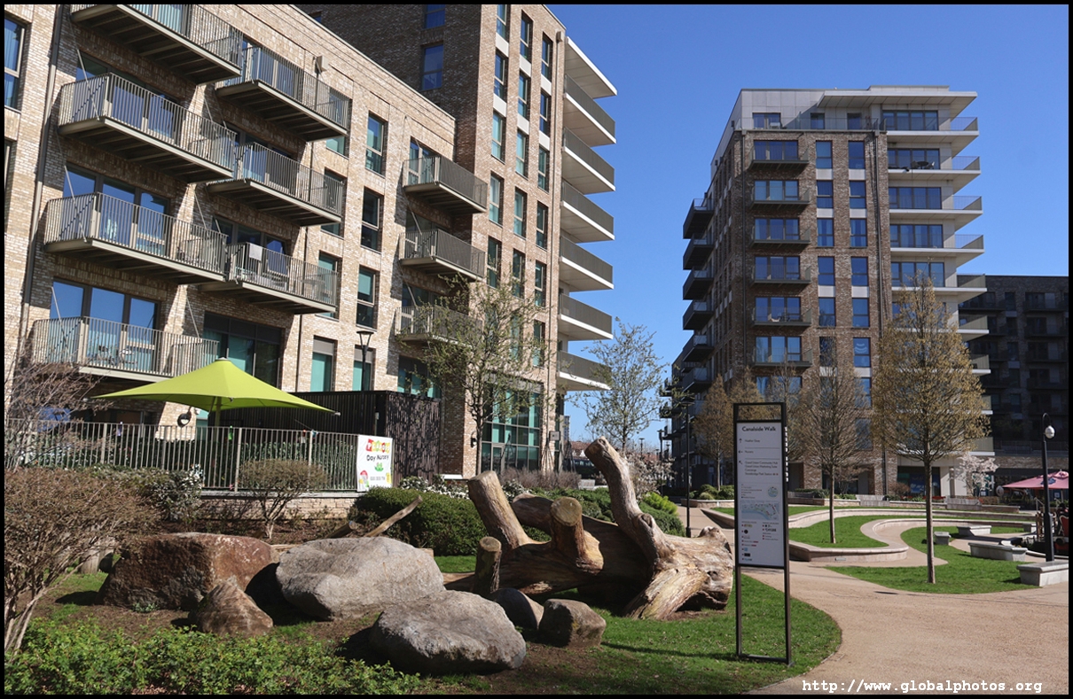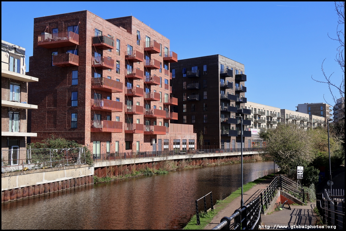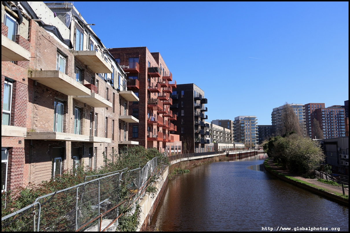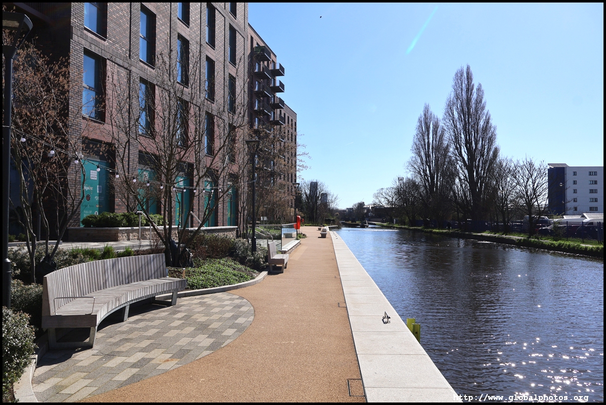 Across the canal, you face industrial buildings. This area is still fairly mixed use with pre-existing lowrises homes as well. It is a fairly long 10-minute walk to the nearest Tube station.