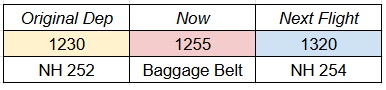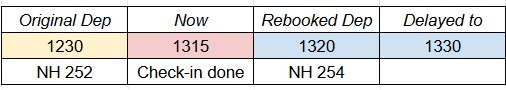 I stepped onto the air bridge and surprisingly saw a staff holding a tablet with Haneda on it. Apparently, she was there for me! I was the only one on this flight continuing to Tokyo and she used her tablet to translate she will get me onto the next available flight and to pick up my baggage at the belt. She spoke some broken English but with the tablet, communication was not an issue and she was quite friendly and nice, typical of customer service in Japan. At this point, I wasn't angry at all. I just wanted to get it all sorted and continue my way to Tokyo. I asked what time would I fly out and was given the NH 254 flight at 1:20pm. This would be a 50 minute delay from my original itinerary. However, it would be a nuisance to me since I need to drag my luggage out. A sign on the luggage belt indicated the first bags would spit out at 12:55pm, so I was curious how I could even make that 1:20pm flight if I need to exit land-side to re-check in and go back through security. The staff seemed confident it would all be OK, and updated me later that flight was delayed by 10 minutes.