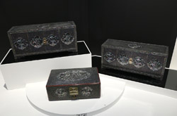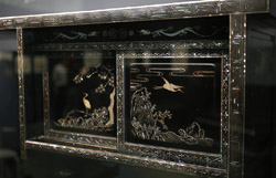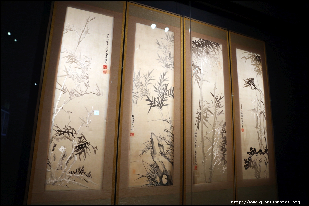 This 4-panel folding screen is painted with black and white bamboo mixed with various embroideries.