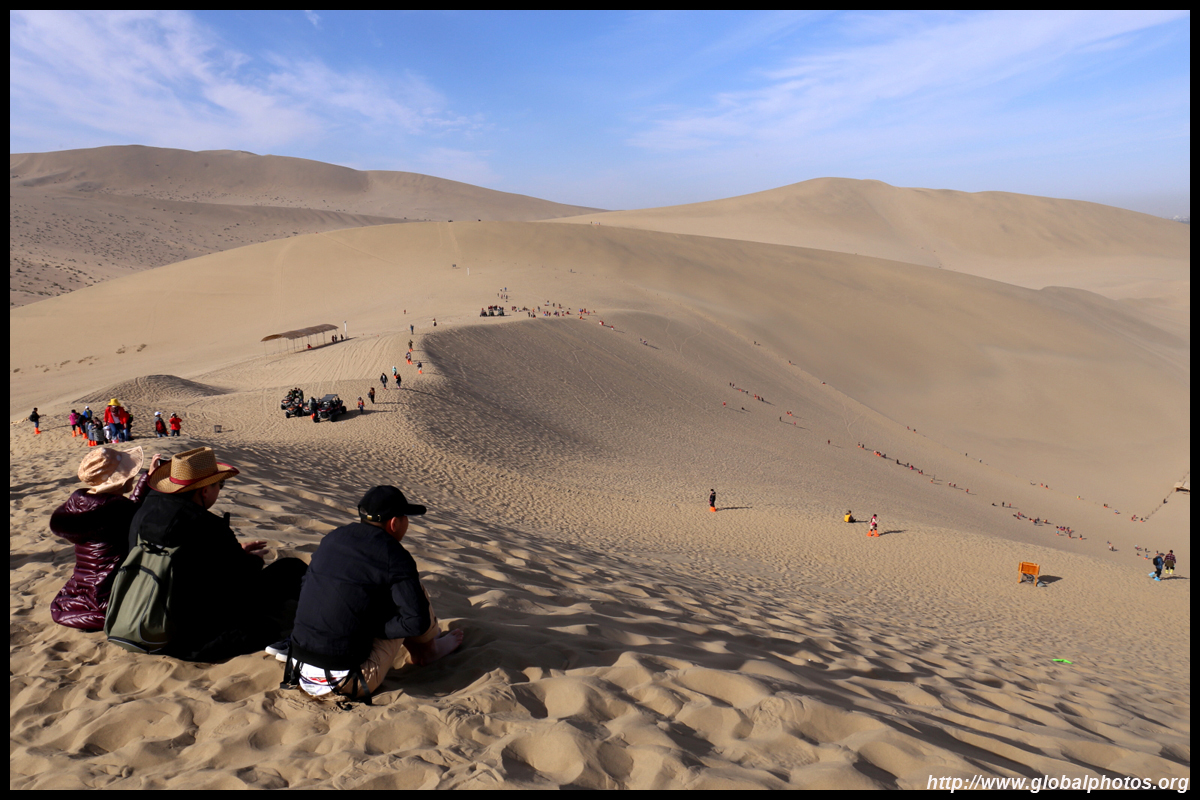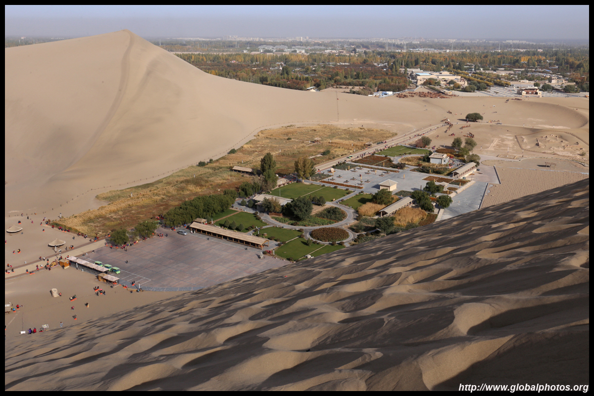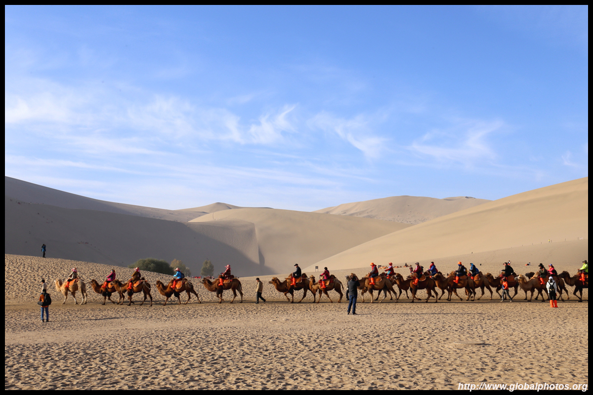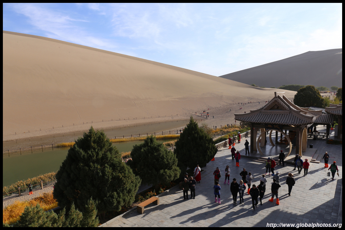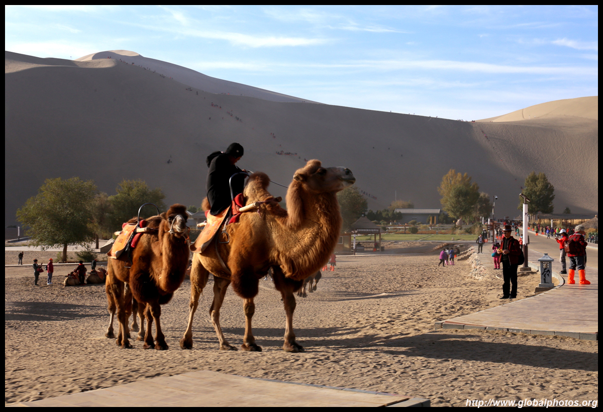Crescent Lake is an oasis in the middle of the desert just outside Dunhuang. Camels herd tourists from the visitor's centre to the site, but I opted for the shuttle bus instead. There were plenty of camels, and the guide mentioned each needs to be licensed.