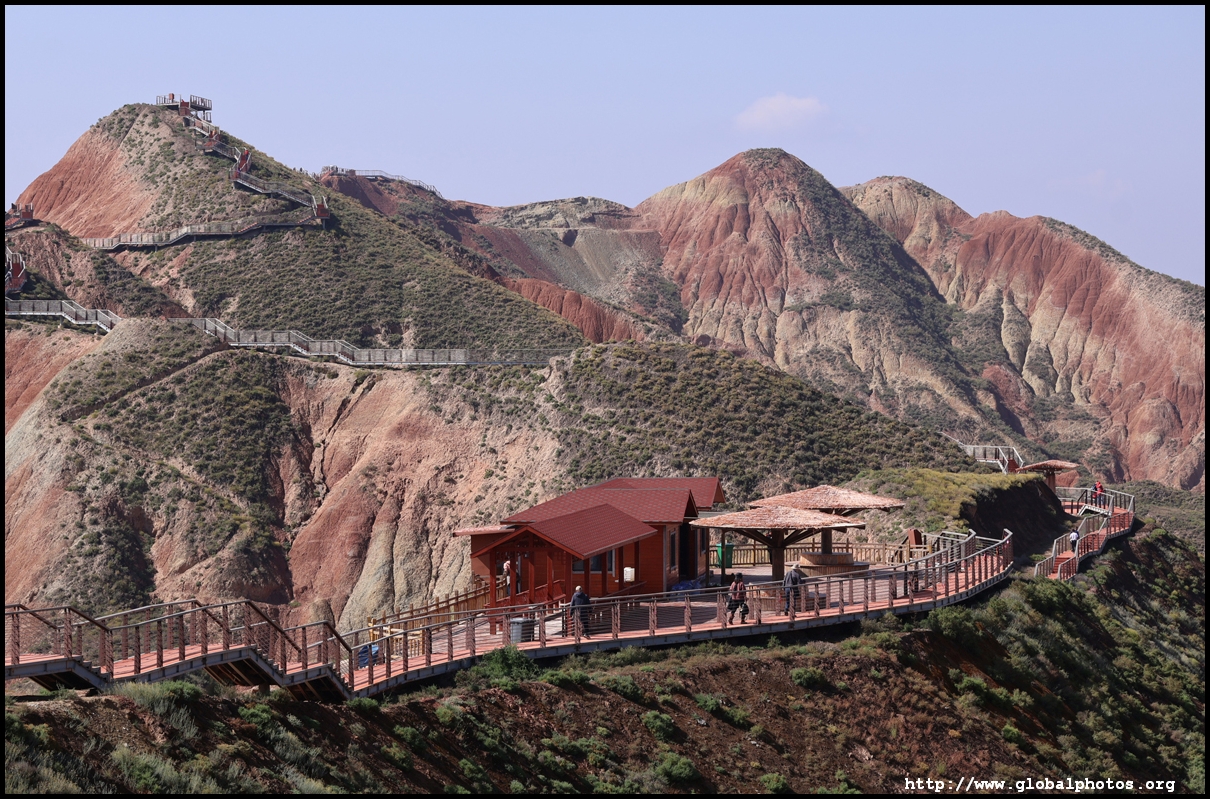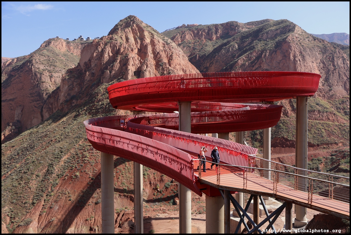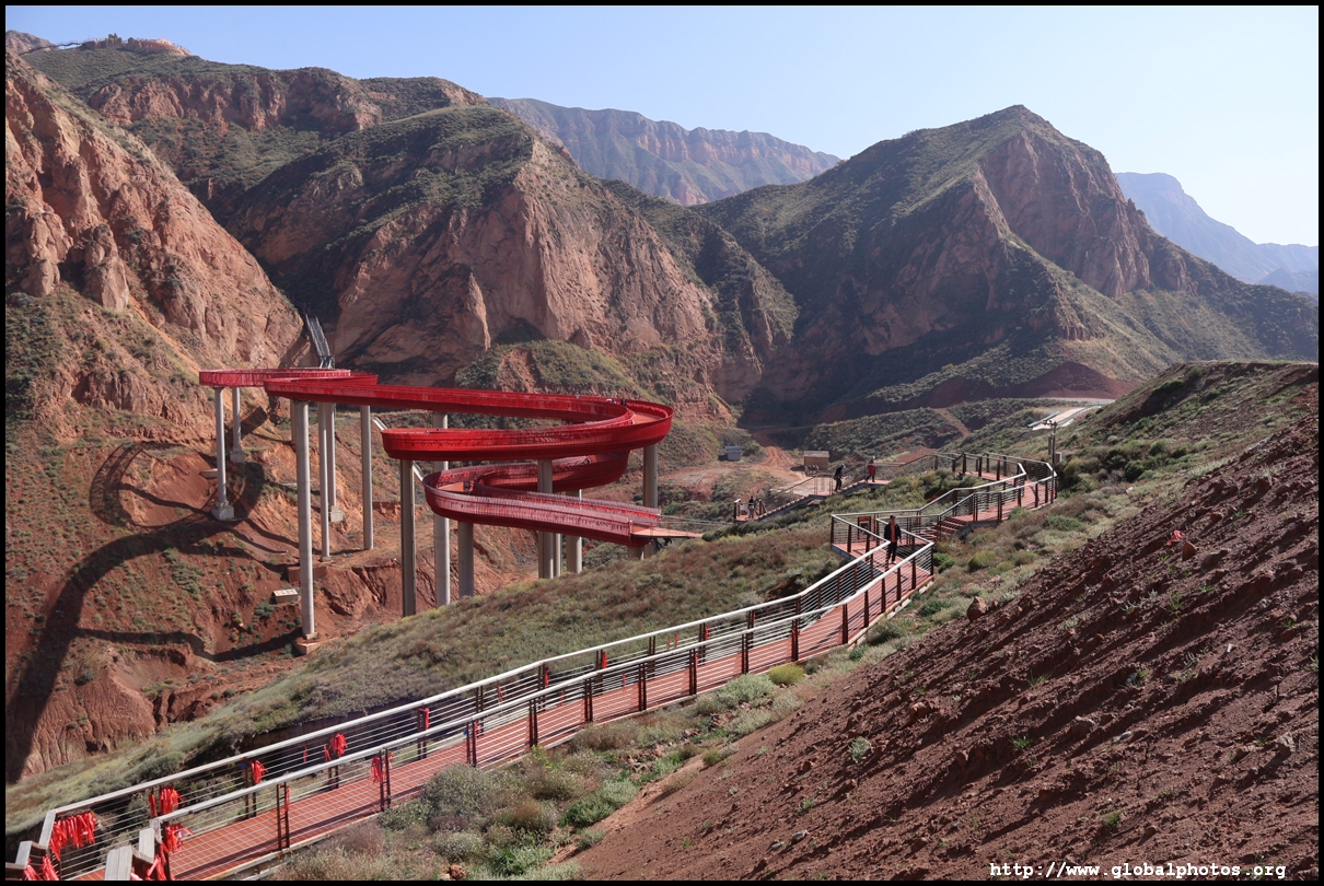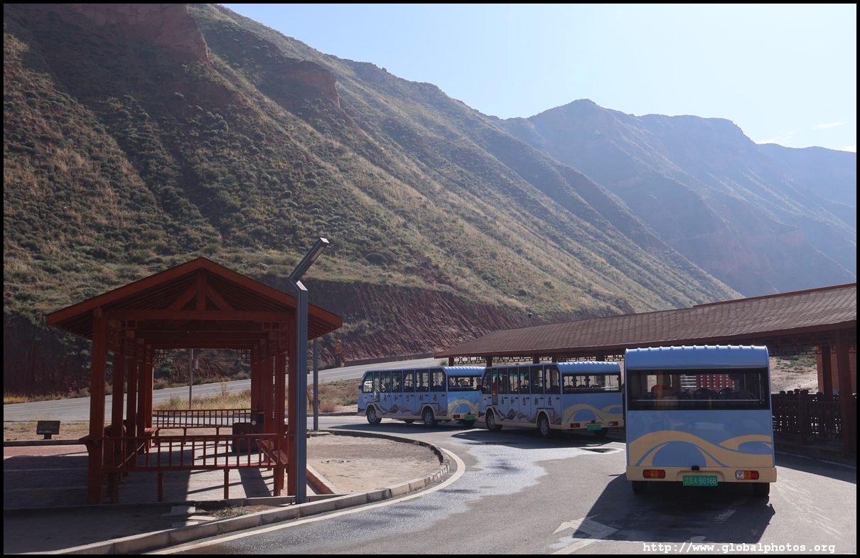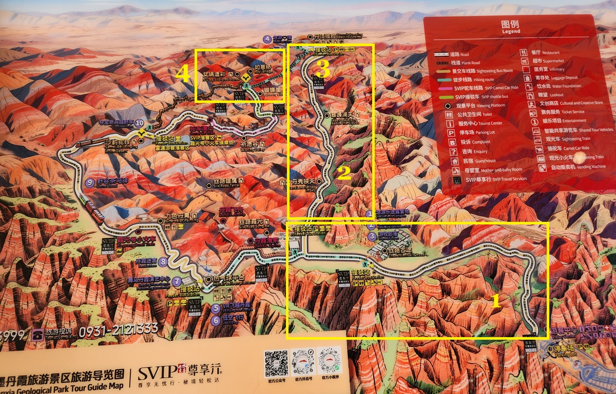 Just beyond Lanzhou's suburbs is a natural attraction well worth visiting. In fact, it was the main reason why I ended up including this city on the itinerary. Shuimo Danxia was formed about 150 million years ago during the Cretaceous and Tertiary periods. The red sandstone was eroded into the colourful mountain landscapes we see today.The site is vast but they have set up a lot of paths and routes so you will not be hiking in the wild. Prices vary with the most expensive SVIP ticket (288 yuan) including private transport so you can travel the entire loop in luxury. The standard fare (80 yuan) requires you to change various types of transport and there are gaps in between where you need to walk, and you won't be able to see the full loop with a large section of the park not reachable at all. Even with the cheaper standard ticket, I doubt you can see all that is available on a ticket in a full day either as the hiking paths are long and you have to backtrack to catch the transport out. After the initial coach ride (#1), you need to walk about 10 minutes down the road to the next intersection. On the right side, there are smaller train-like buses (#2) that will go uphill on the narrow road to the observation point (#3) and starting point for the long hike (#4).