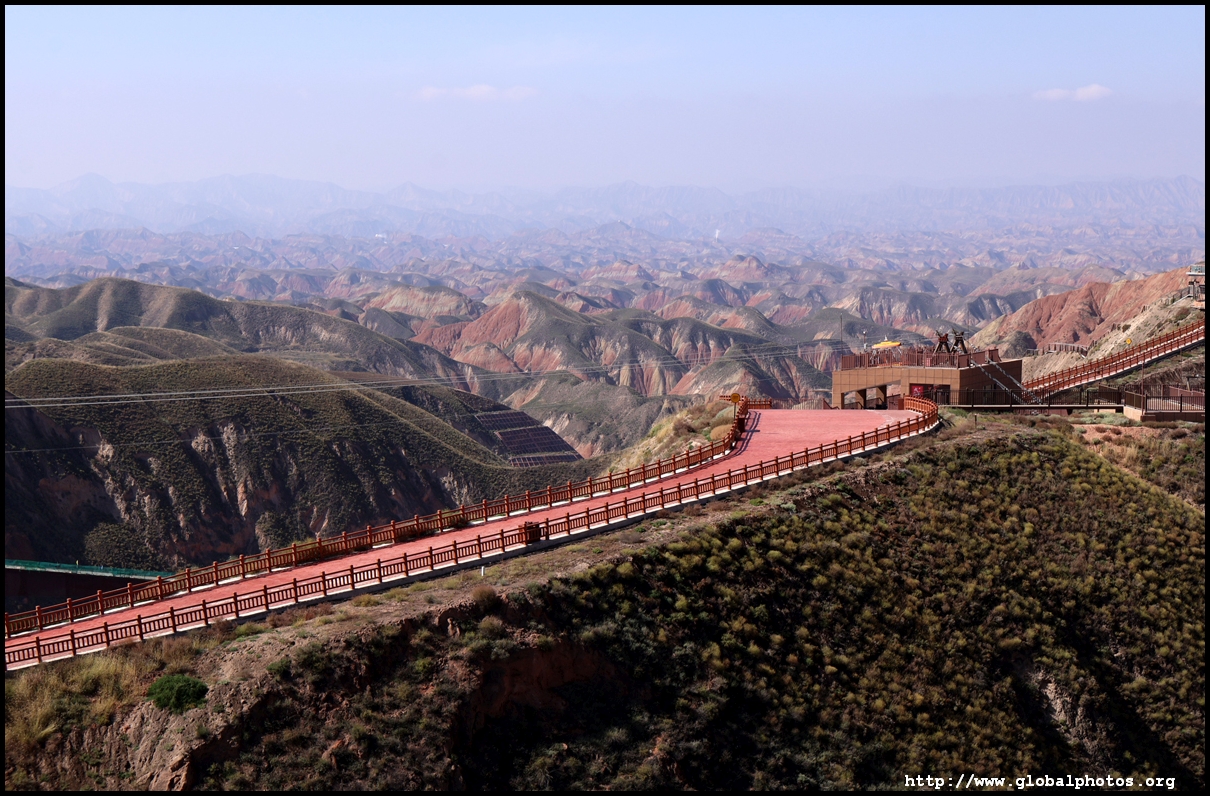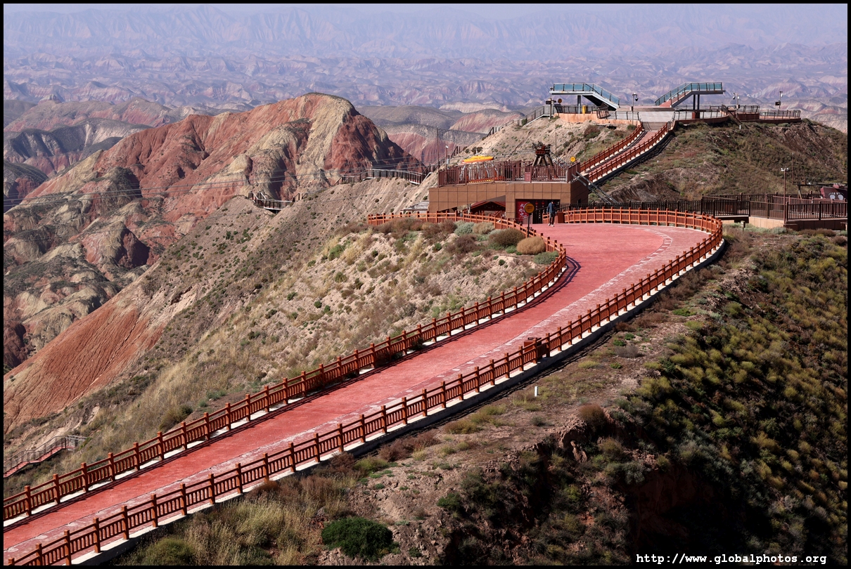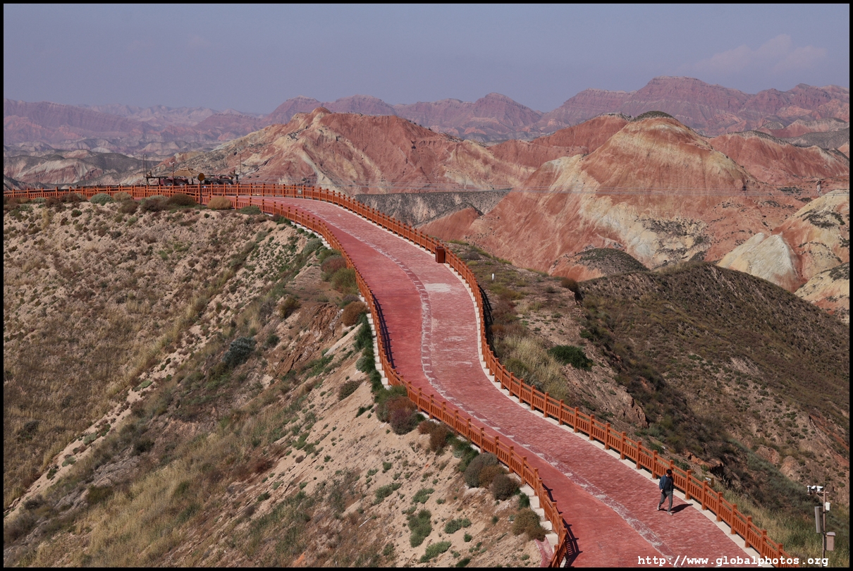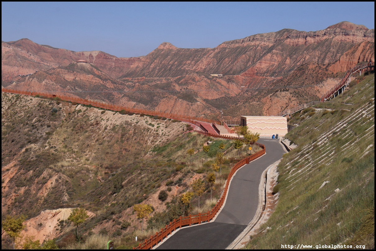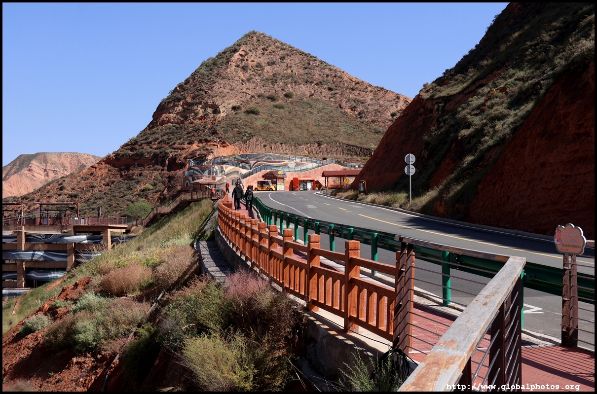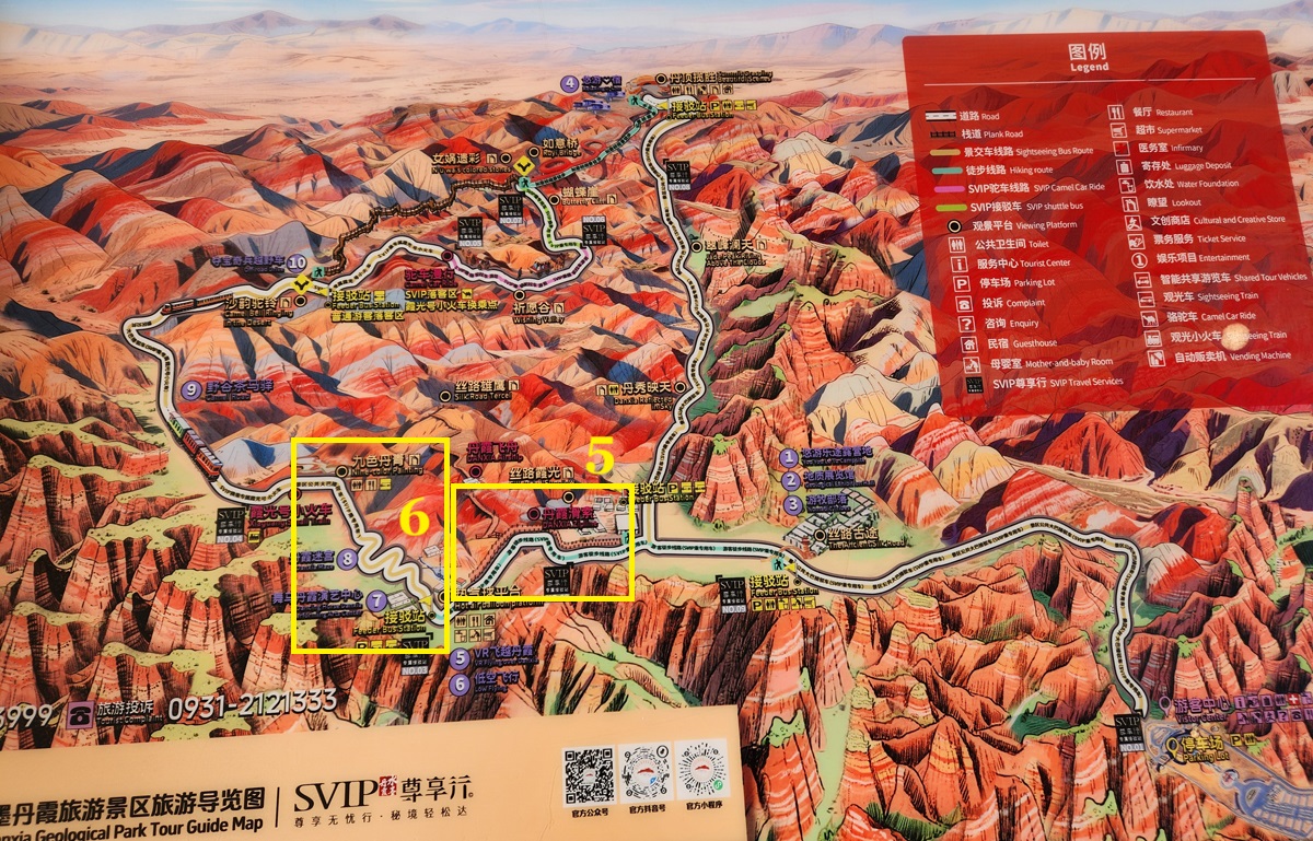 Just beyond Lanzhou's suburbs is a natural attraction well worth visiting. In fact, it was the main reason why I ended up including this city on the itinerary. Shuimo Danxia was formed about 150 million years ago during the Cretaceous and Tertiary periods. The red sandstone was eroded into the colourful mountain landscapes we see today.The site is vast but they have set up a lot of paths and routes so you will not be hiking in the wild. Prices vary with the most expensive SVIP ticket (288 yuan) including private transport so you can travel the entire loop in luxury. The standard fare (80 yuan) requires you to change various types of transport and there are gaps in between where you need to walk, and you won't be able to see the full loop with a large section of the park not reachable at all. Even with the cheaper standard ticket, I doubt you can see all that is available on a ticket in a full day either as the hiking paths are long and you have to backtrack to catch the transport out. After exploring the upper section of the park, I returned back the way I came. From the end of the train-like bus, take a 20 minute walk to your right (#5) along a scenic road to reach the shuttle bus to the next viewpoint (#6). There are small vehicles you can rent to save the walk if you are on a standard ticket, but I suggest walking as the scenery is breathtaking. You get a very wide view of the colourful mountains and the perspective is a bit different.