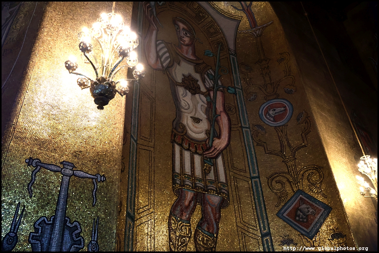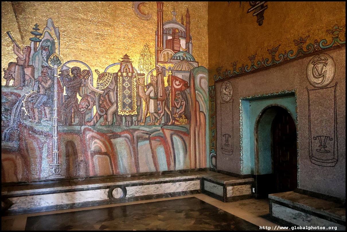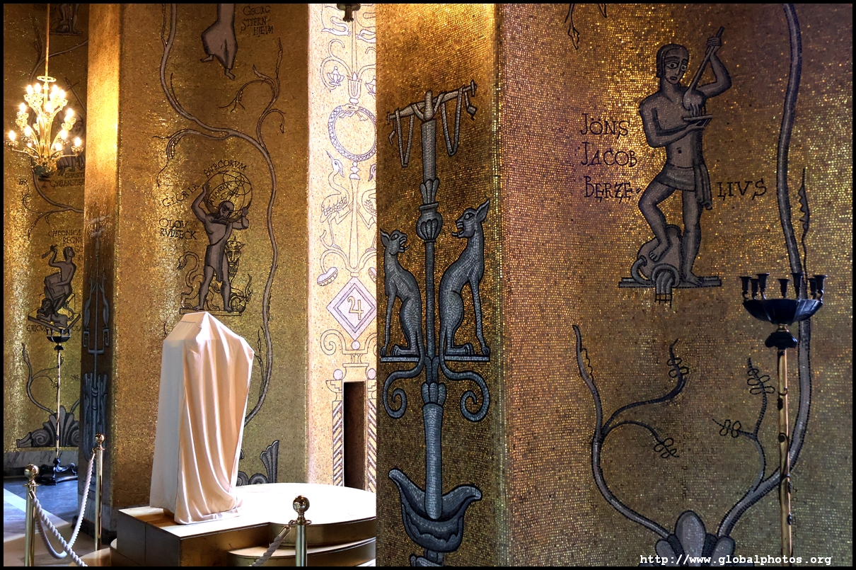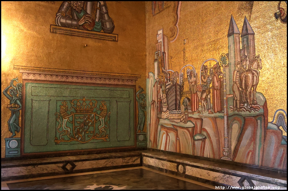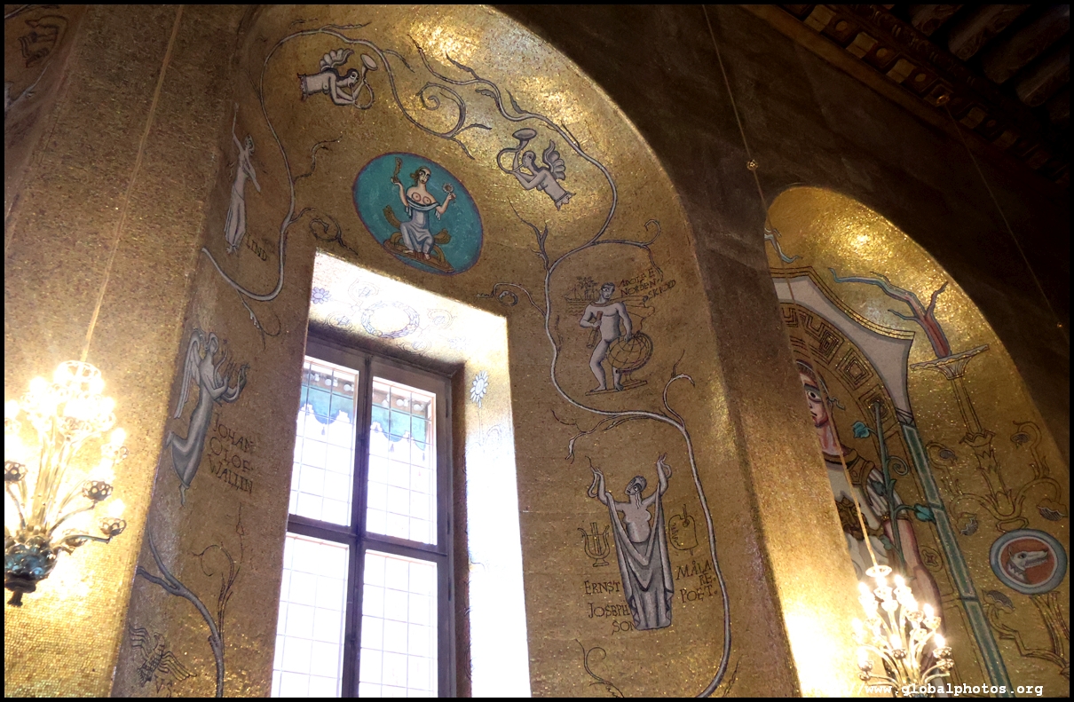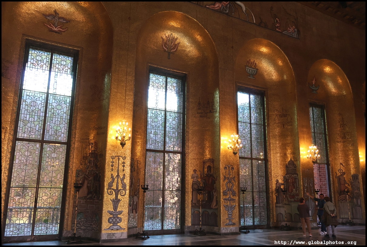The Golden Hall glitters from its wall mosaics that comprise 18.6 million pieces of glass and gold created by Einar Forseth that showcase Sweden's history. At the front is the Queen of Lake Malaren, Stockholm's human form. Following the Nobel banquet downstairs, guests would come here for the dance.