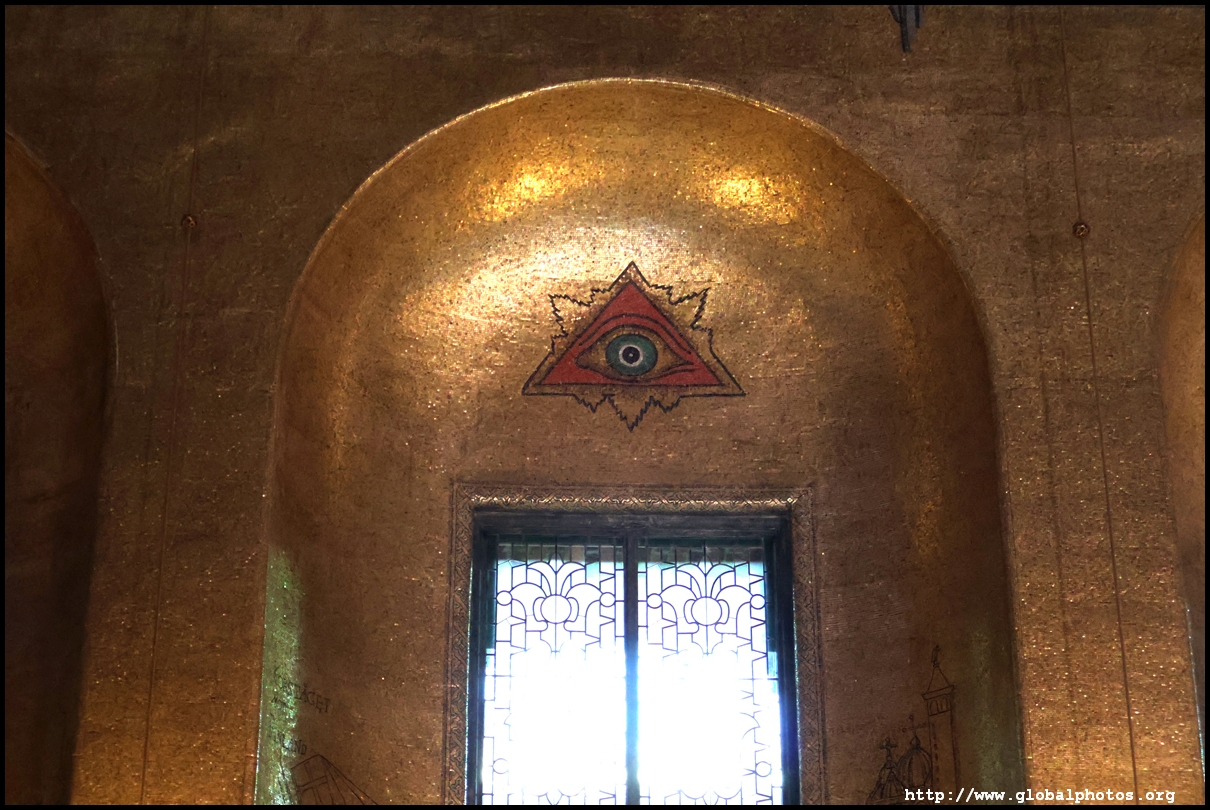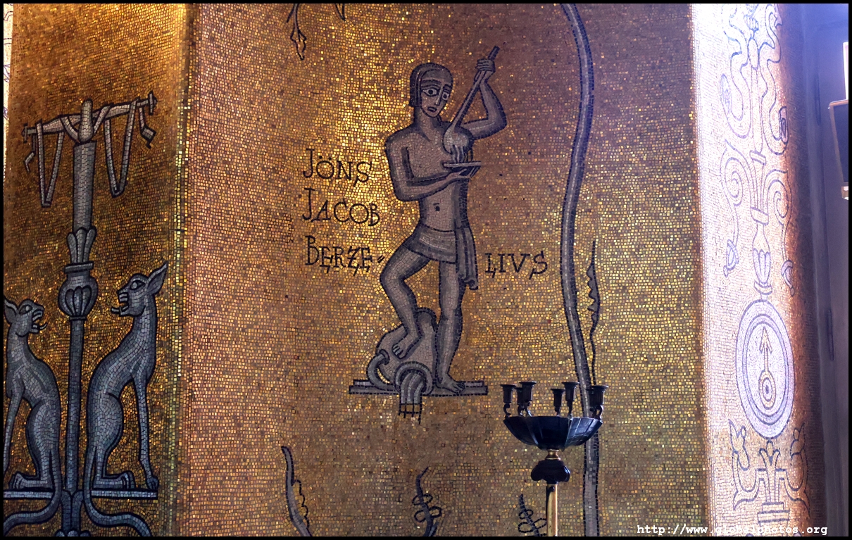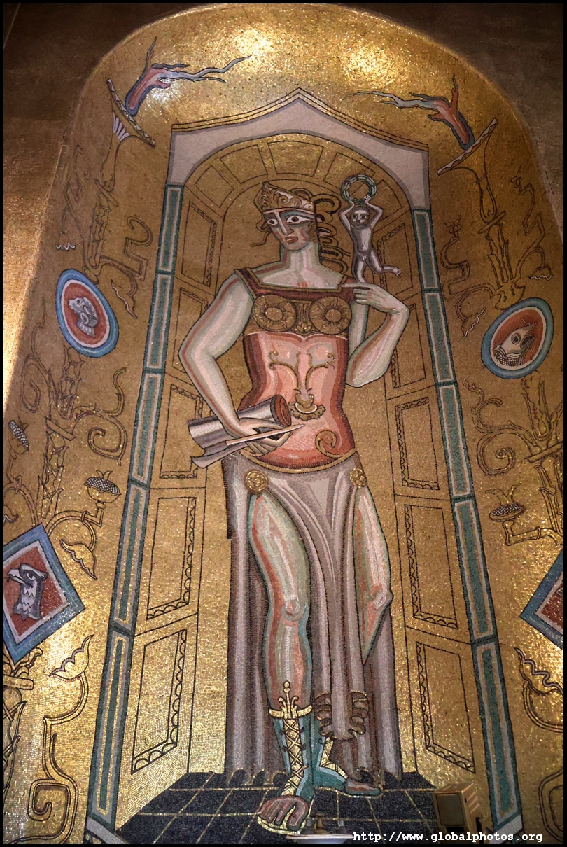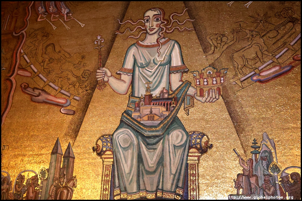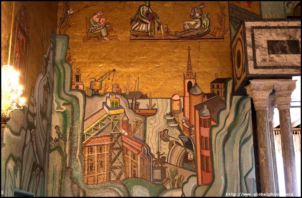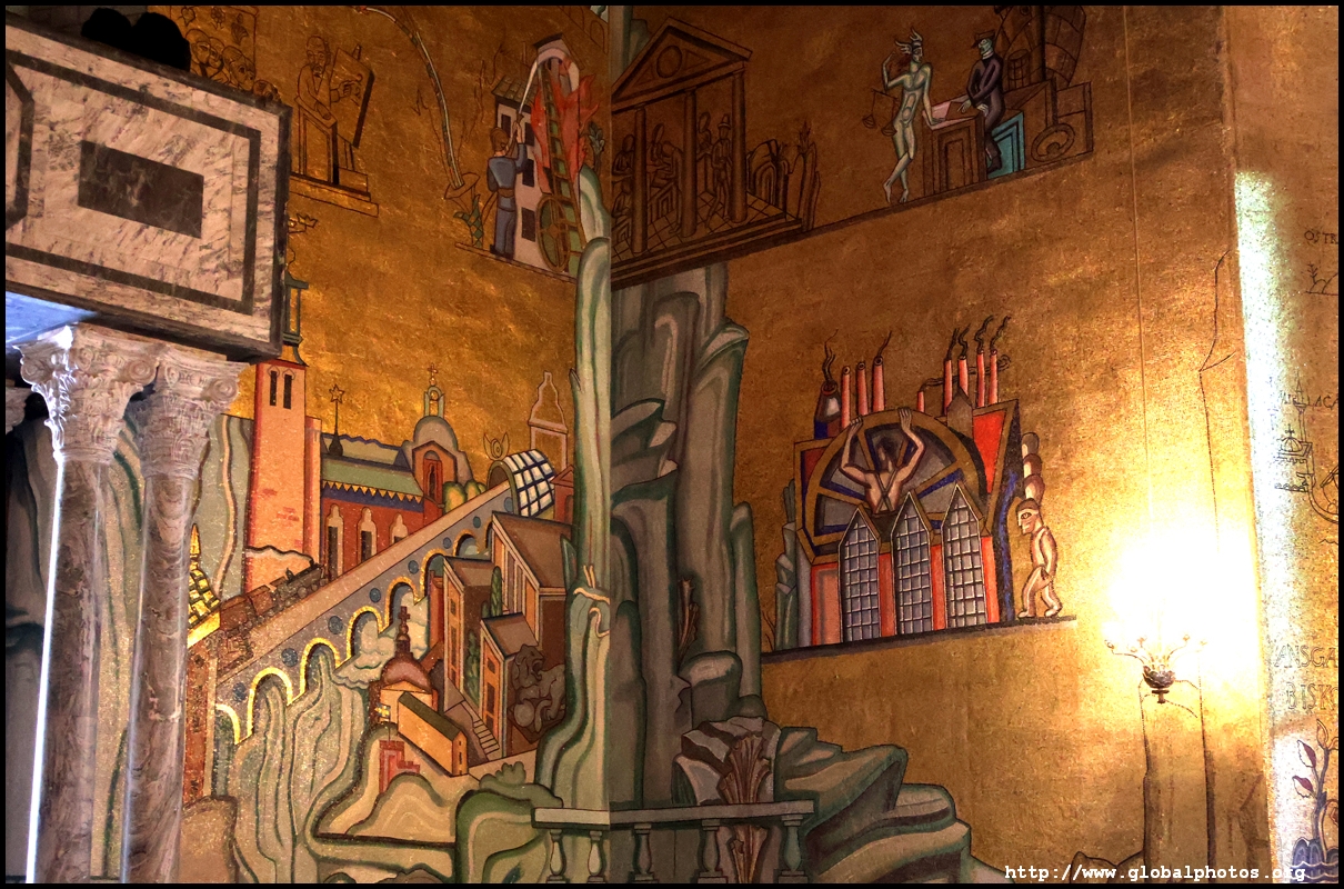 The Golden Hall glitters from its wall mosaics that comprise 18.6 million pieces of glass and gold created by Einar Forseth that showcase Sweden's history. At the front is the Queen of Lake Malaren, Stockholm's human form. Following the Nobel banquet downstairs, guests would come here for the dance.