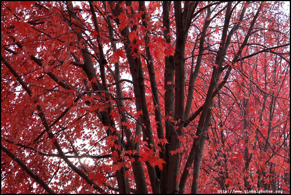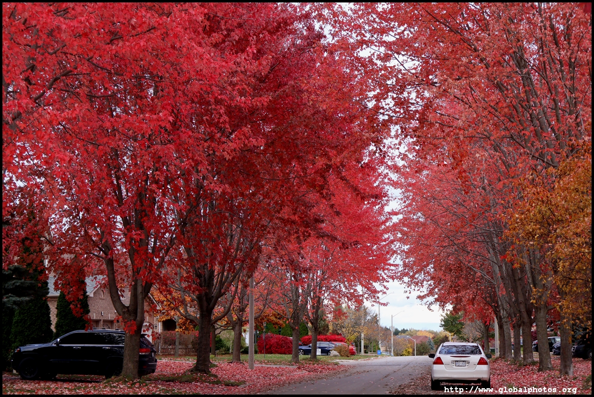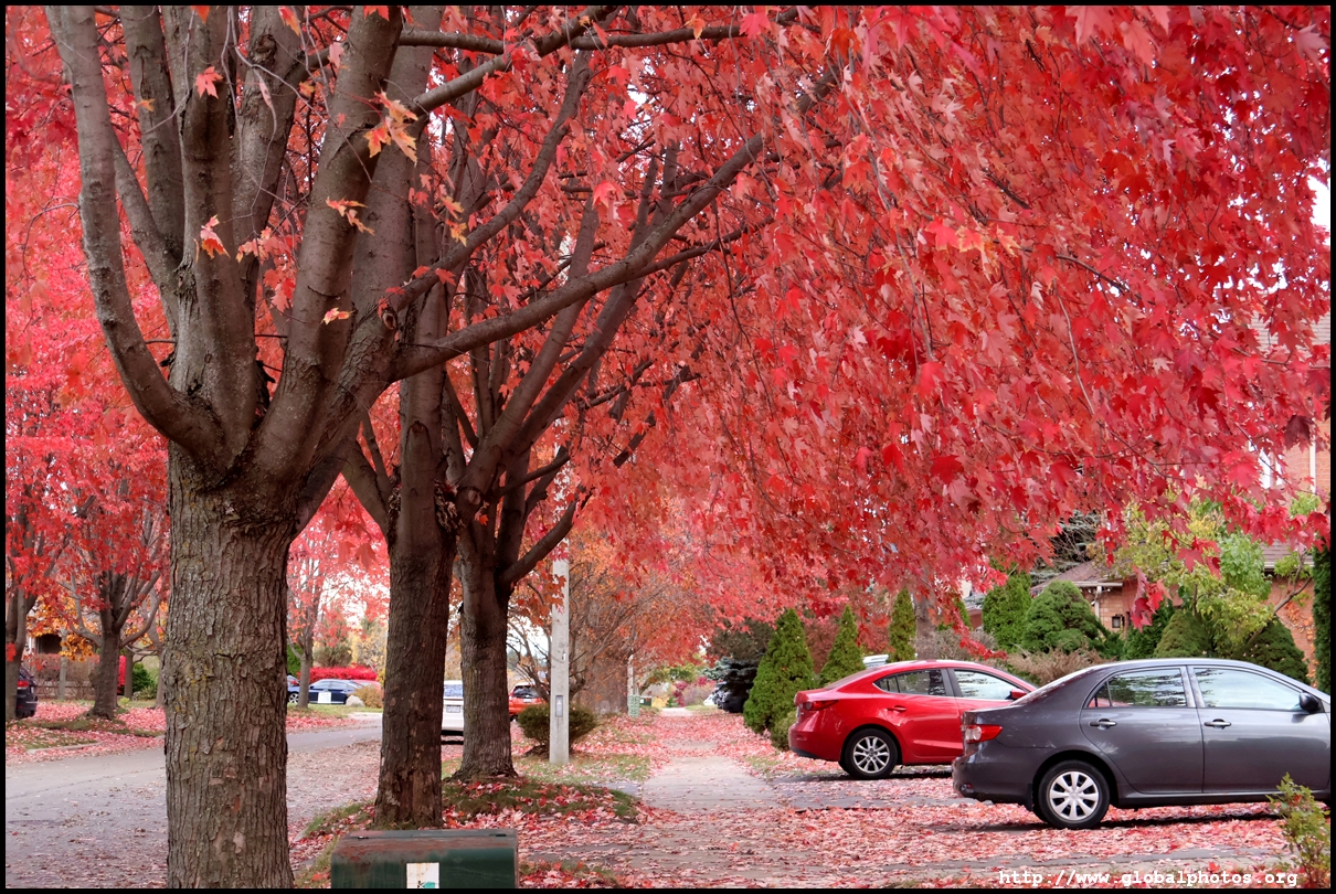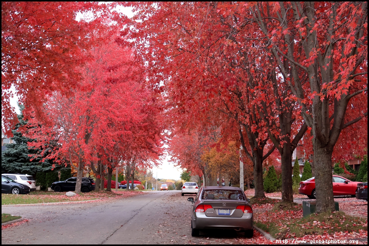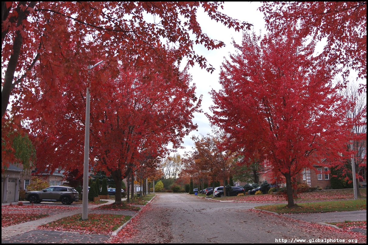 On a quiet residential side street just south of 19th Avenue near Yonge Street in Richmond Hill stands a long line of firery red maples still in their peak just after Halloween.